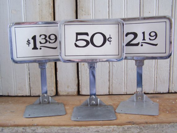 A lot of people hate to ask for prices (I’m one of them). Don’t lose customers over a trivial inconvenience! Display your prices clearly. You have a few options: You can display one easy-to-read price list, or group your products into price categories and display a price for each category, or label each item individually with hang tags or stickers. It’s up to you. All my products are the same four or five prices, so I hang a price menu in a few places around my booth. Most importantly, if you display your prices on signage, make sure the sign is clear and easy to read, like these vintage store price displays by Roaming Yankees on Etsy.