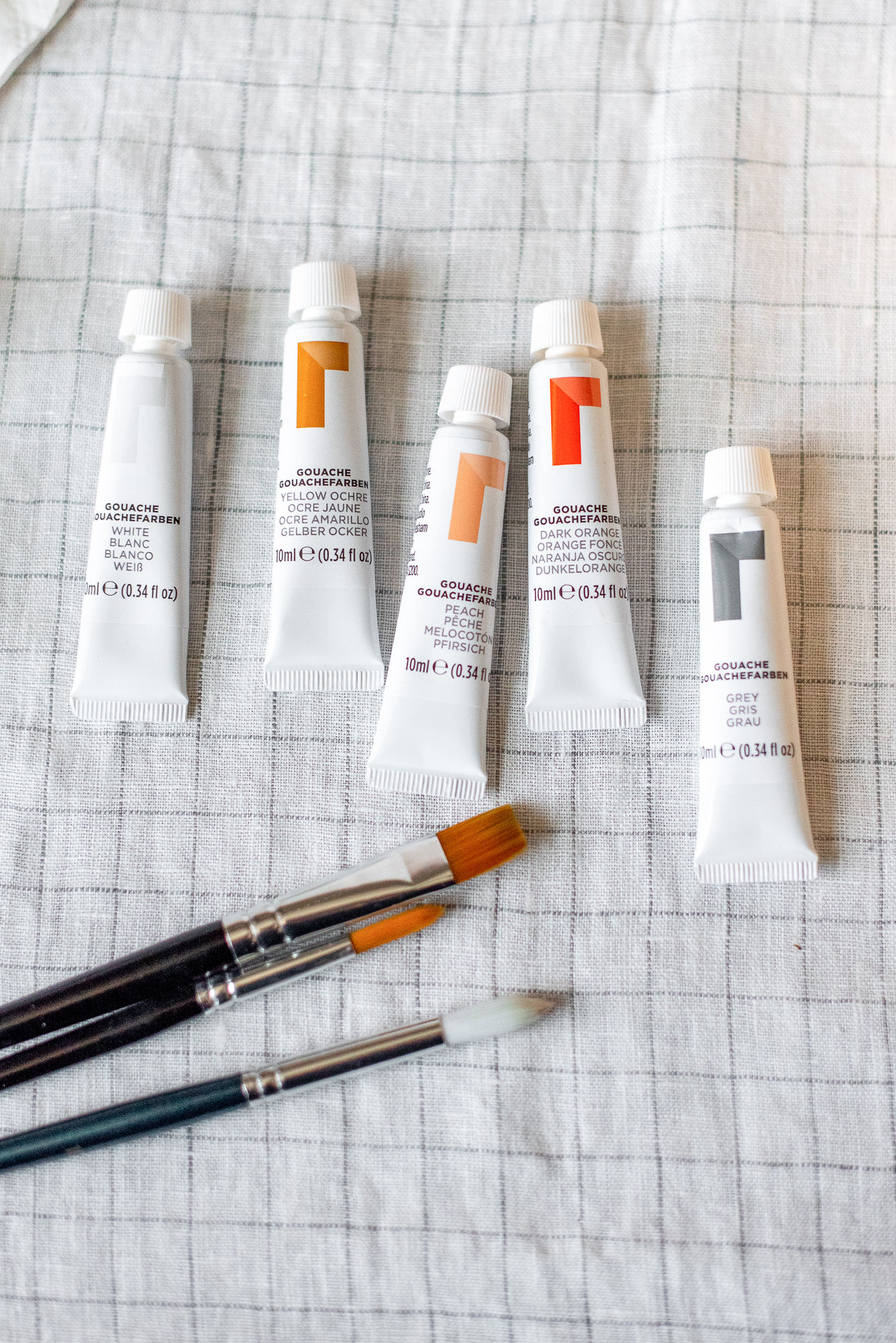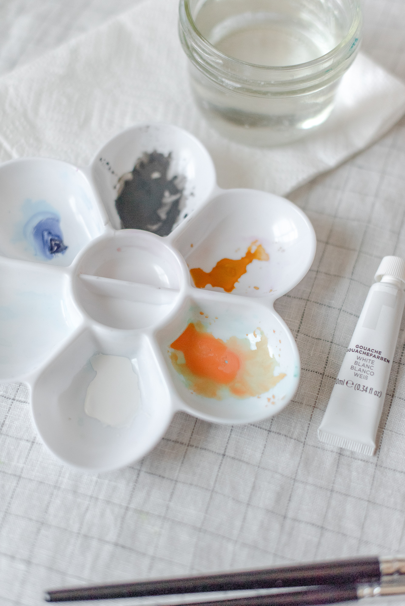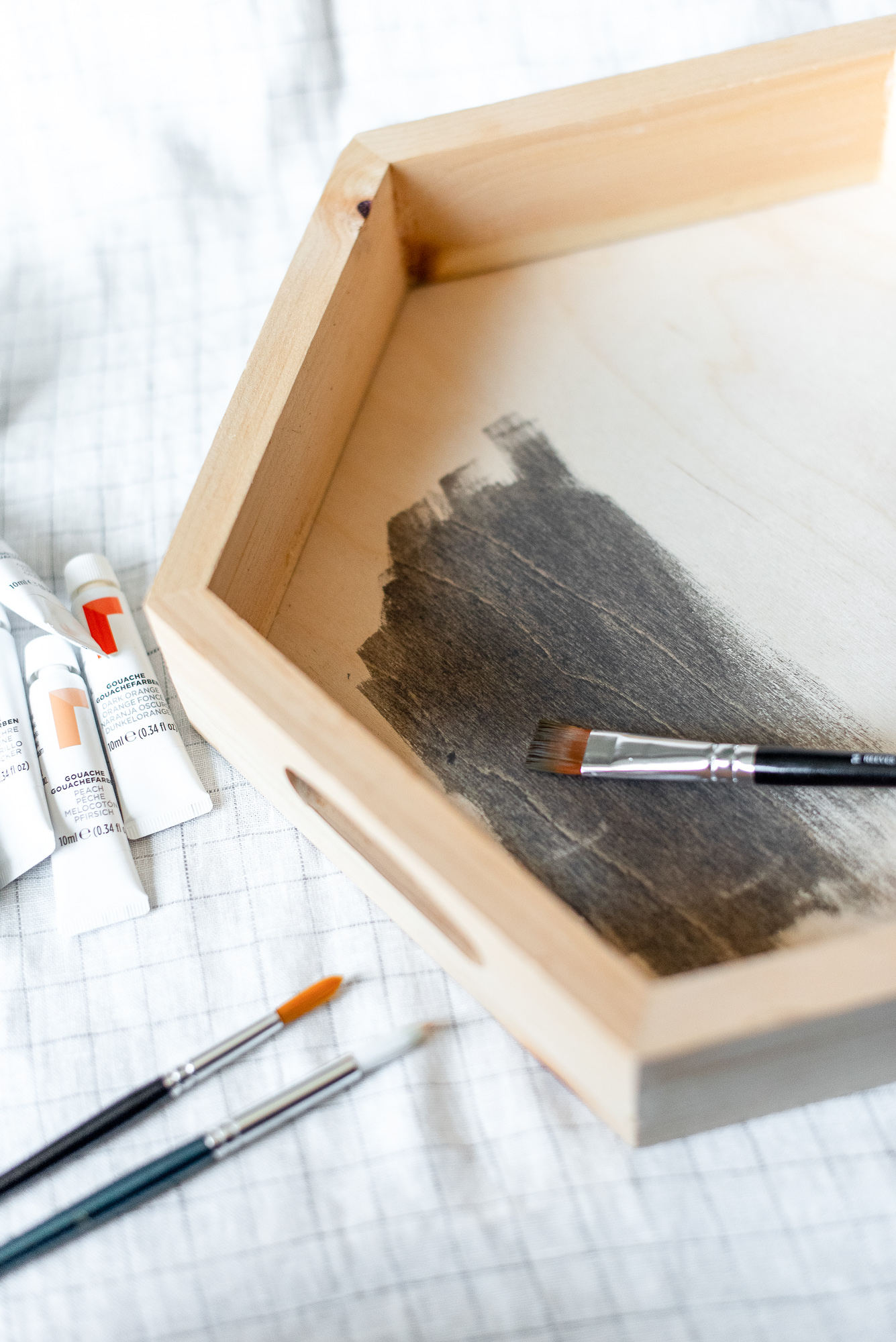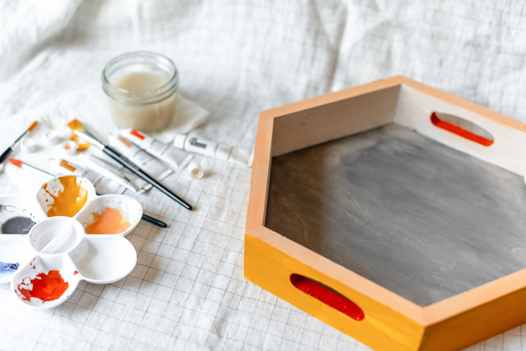 1. Choose your color palette. I went with Gray, White, Medium Yellow, Peach & Dark Orange. Squeeze a bit of paint in each well of your palette & add enough water to get the consistency you’re looking for. I wanted my color to be a bit more opaque than just a color wash so I used less water. I started with the tray since it was bigger and would take longer to dry. I decided to color block the tray and to free form paint the coasters since I was going for a mix of geometric & random patterns. Let everything completely dry and try to keep your kitty out of your paint water (ha ha!).