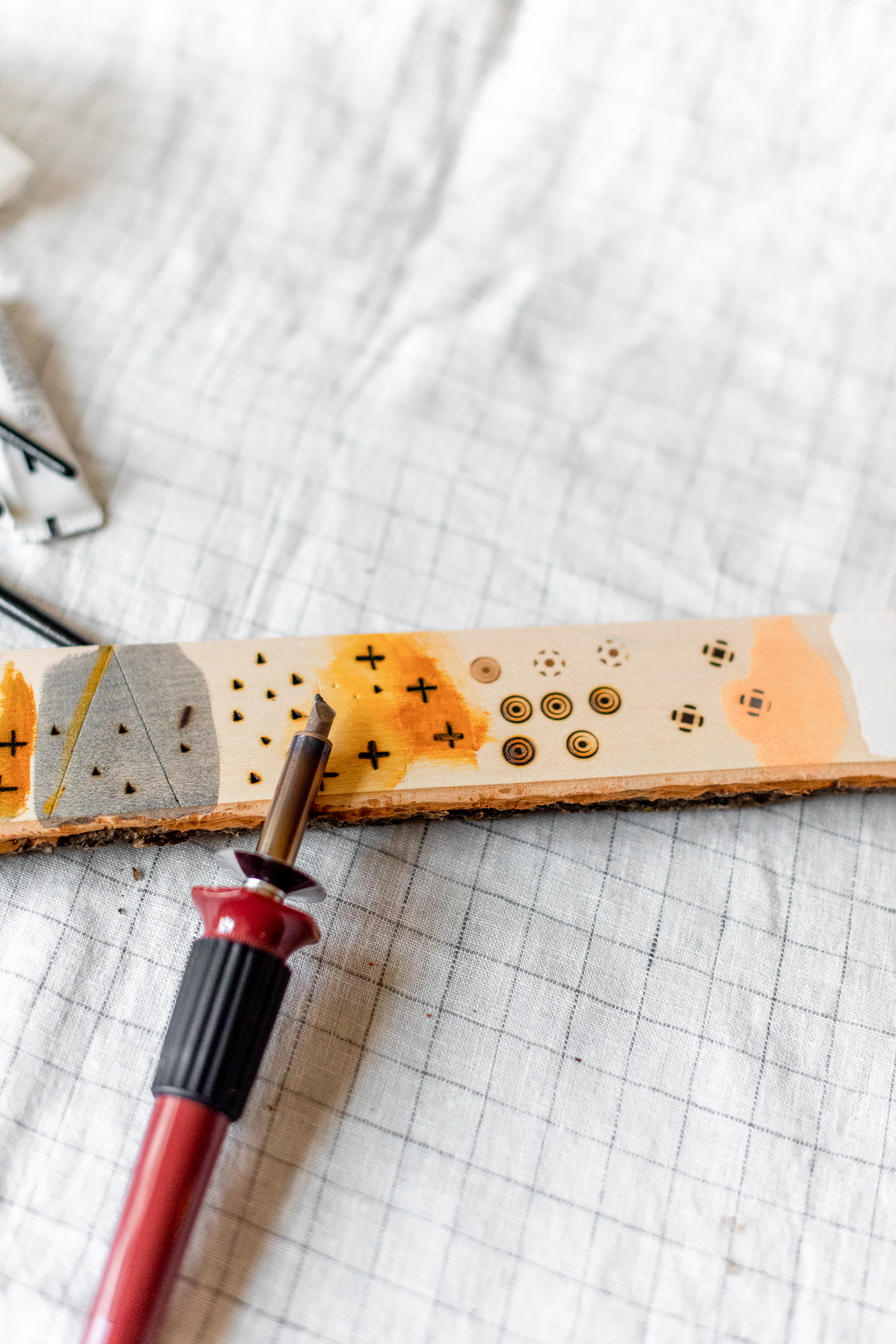 4. For the tray I decided to only burn into the top part of it since I think that’s the area that is most eye catching anyway. I wanted to tie it in a bit with the coasters so you’ll know it’s a set but wanted it to be slightly different. I really fell in love with how those little triangles turned out so I decided to use the same method as the coasters for those. For the lines, I used the universal tool as well, instead of holding the flat part down in one spot, I started at an edge and slowly dragged it down to make the line. I wanted my lines to look imperfect but if you want them completely straight I would suggest using a ruler and a pencil.