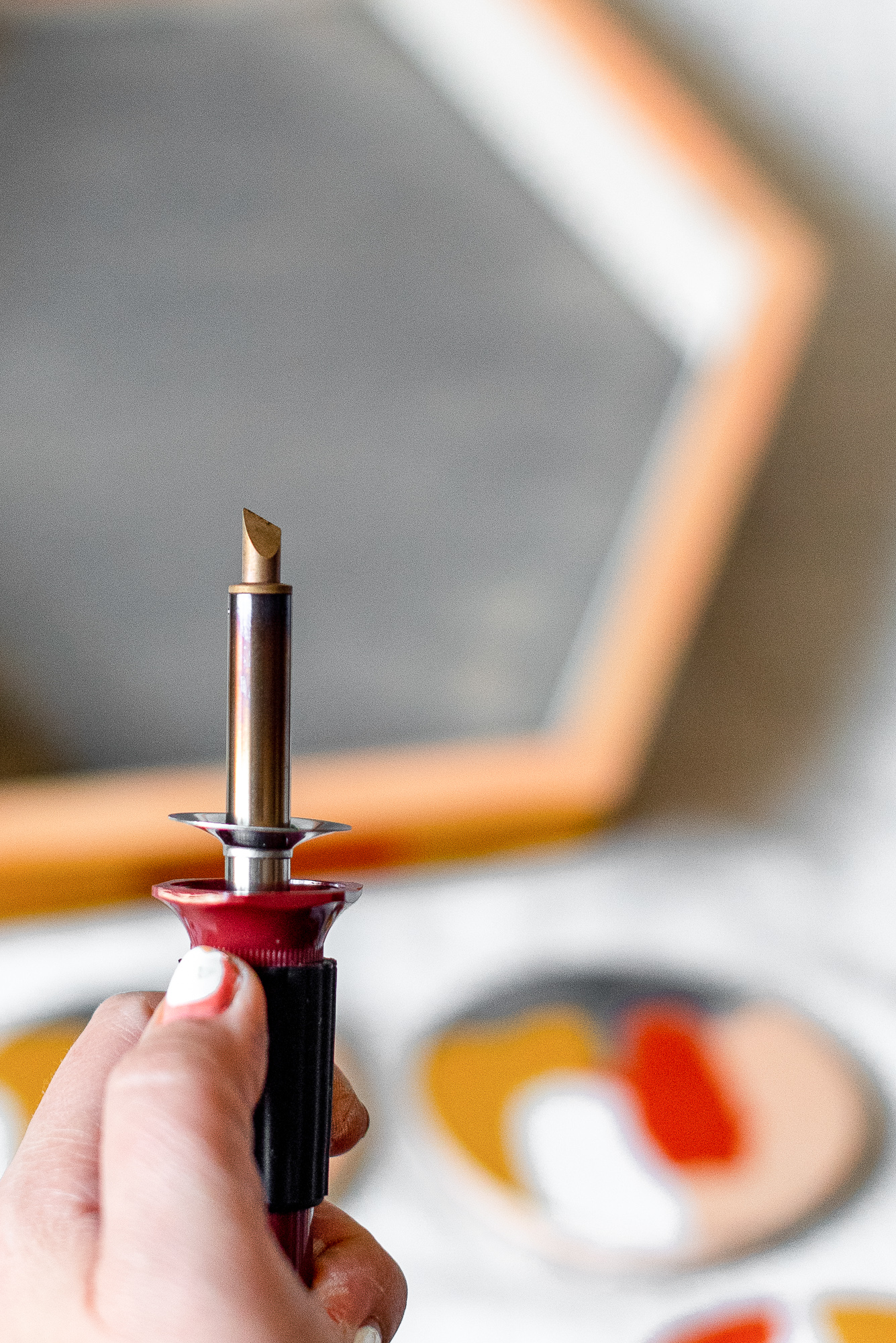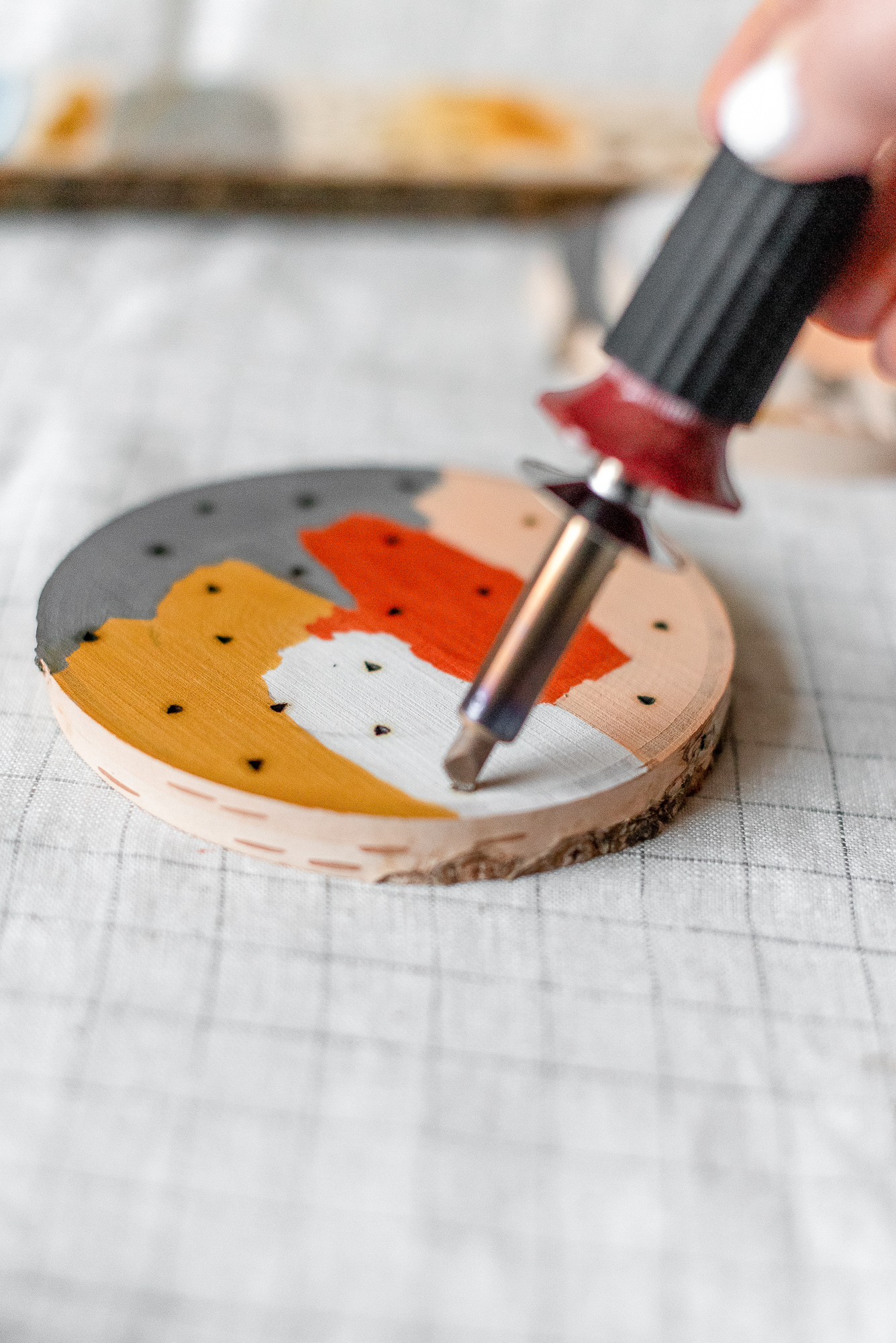 2. Before I started wood burning on the actual coasters and tray I did a practice run on a scrap piece of wood (you could also use the underside of your project if you aren’t giving it as a gift and don’t mind). Wood burning has a bit of a learning curve as far as how long it will take to get the effect you want (longer than you think in most cases). Since I am also a beginner I wanted to keep this project easy & accessible. I used the universal point tip and one of the stamps from the kit, but I played around with a few of the tips until I found the look I was going for.