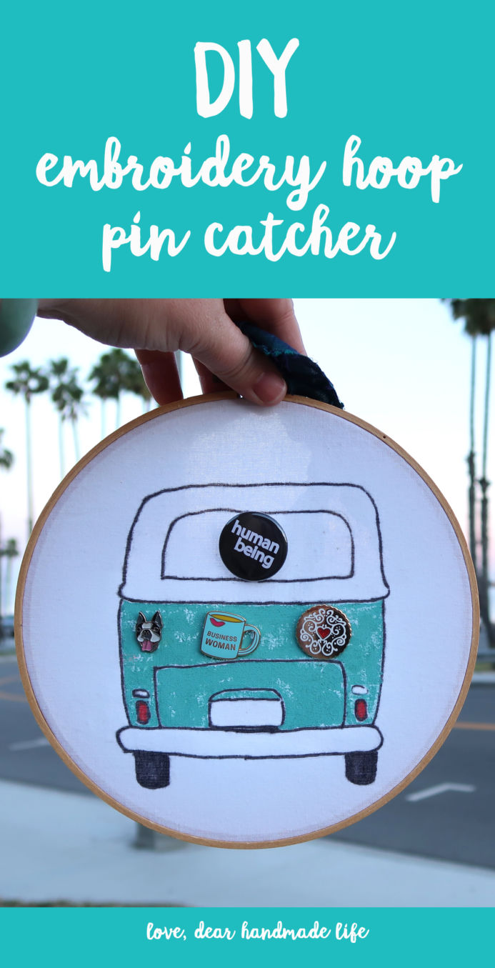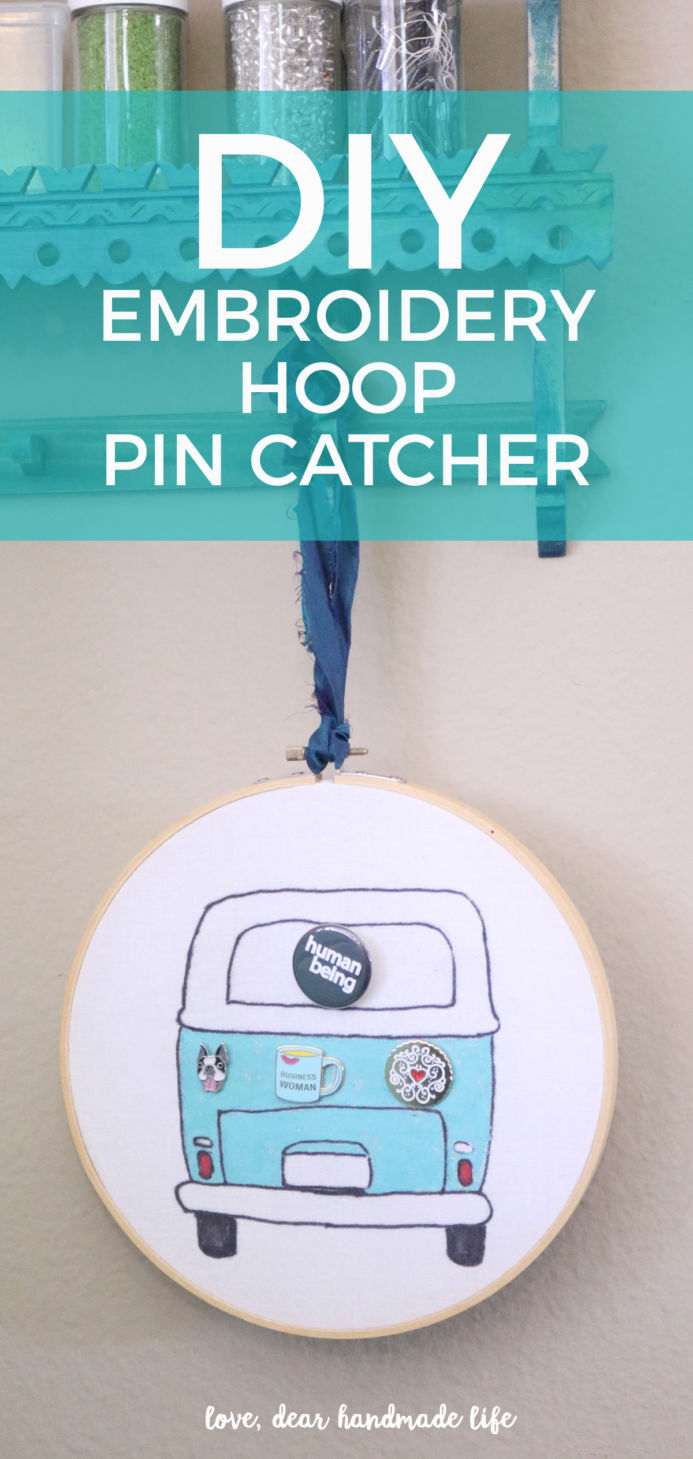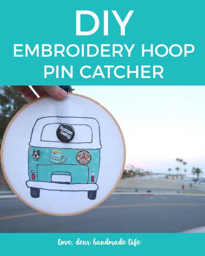 Hello all, Joan here from Break + Remake. I’m here at Dear Handmade Life to show you how to make a pin catcher. It’s the perfect DIY to keep all those pins in one place (especially if your pin game is STRONG). The DIY embroidery hoop pin catcher keeps the fronts and backs of your pins together in one place. It also helps you avoid wall dings! The hoop is taller than the backings, so they don’t stick out. Make one of these and tag @DearHandmadeLife and @BreaknRemake on Instagram so we can see what you come up with!