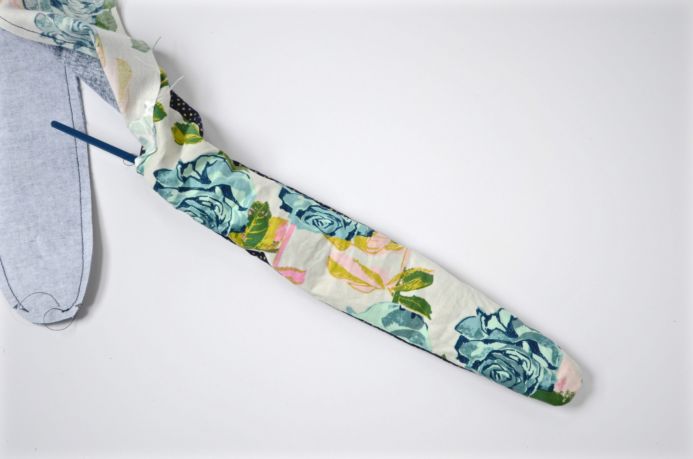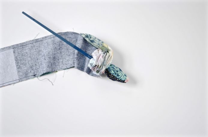 4. Use loop turner to poke ends out. Iron flat, hiding the 5” gap using a pin if necessary.