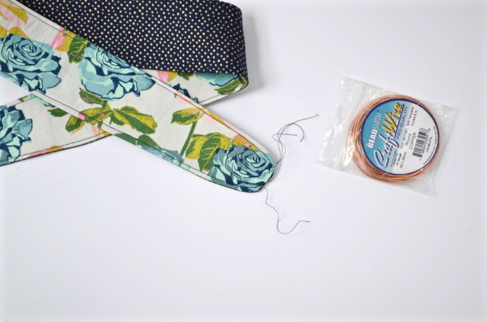 5. Top stitch, closing the 5” gap but leaving the opening at one end. Cut a piece of wire an inch shorter than the length of the headband. Insert (Note: Depending on your wire, you may need to use sandpaper to smooth the end of the wire, as it can get caught on the interfacing!)