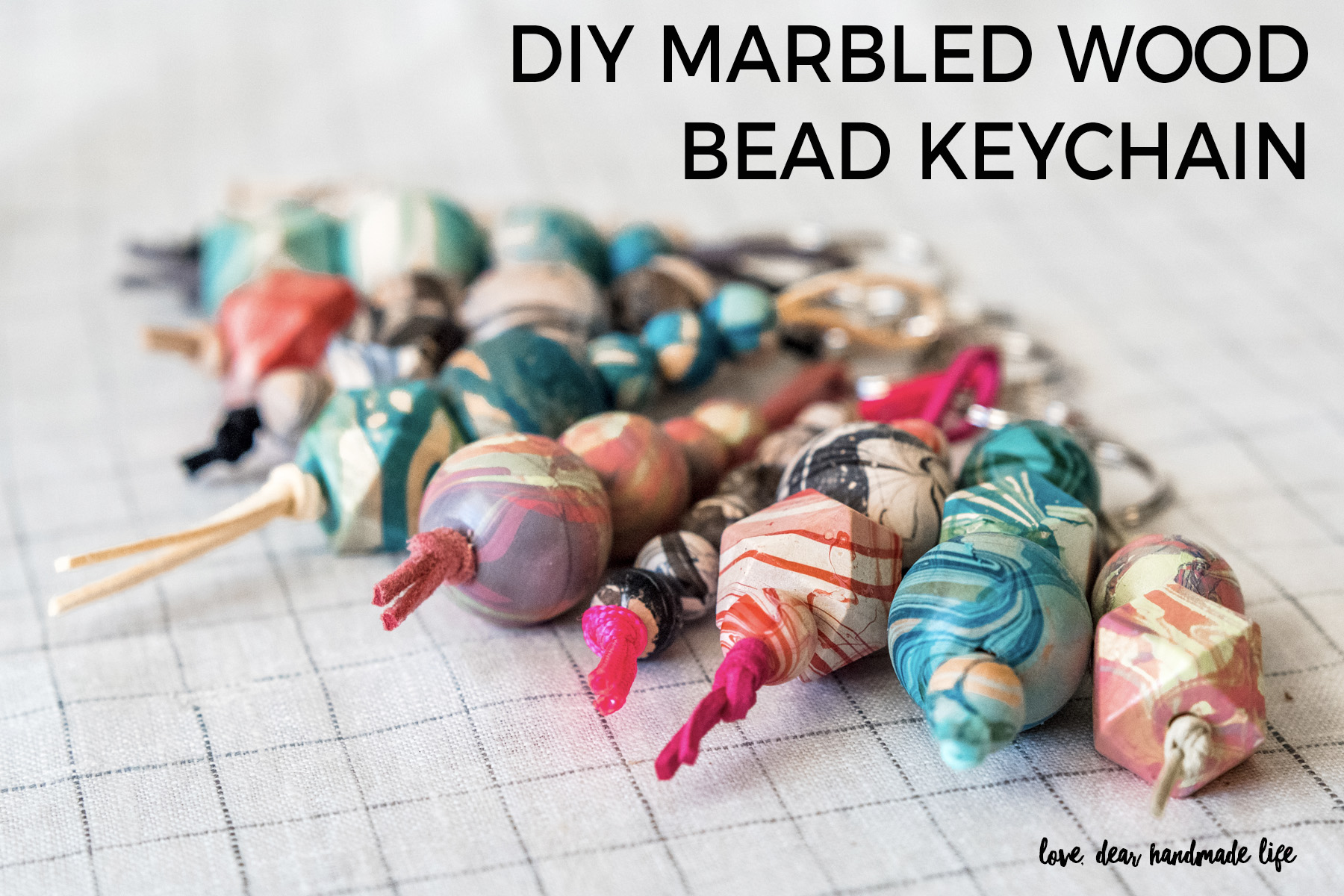 4.Once your beads are completely dry you can create your keychain. Take a split keychain ring and put the string/cording that you are using though it, I didn’t really measure here since once your beads are strung you can cut it to the length of your choosing. Pinch the ends of your cording together at the bottom and start stringing your beads in an order you like. If you’re having trouble getting the cording though the hole of the bead you can wrap some Washi tape tightly around the ends to make in smaller or more pointy to make it through the hole easier. Once I had the beads on the cord the way I wanted them I tied the ends of the cord into a simple knot and cut off the excess cording, and you’re done! These are so fun & easy to make, the options are really endless and they would make great little last minute gifts too.