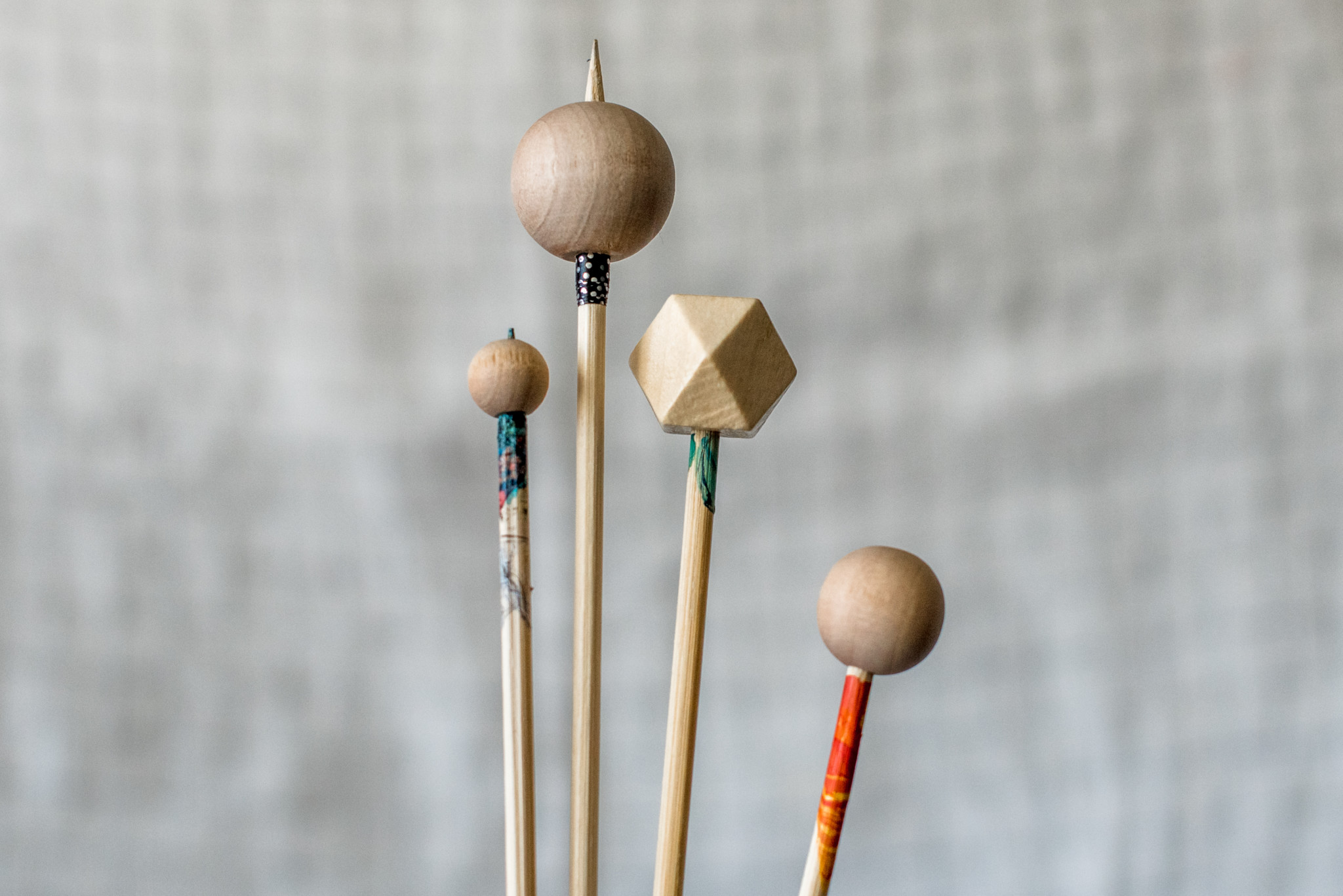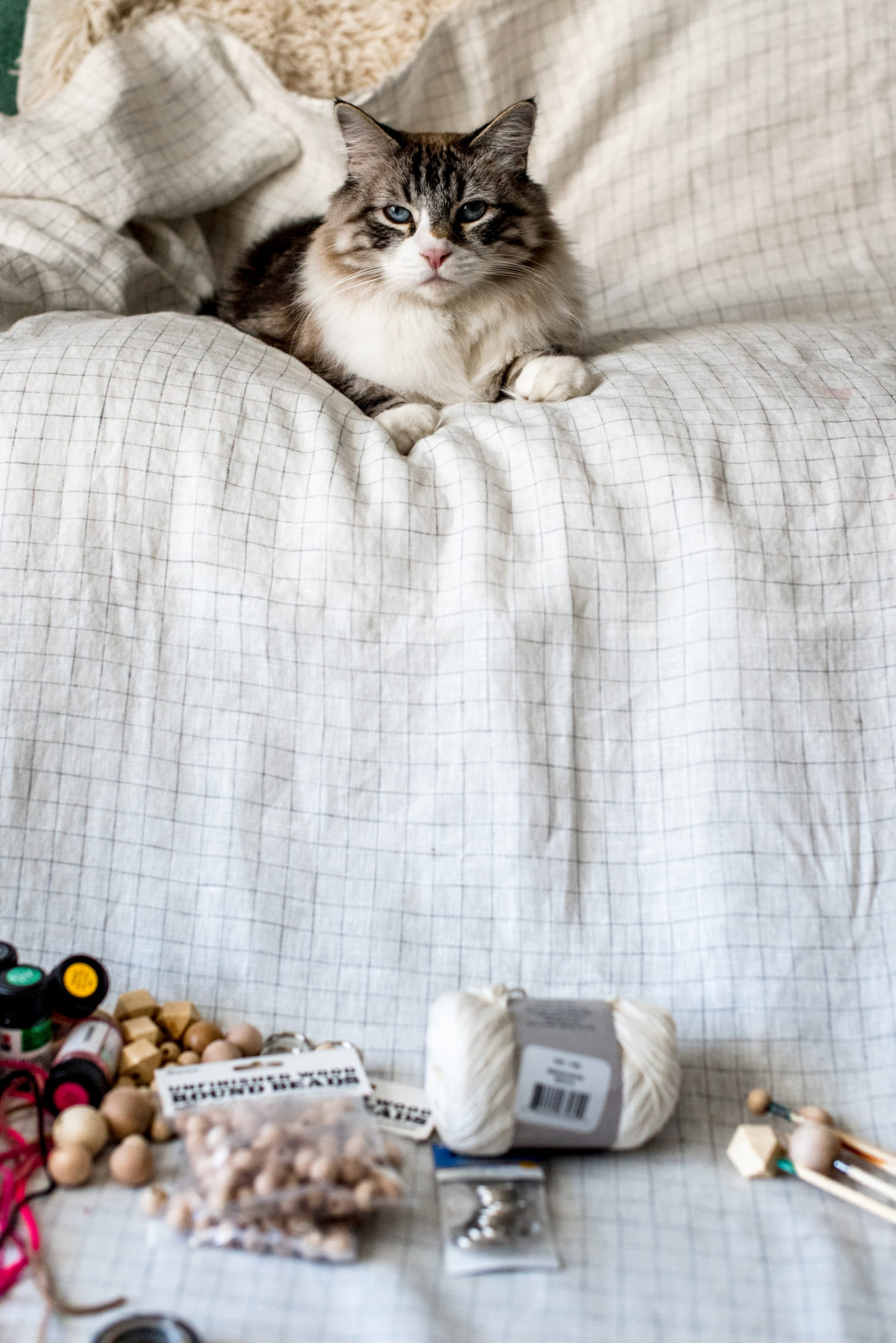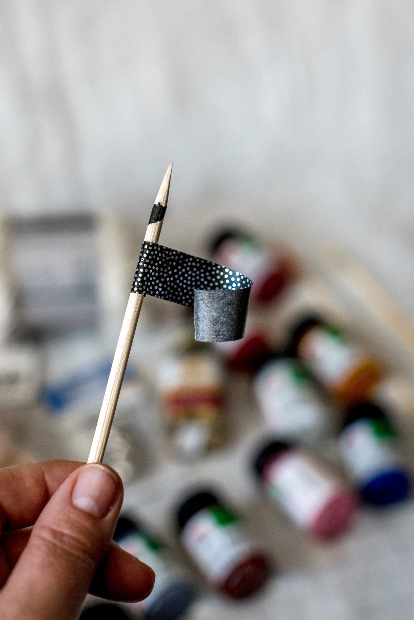 1. Prep your skewers with the beads. If your beads have a larger hole you can wrap some of the washi tape around the top of the skewer to make it bigger and so the bead will fit more securely. Also make sure your kitty is supurrvising (ha ha) you.