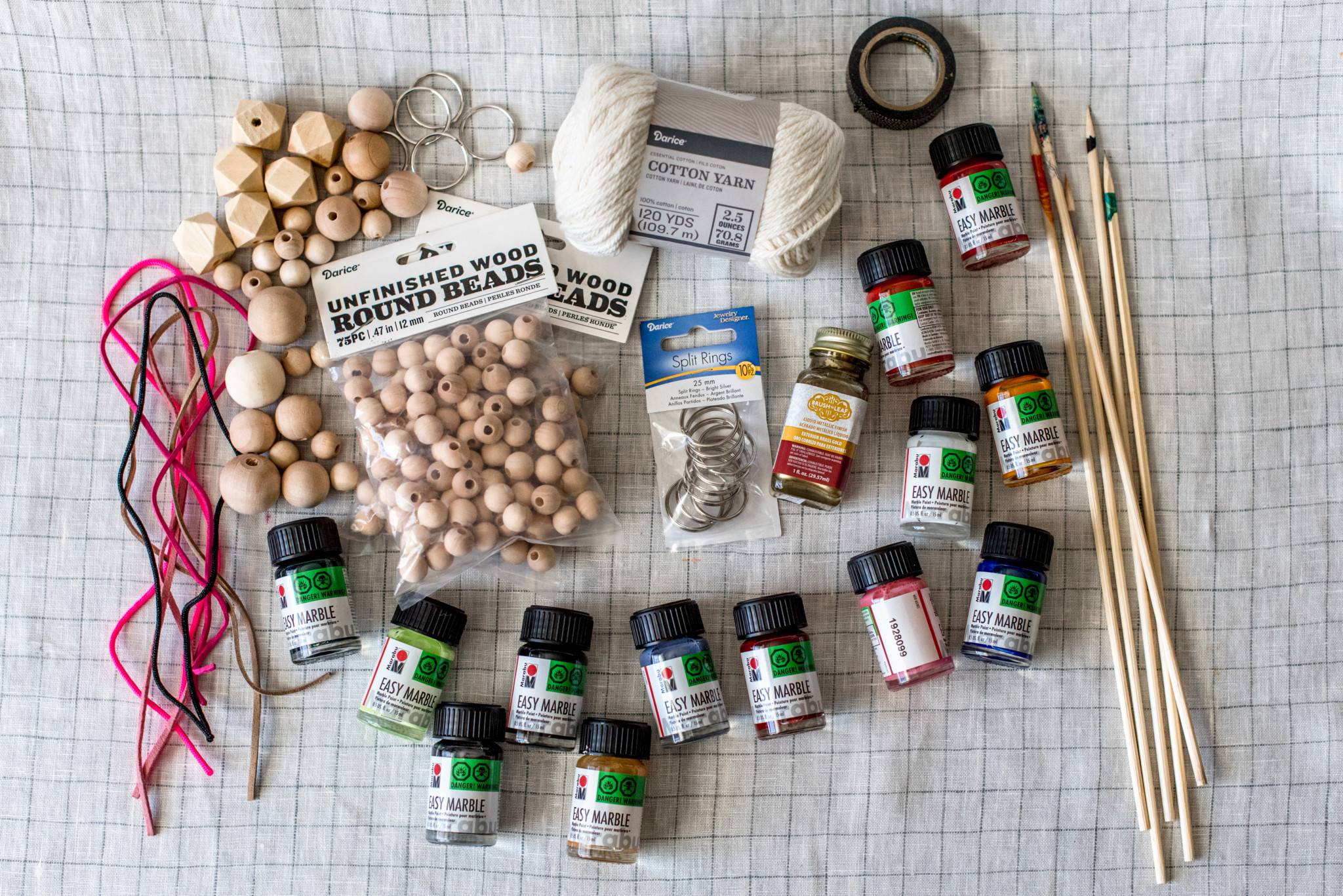 2. Prep your marbling station, it’s best to do this outside on a surface you don’t mind getting dirty and with enough fresh air because the marble paint has very strong fumes. Here you will need your plastic container, more skewers for mixing the paint in the water, rubber gloves and scratch paper or deli sheets to pick up excess paint. Fill the plastic container you are using with room temperature water. Next choose the color palette you want to use. I like the combo of only using 3-4 colors but the possibilities are really endless on color combos. Shake your paint well and open all the lids at once, this will make for easier access once you start since you’ll want to move quickly. Shake as much paint into the water as you’d like for each color, use a clean skewer to swirl the paint in a way you prefer. Then take your wooden bead on the skewer and dip it into the pain, I tried to do this in a side sweeping motion, rolling the bead on the paint as I went to cover the entire surface. Depending on the size of container you are using, you should be able to get a few beads done with the same paint if you move quick enough.