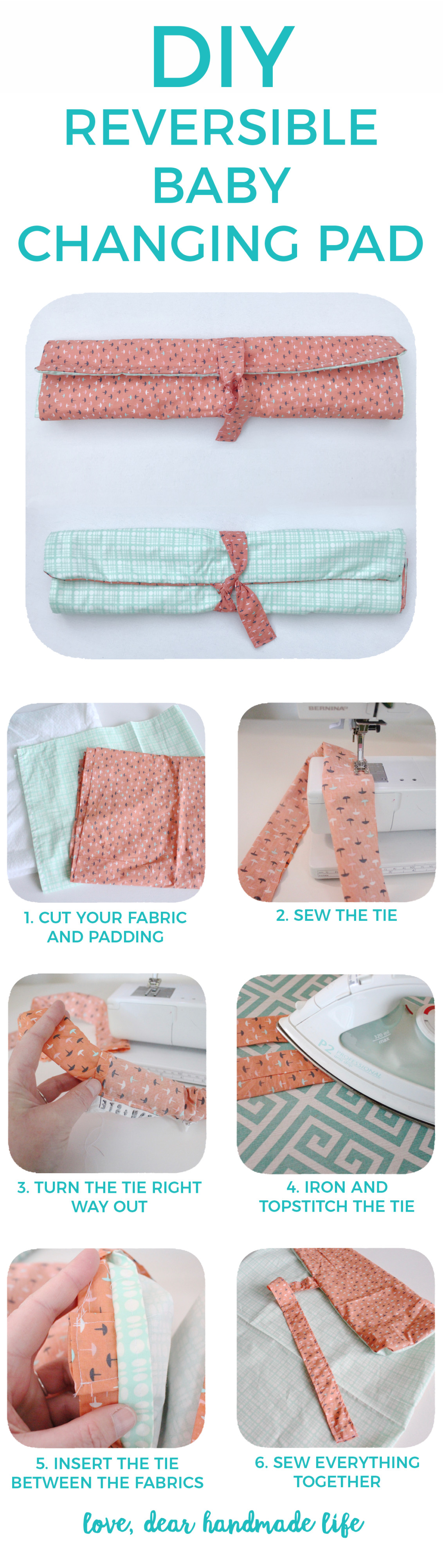 The dizzying display of strollers, bouncers, car seats, wipes, diaper creams, shampoos and baby lotions in rainbow-colored tubes, bottles and boxes was overwhelming. After 20 minutes, I hightailed it home thinking I’d be better off with something DIY. So I sat down at my sewing machine and came up with this totally washable reversible roll-up changing pad. And now that I’m relaxed… I may be OK enough to venture back to the baby store for a matching diaper bag? Then again, maybe I’ll get ambitious and DIY one.