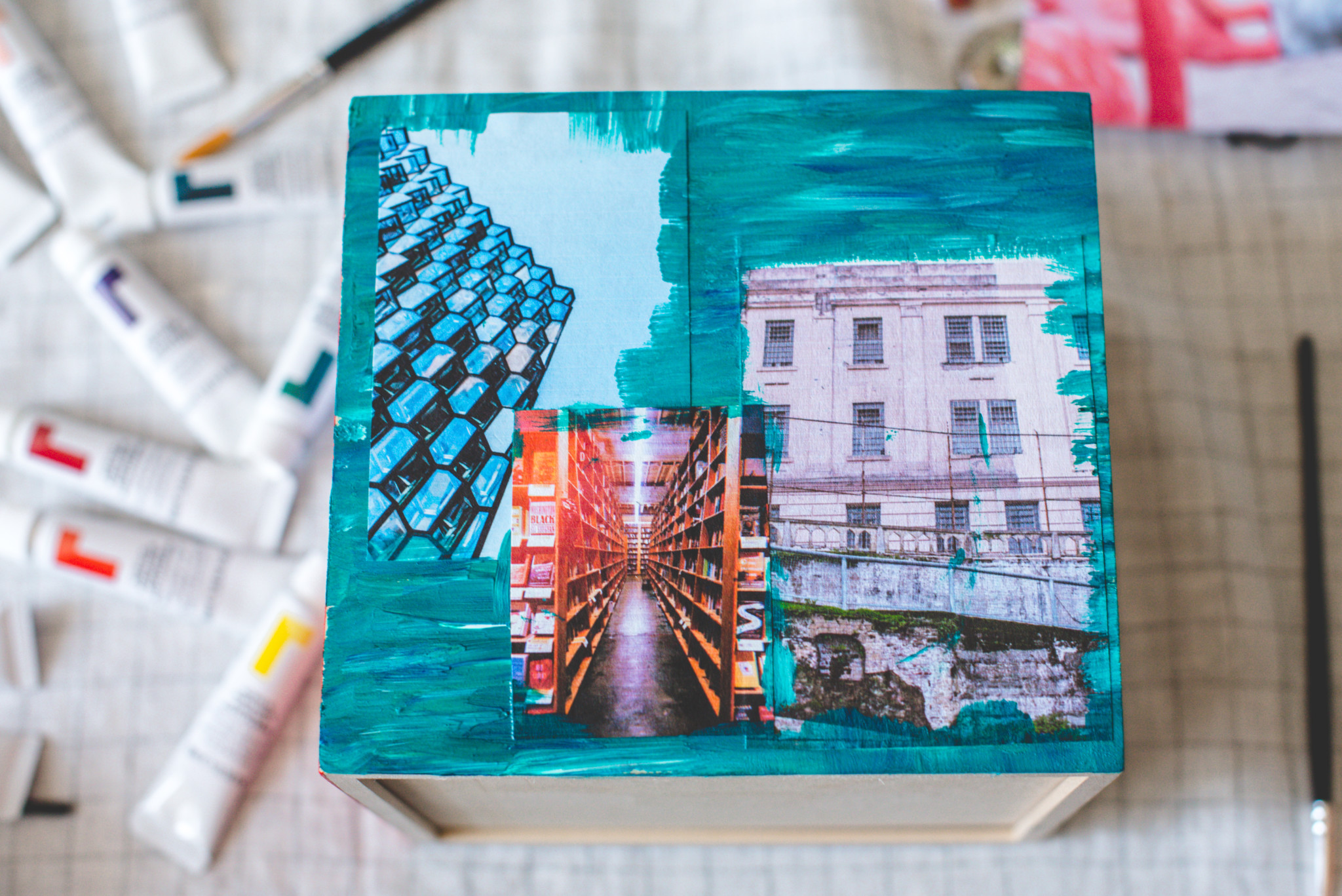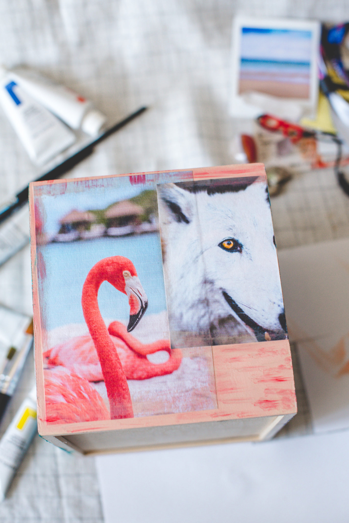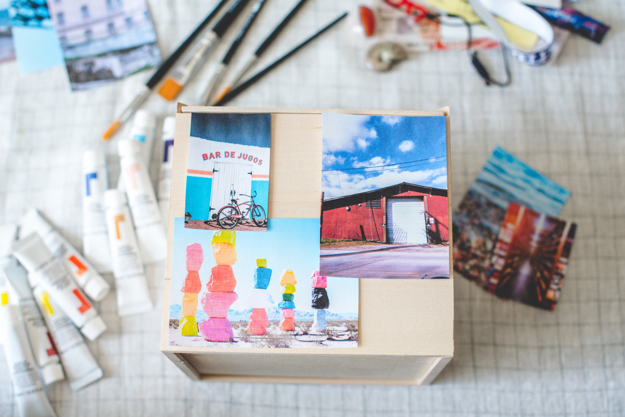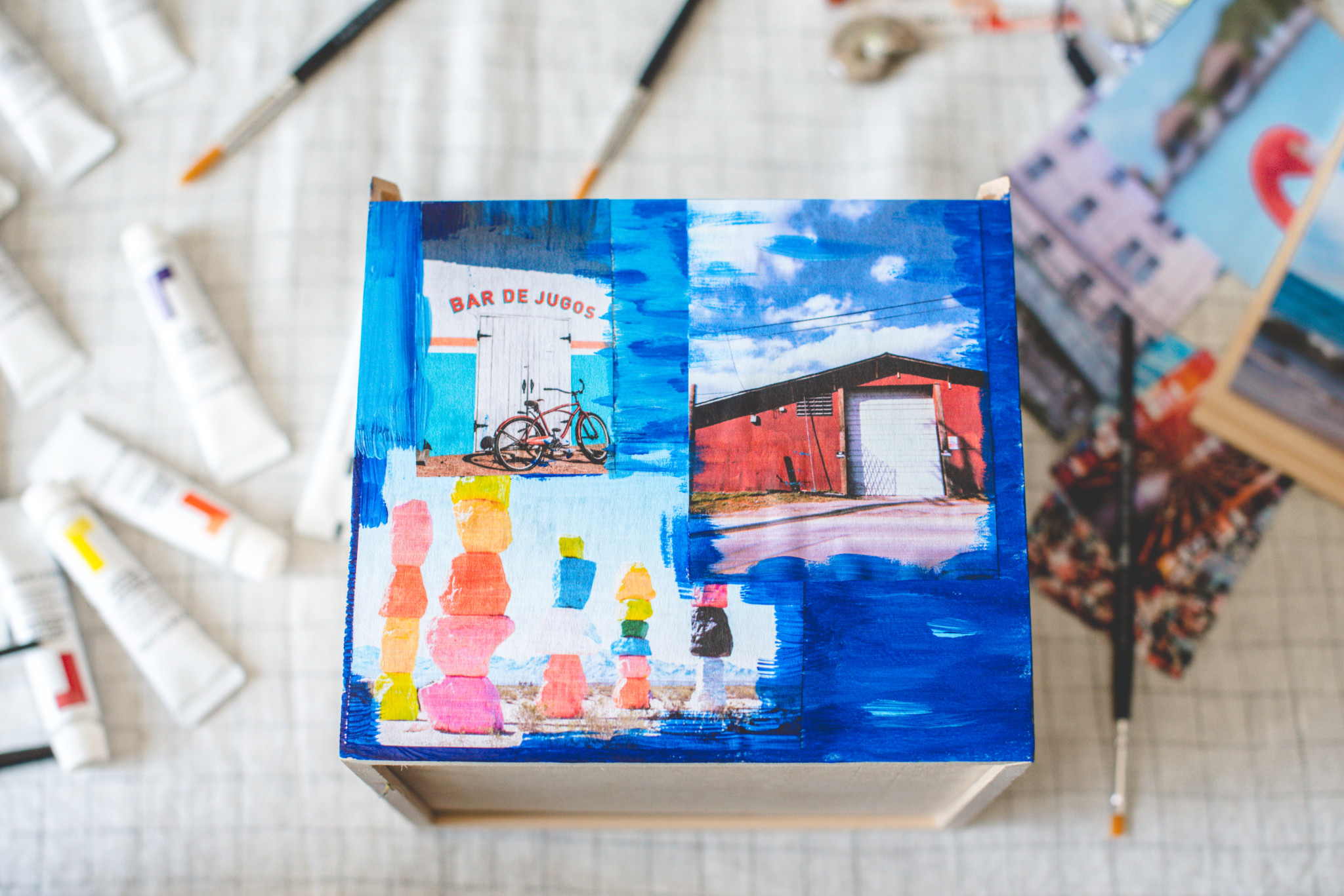 3. I used the paint to embellish the photos for a more creative/artistic look but for a cleaner look, you can skip this step. You can also use a few different colors to blend into a new color or just add some dimension. I went with what felt right to me and what I thought was visually appealing. Have fun with it! And repeat until you’ve covered each side of the box. 🙂