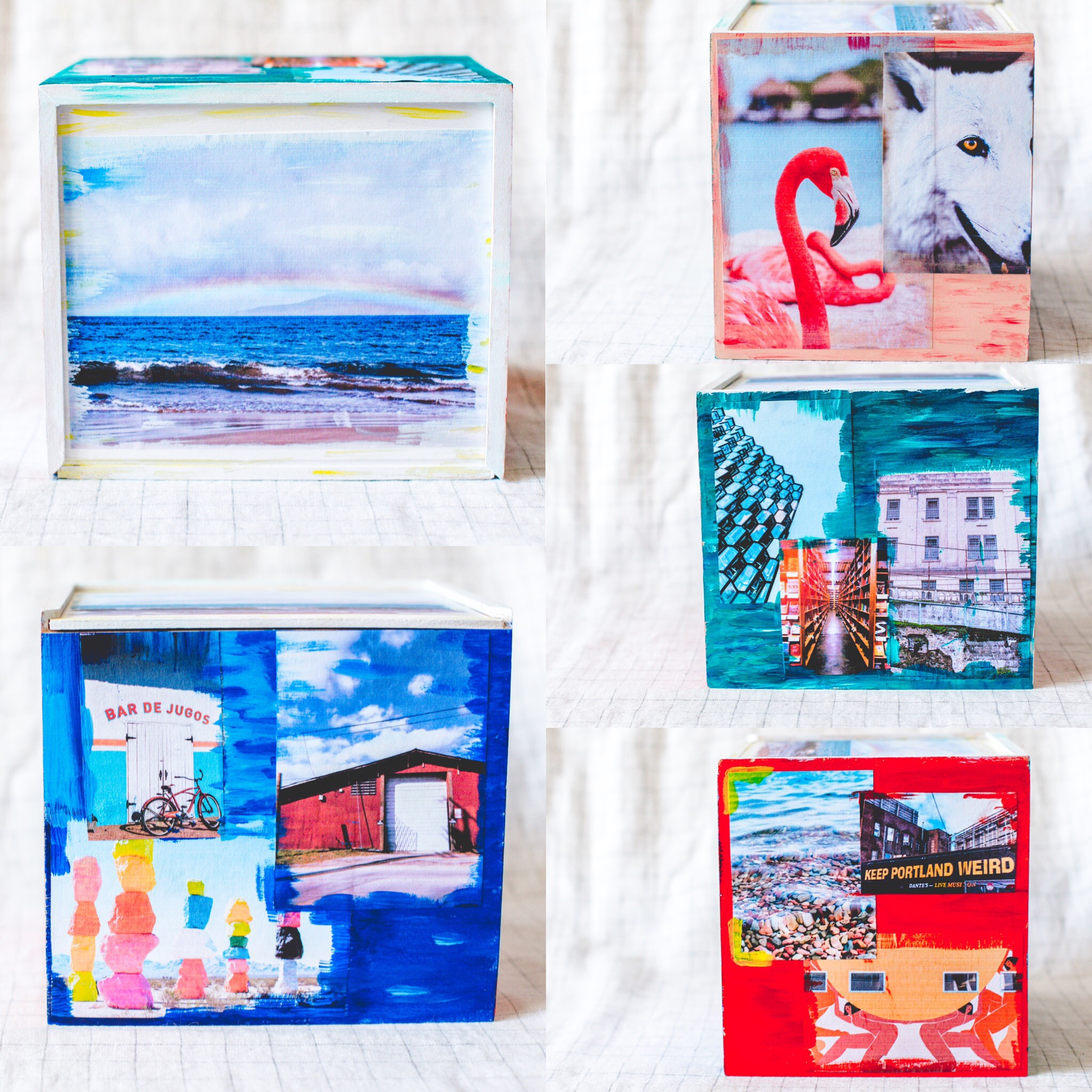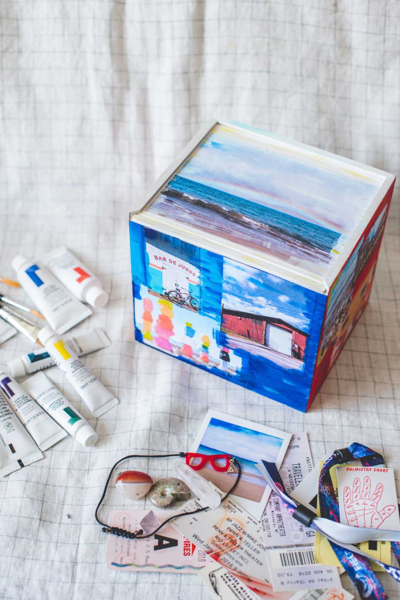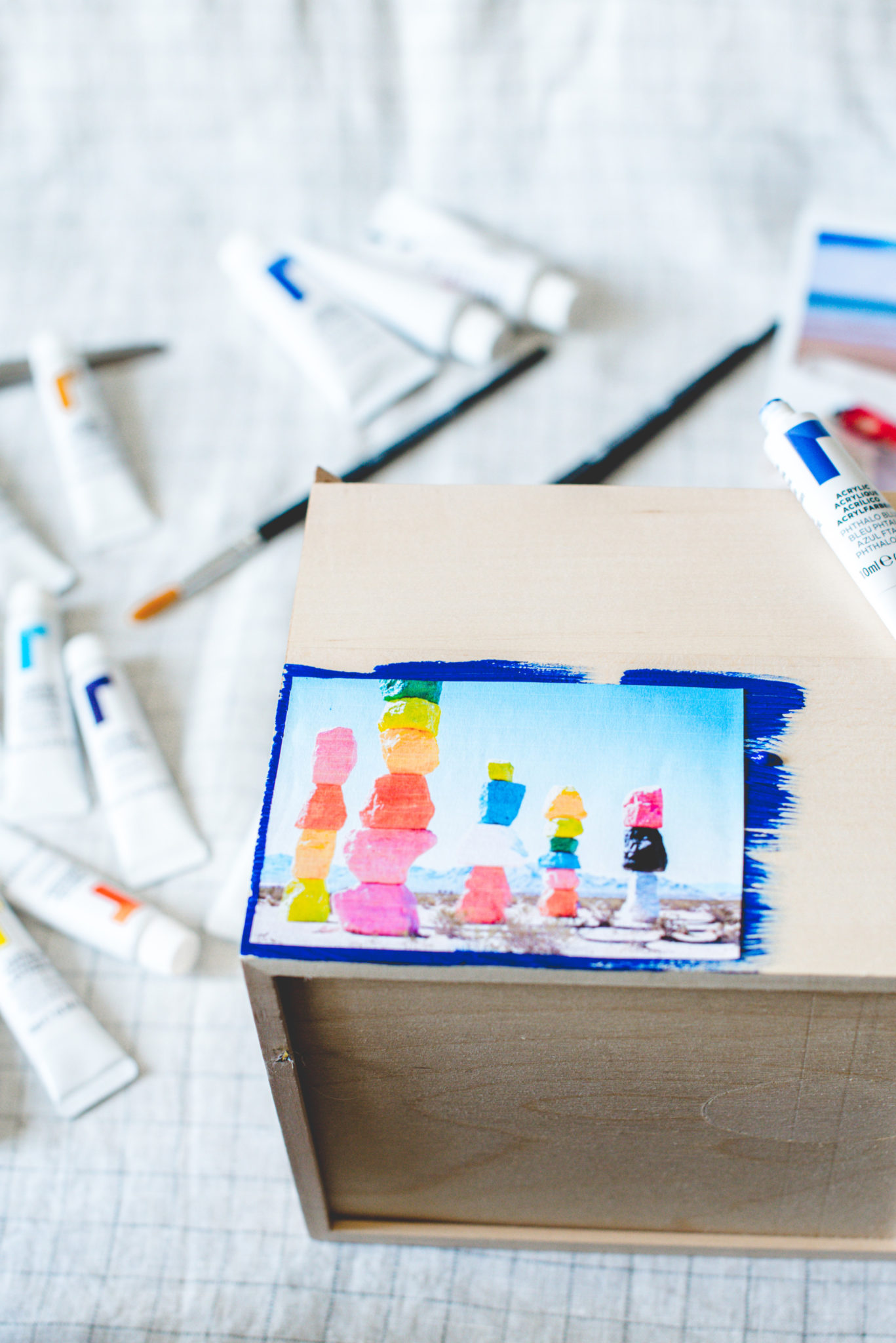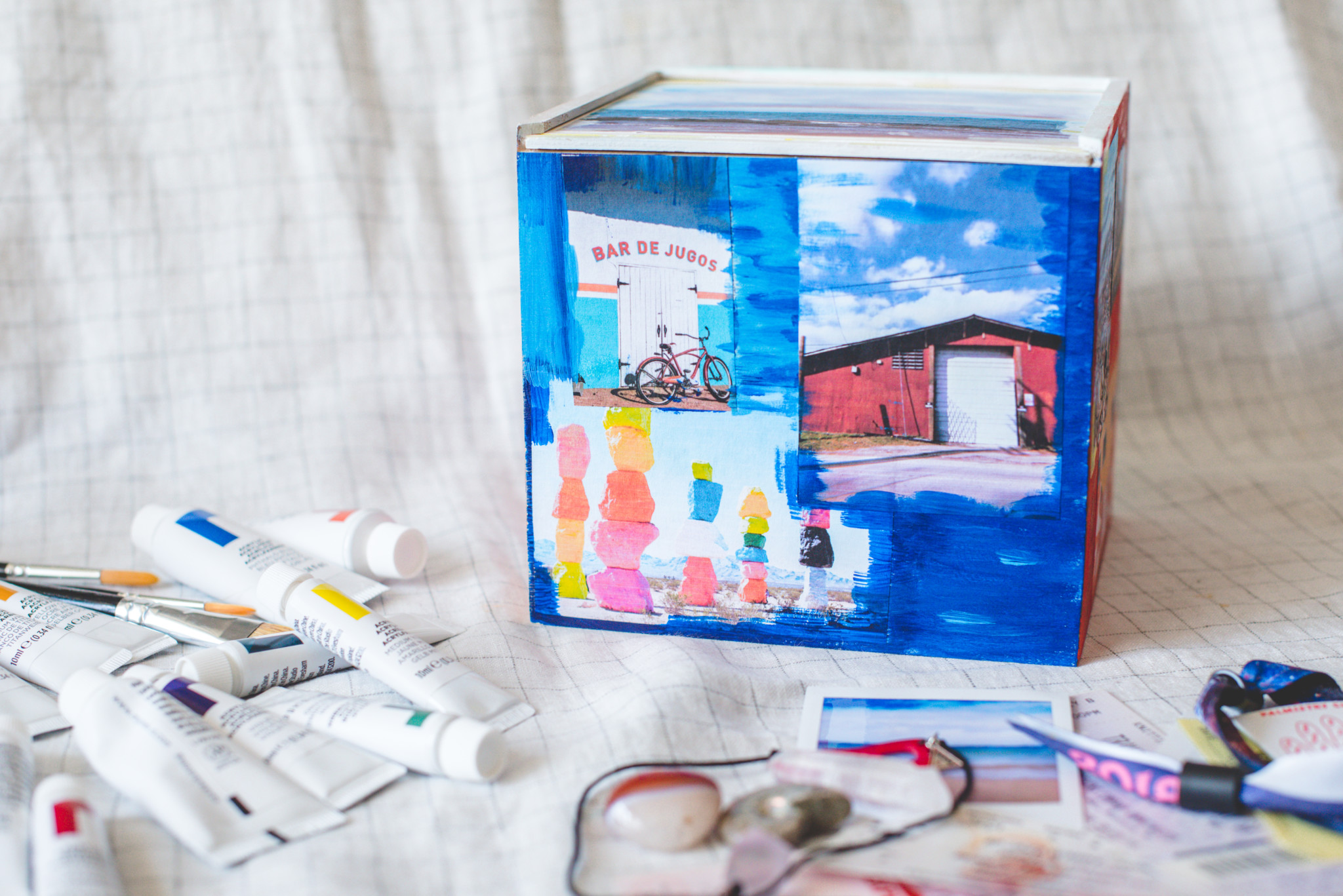 3. I used the paint to embellish the photos for a more creative/artistic look but for a cleaner look, you can skip this step. You can also use a few different colors to blend into a new color or just add some dimension. I went with what felt right to me and what I thought was visually appealing. Have fun with it! And repeat until you’ve covered each side of the box. 🙂