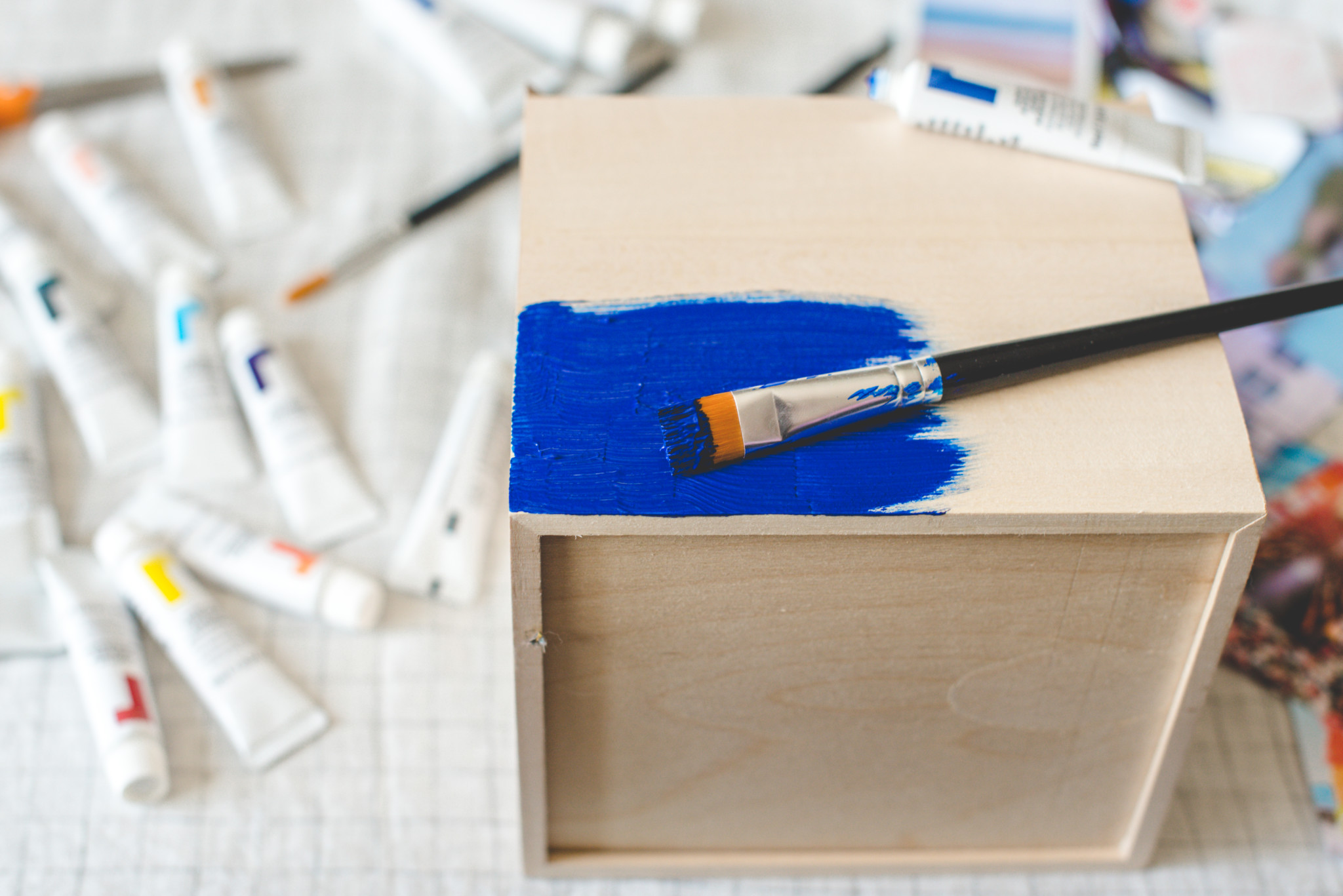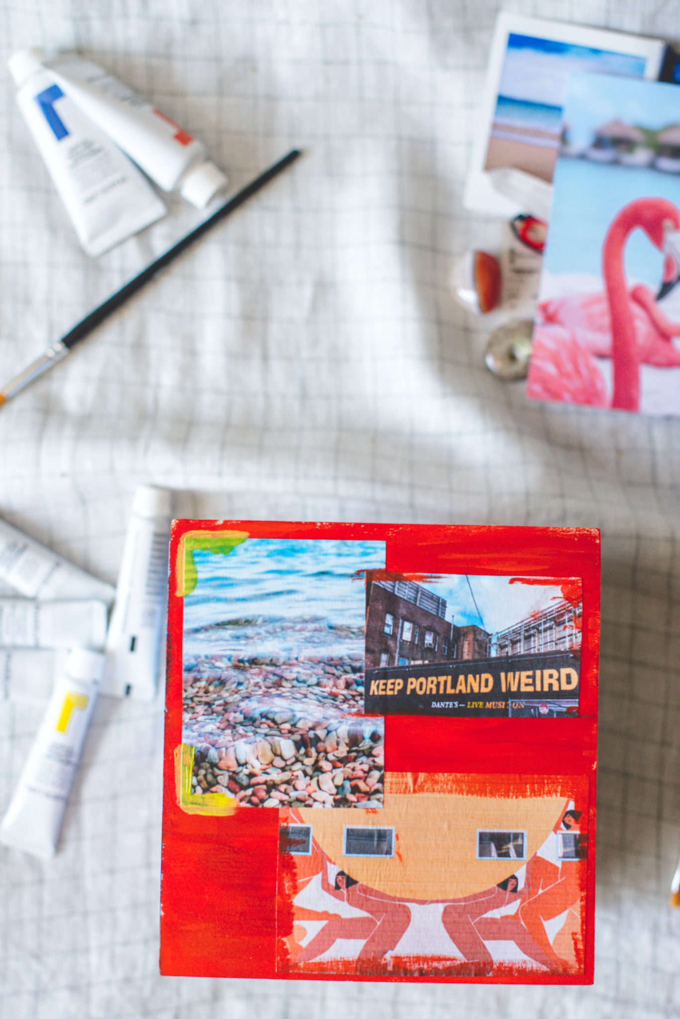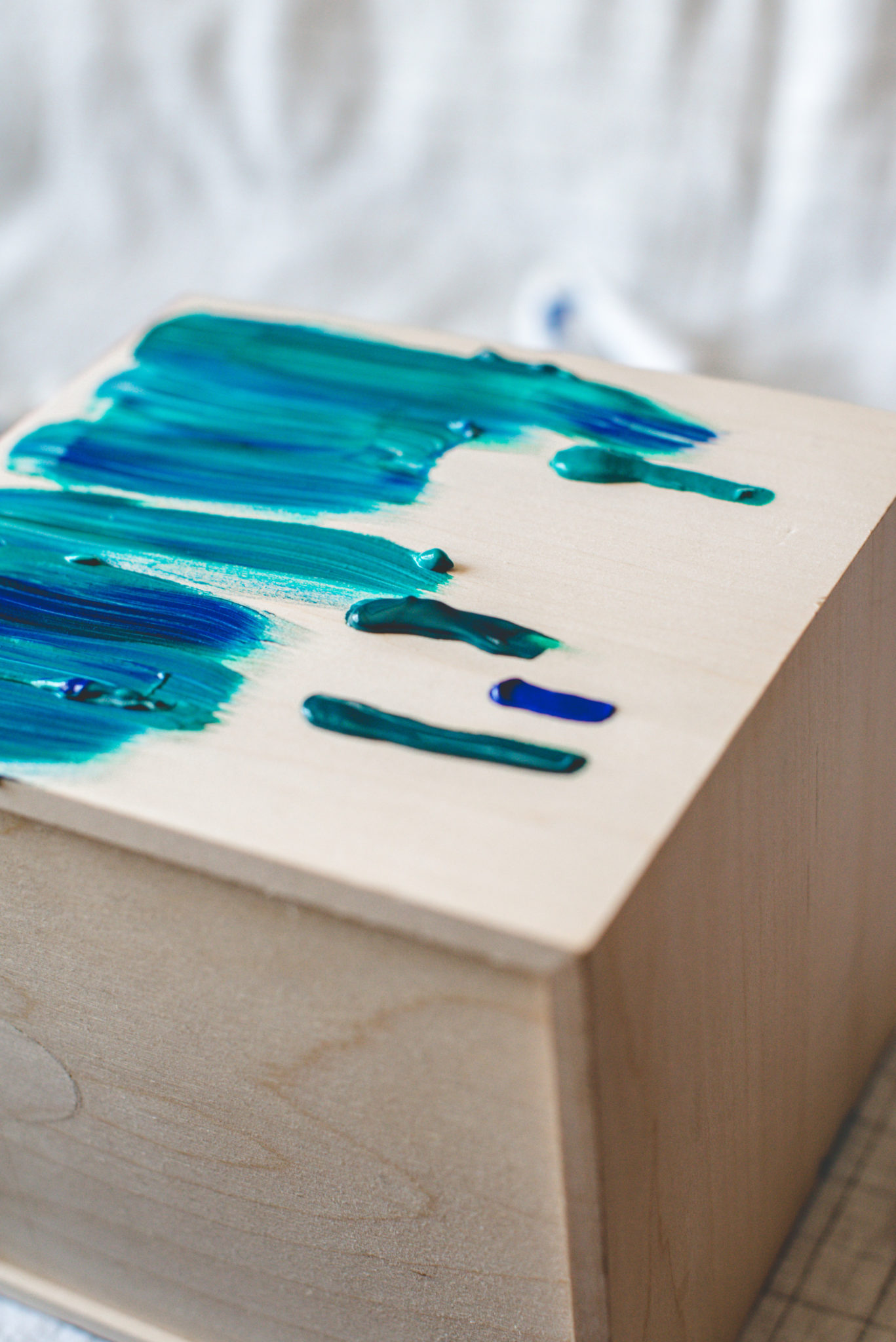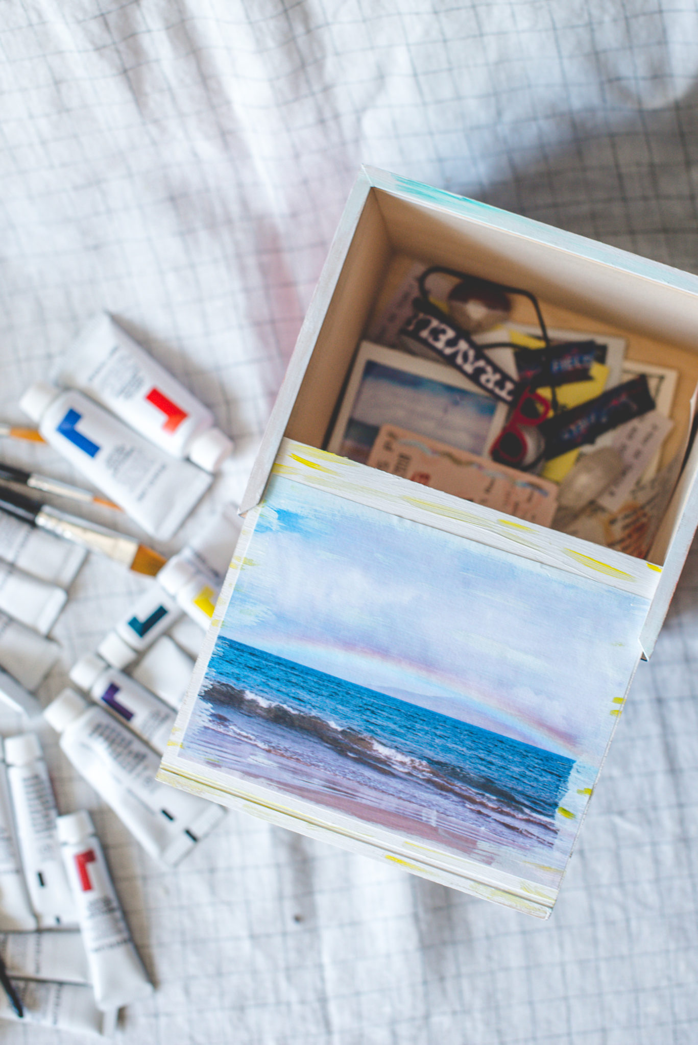 3. I used the paint to embellish the photos for a more creative/artistic look but for a cleaner look, you can skip this step. You can also use a few different colors to blend into a new color or just add some dimension. I went with what felt right to me and what I thought was visually appealing. Have fun with it! And repeat until you’ve covered each side of the box. 🙂