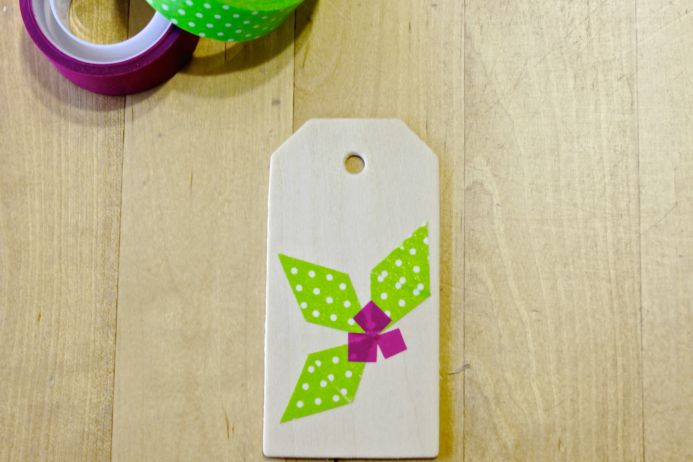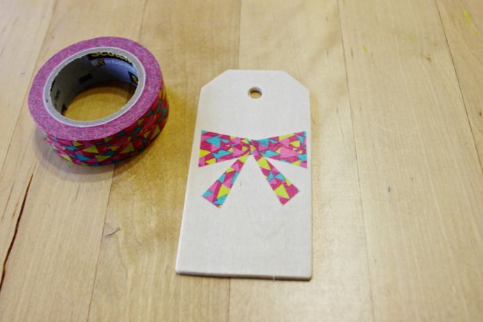 To create the top of the bow, cut two long triangles, roughly the same size. Lay them down on your tag so that the two points of the triangles overlap. Cut two super skinny triangles to create the tails.