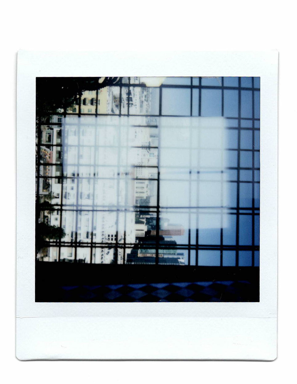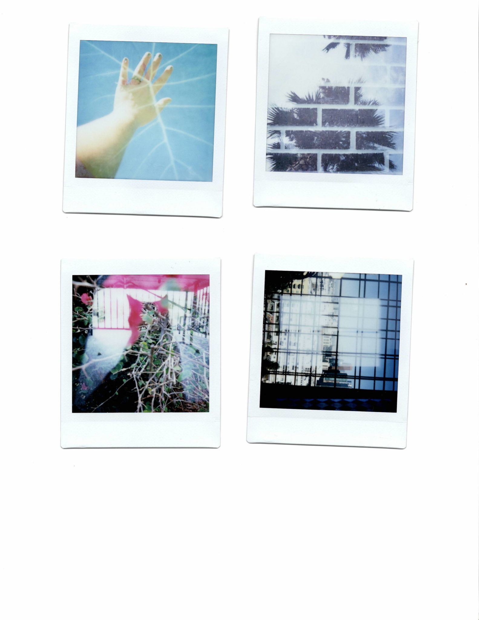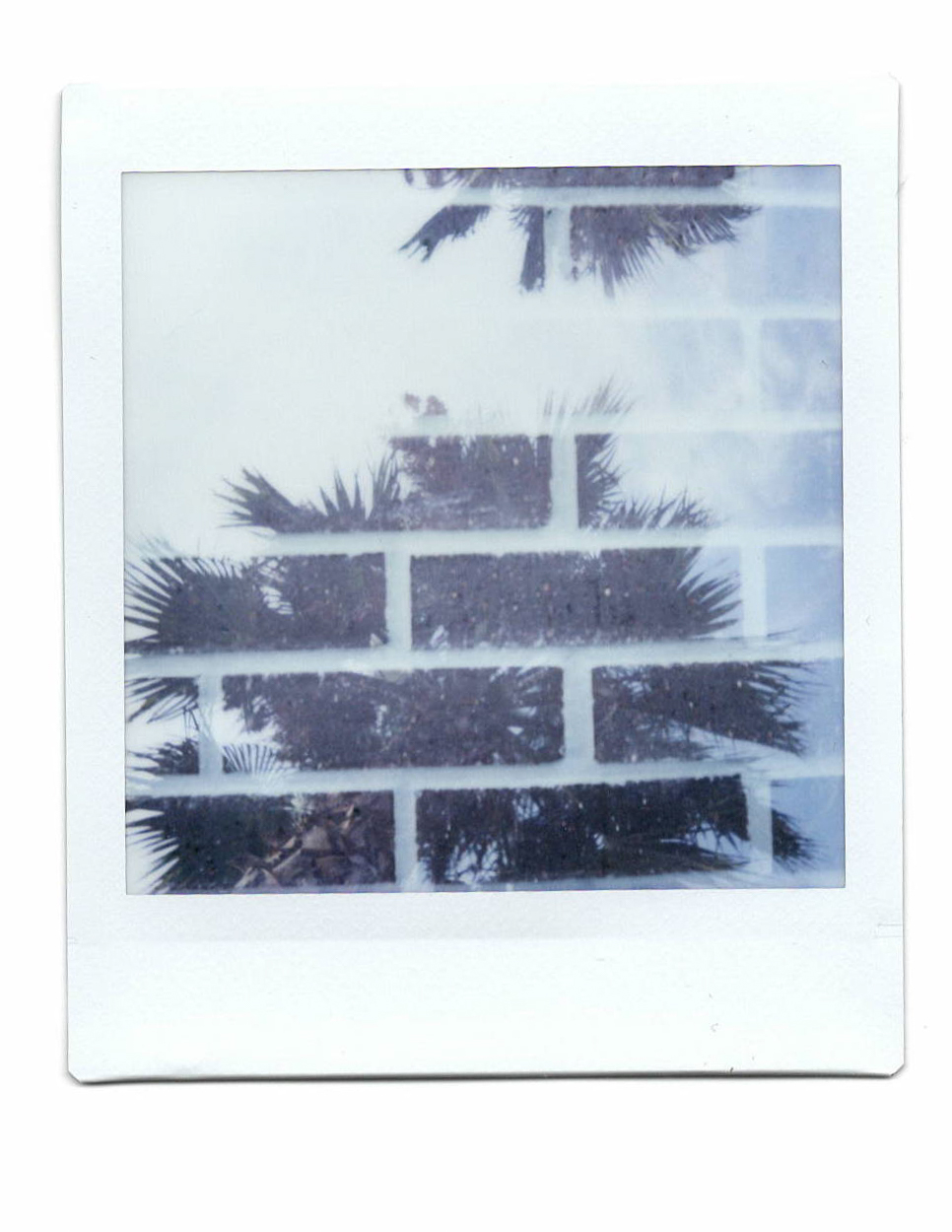 I found the easiest kind of double exposure to take with the FUJIFILM instax SQUARE® SQ-6 instant camera was a silhouette of something and then some kind of texture or pattern, like flowers or a brick wall. You can try your first silhouette by holding your palm to the sky and shooting that and then your pattern of choice. My favorite one here was using a big elephant ear plant as my second patterned photo. I also tried it with a silhouette of one of my cats and a bougainvillea bush right outside. Another way to use it is with trees, I shot a palm tree looking up at it for the first shot and then a brick wall, I love the contrast of nature paired with industrial imagery. For this last one, I shot windows that were bright but around them was silhouetted and then a cityscape shot sideways, I love how this one turned out.