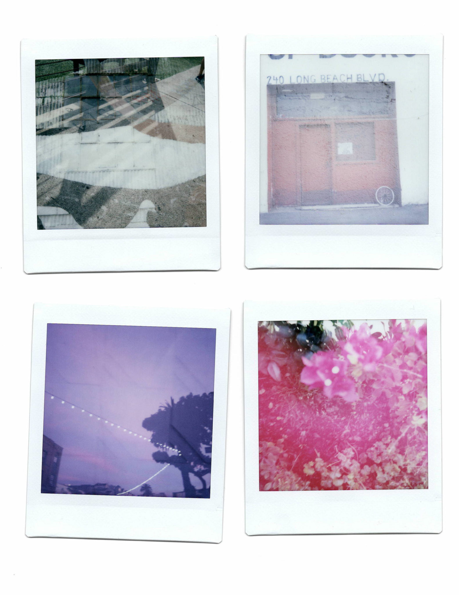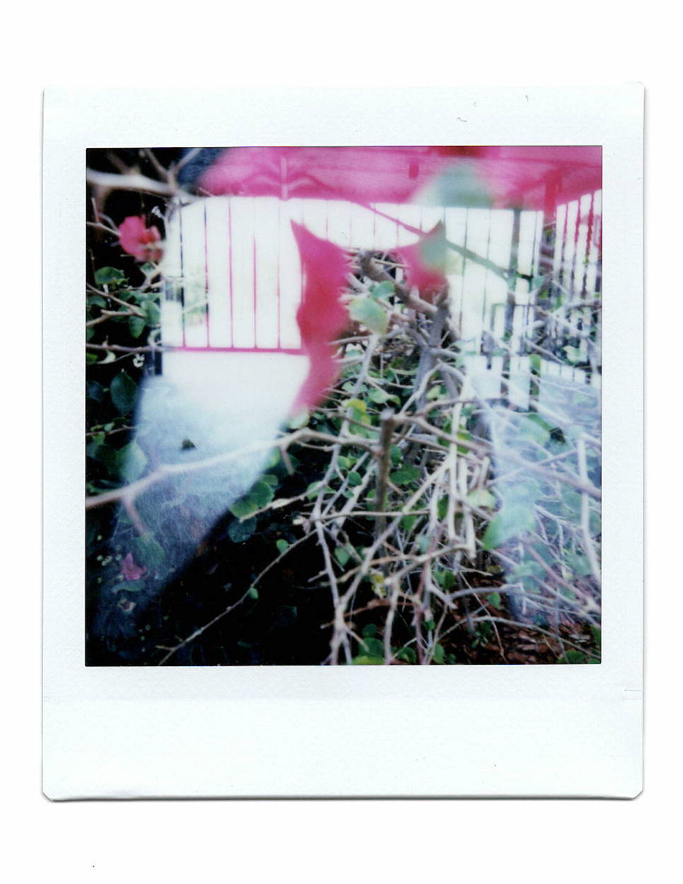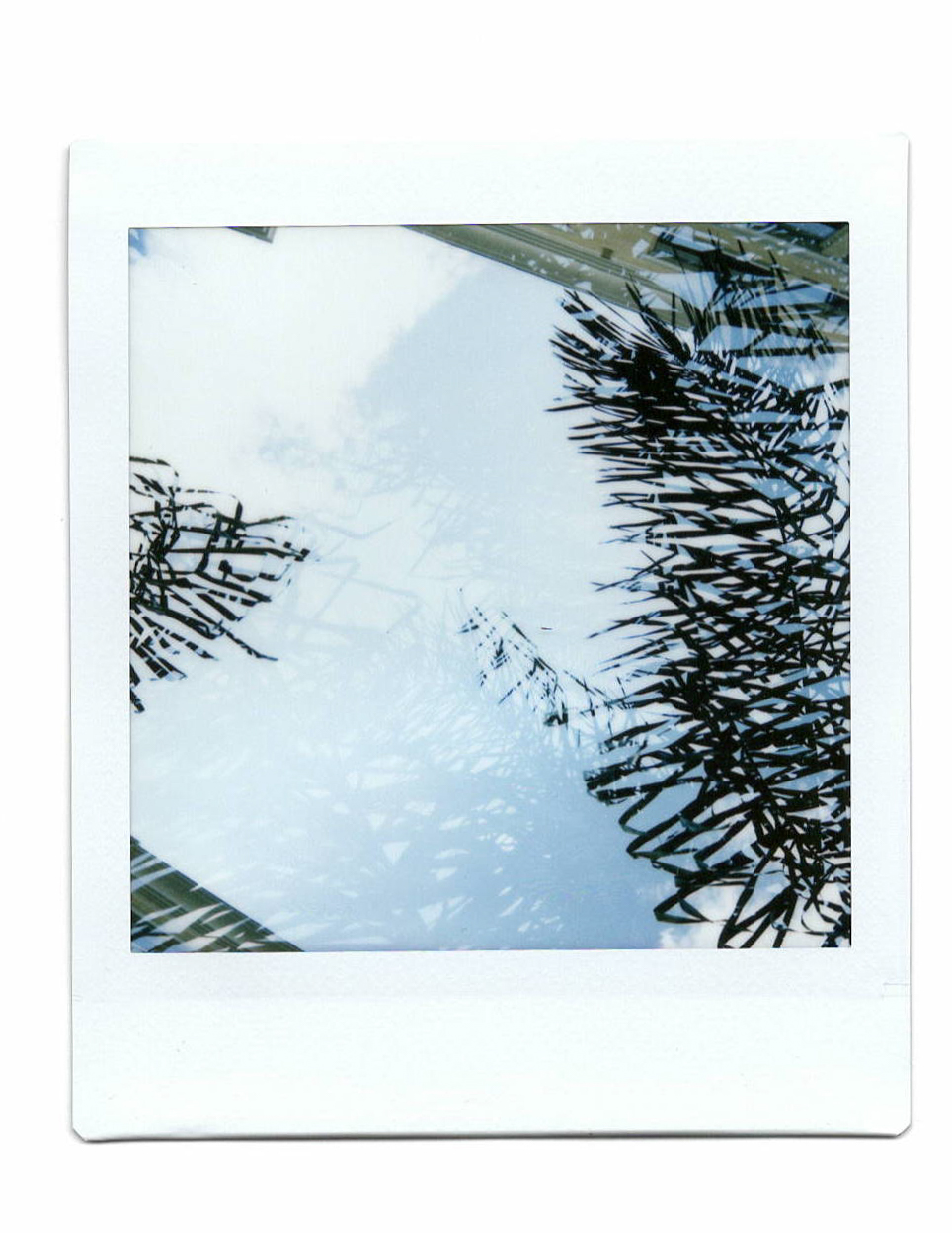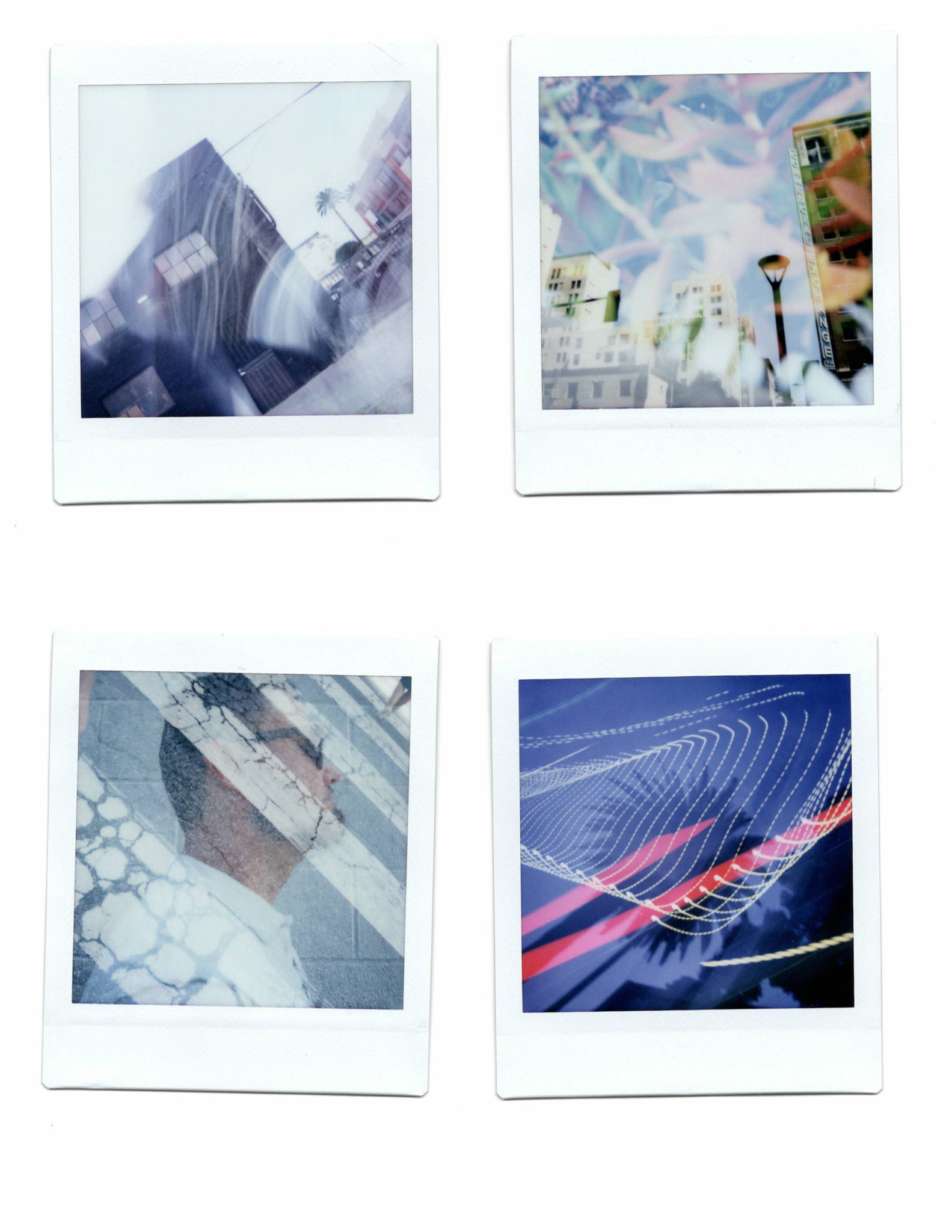 I found the easiest kind of double exposure to take with the FUJIFILM instax SQUARE® SQ-6 instant camera was a silhouette of something and then some kind of texture or pattern, like flowers or a brick wall. You can try your first silhouette by holding your palm to the sky and shooting that and then your pattern of choice. My favorite one here was using a big elephant ear plant as my second patterned photo. I also tried it with a silhouette of one of my cats and a bougainvillea bush right outside. Another way to use it is with trees, I shot a palm tree looking up at it for the first shot and then a brick wall, I love the contrast of nature paired with industrial imagery. For this last one, I shot windows that were bright but around them was silhouetted and then a cityscape shot sideways, I love how this one turned out.