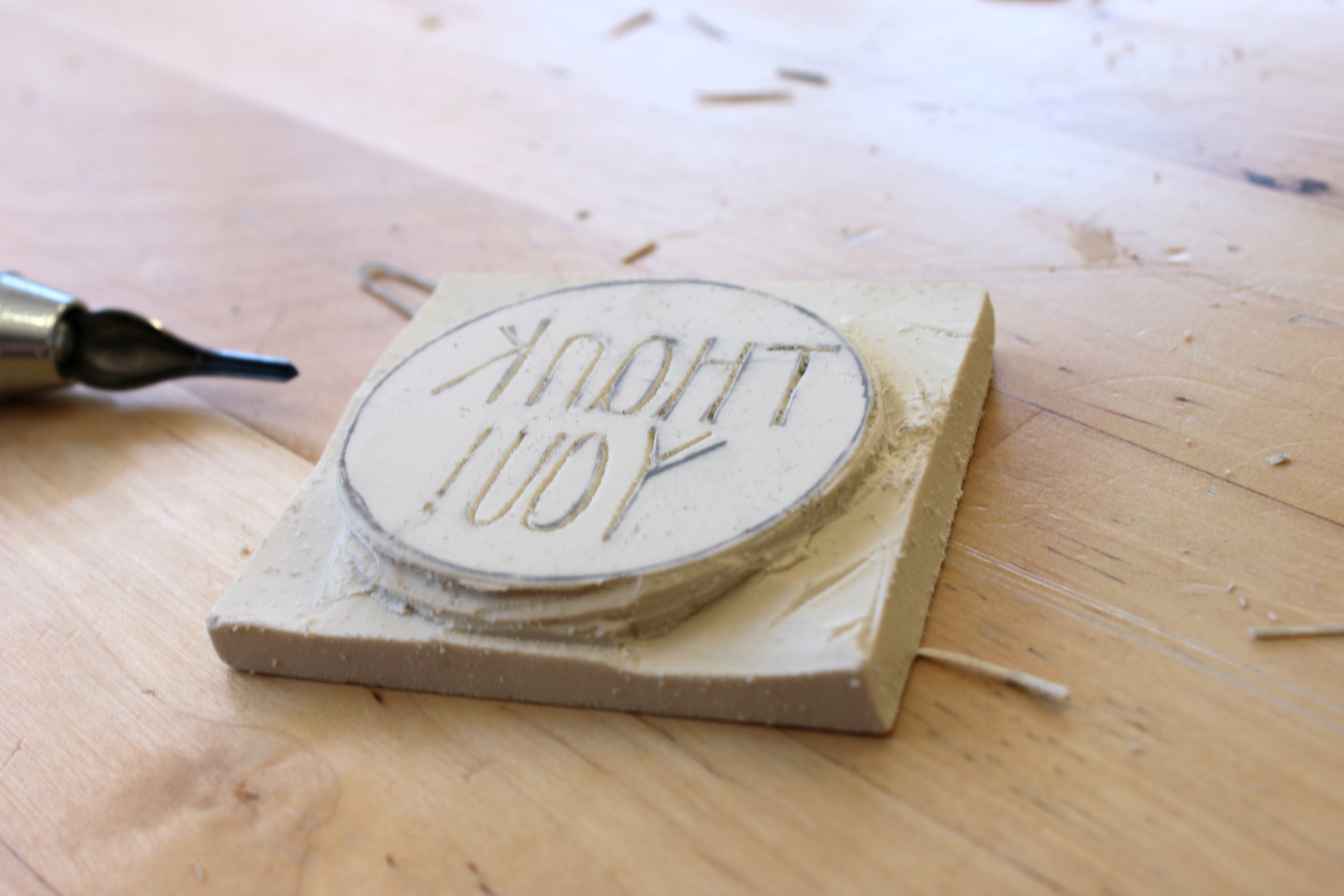 6. Next, place your #1 blade on to your cutting tool and carve out the letters. The lettering I incorporated in this design only required a single, shallow pass of the carving tool. Super easy!