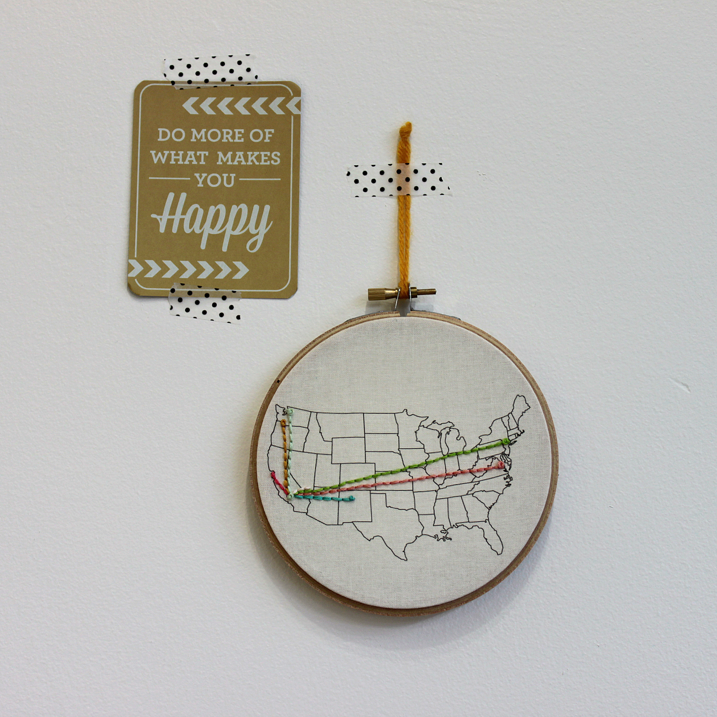 9. After you’ve completed your stitching, trim away excess fabric and hang your hoop on the wall! Mine is hanging up in my craft studio, where I sometimes daydream about adventures in new cities. I plan to update my embroidery hoop map as I continue to travel, and I hope you will, too!