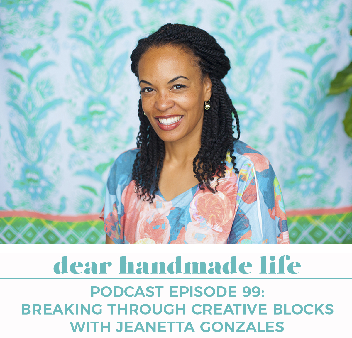 Today on the Dear Handmade Life podcast I’m talking about breaking through creative blocks with Jeanetta Gonzales. Jeanetta and I talk about what to do when you have too many (or not enough) ideas, dealing with your inner critic, getting unstuck, the importance of creative community and more.