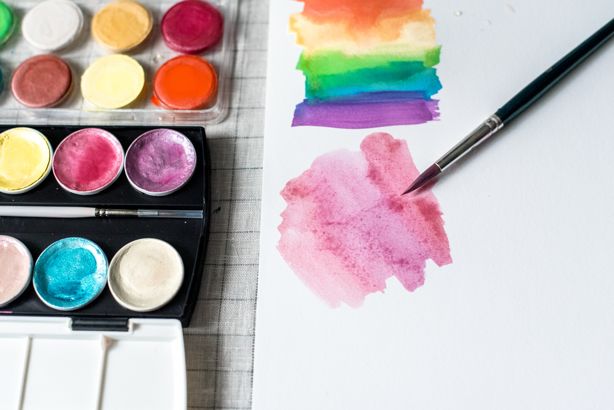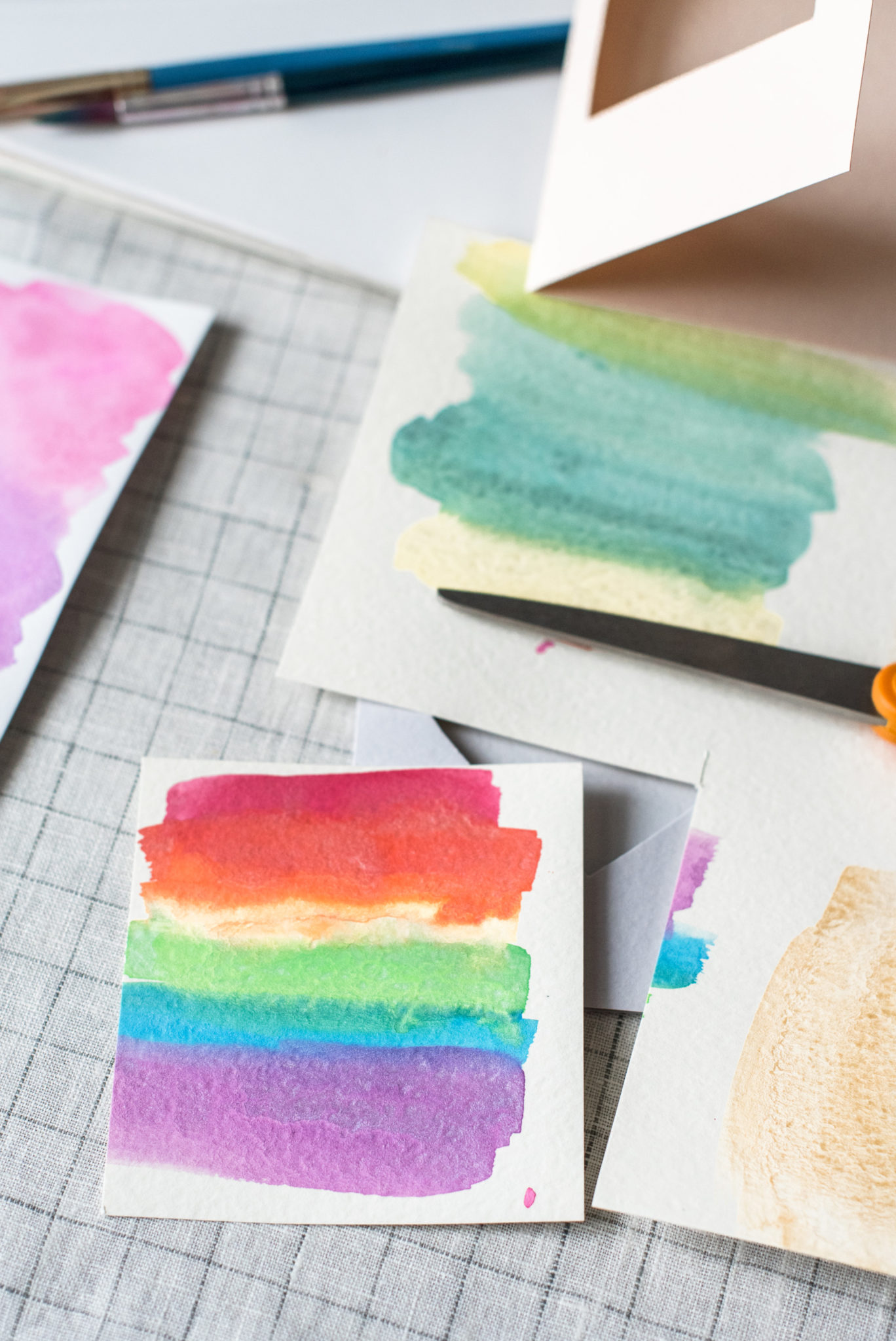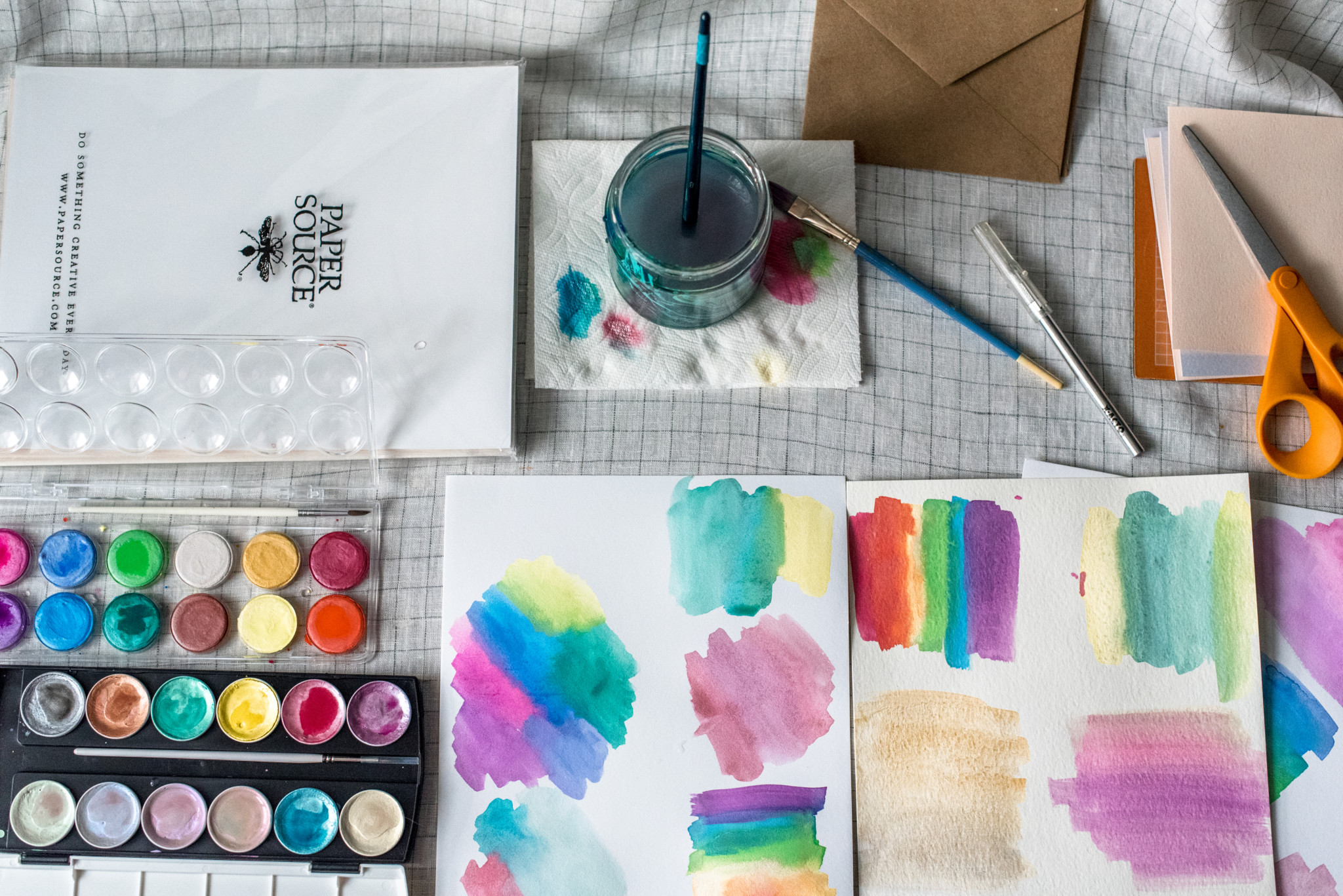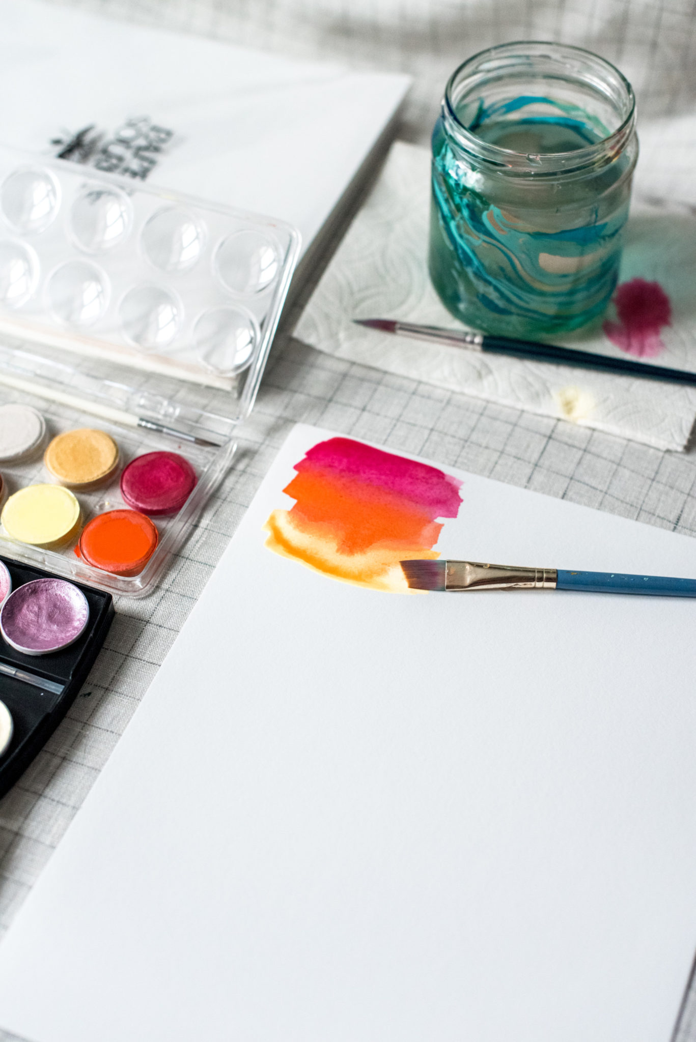 2. Time to paint! For this I used both the Savoy Cotton card stock from Paper Source and watercolor paper. You can use any type of paper that’s on the thicker side (it’s helpful if it has a bit of tooth or texture to it). All you need is a little water to get these paints started and then I just played around with different simple washes of color together. This is completely up to how you want your final project to look, I wanted it to just be a bit abstract and colorful, but you could definitely paint with more detail here! Once you’re done painting, set them aside to dry completely.