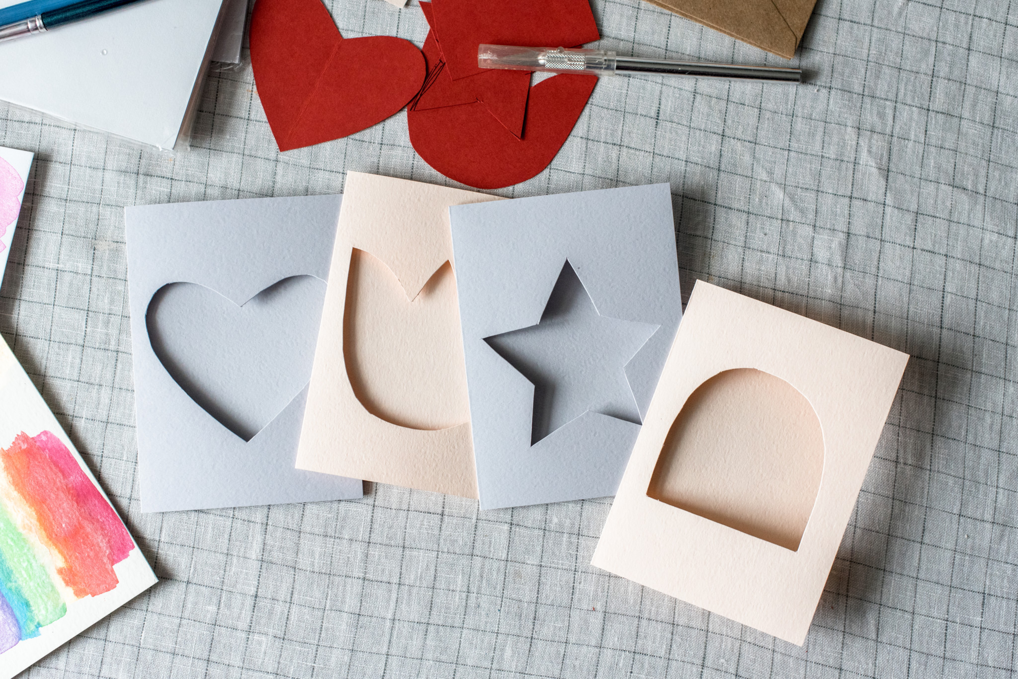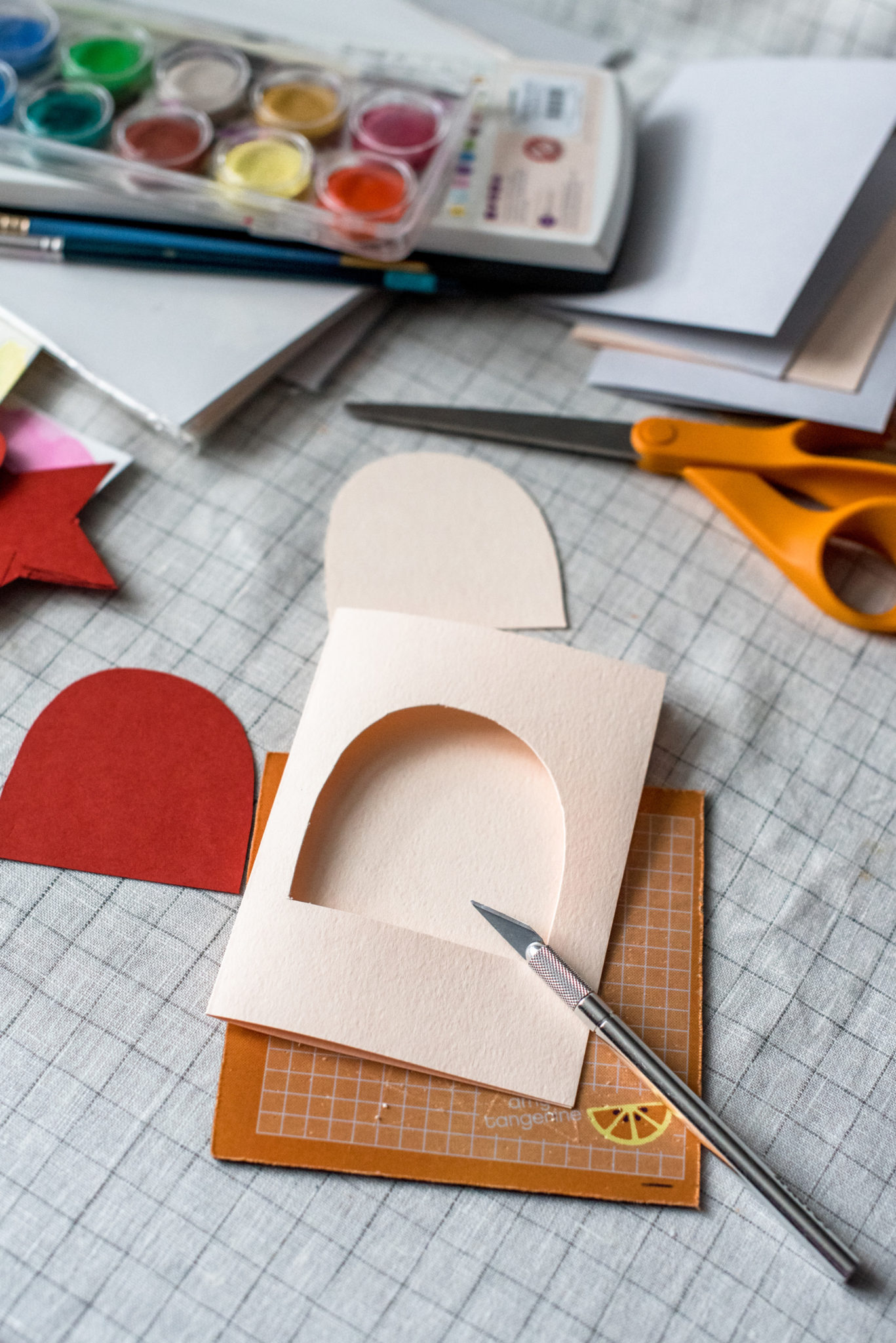 4. Open up your card, making sure the front is facing up and that it is the only side we will be working on, place your cutting mat or thick cardboard underneath. Line up your shape pattern where you want it on your card. You can trace your shape with a pencil here but I found it easier to use my pattern to help guide the knife. Slowly cut around your pattern shape until it’s completely cut out and continue with the rest of your shapes if you have them.