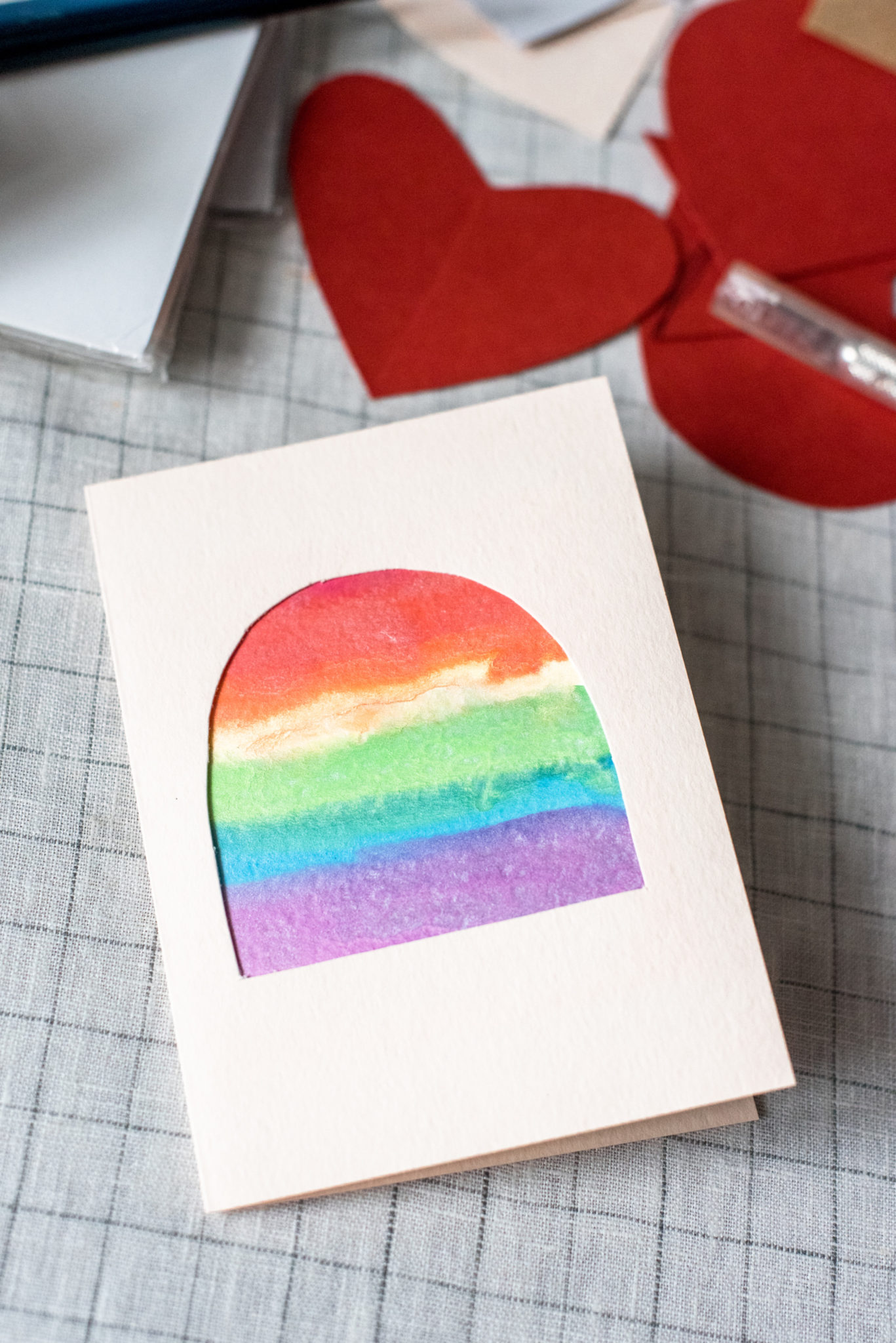 5. Choose which parts of your paintings you want to be the background of each of your cutouts and cut them into a small enough shape to fit inside the card, but big enough that it covers all of the open area of the cut out. Using your tape, tape your watercolor securely to the back of your cut out side. If you really wanted to hide the tape you could cut out another piece of card stock and glue it over the taped piece but I like the handmade look of this. And you’re done! Write your message and send off a little gift of handmade art to someone you love.