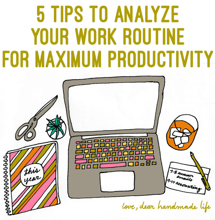 *Editor’s Note: One of my favorite things about a new year is sitting down and assessing my accomplishments from the previous year and dreaming up goals for the year to come. Our Dear Handmade Life contributor Erin has some great tips to help you analyze your working habits for a more productive new year. As creative entrepreneurs we’re often so focused on our to-do lists that we don’t make time to better our working process. Analyzing our working habits is essential to growing our businesses. I hope you all take on Erin’s challenge below and honestly evaluate your productivity and make adjustments through her five tips to analyze your work routine for maximum productivity. If you want more tips on productivity, goal setting and intentions, check out this post by Kari Chapin on setting intentions and accomplishing your goals or this post by Eleanor Whitney on how to make smart goals and don’t forget to congratulate yourself for your accomplishments by making a way-to-go list as Erin suggests in this post. Lately I’ve also been totally obsessed with Kari Chapin’s new podcast: AIM (Action Inspiration Mindset) especially this episode with Craftcation presenter Rosalie Gale who is a queen of goal setting and getting stuff done! Happy New Year! -Nicole S.