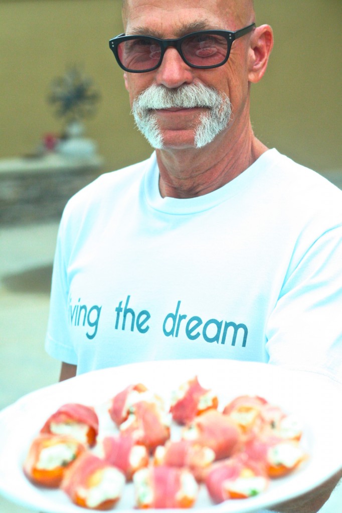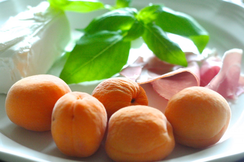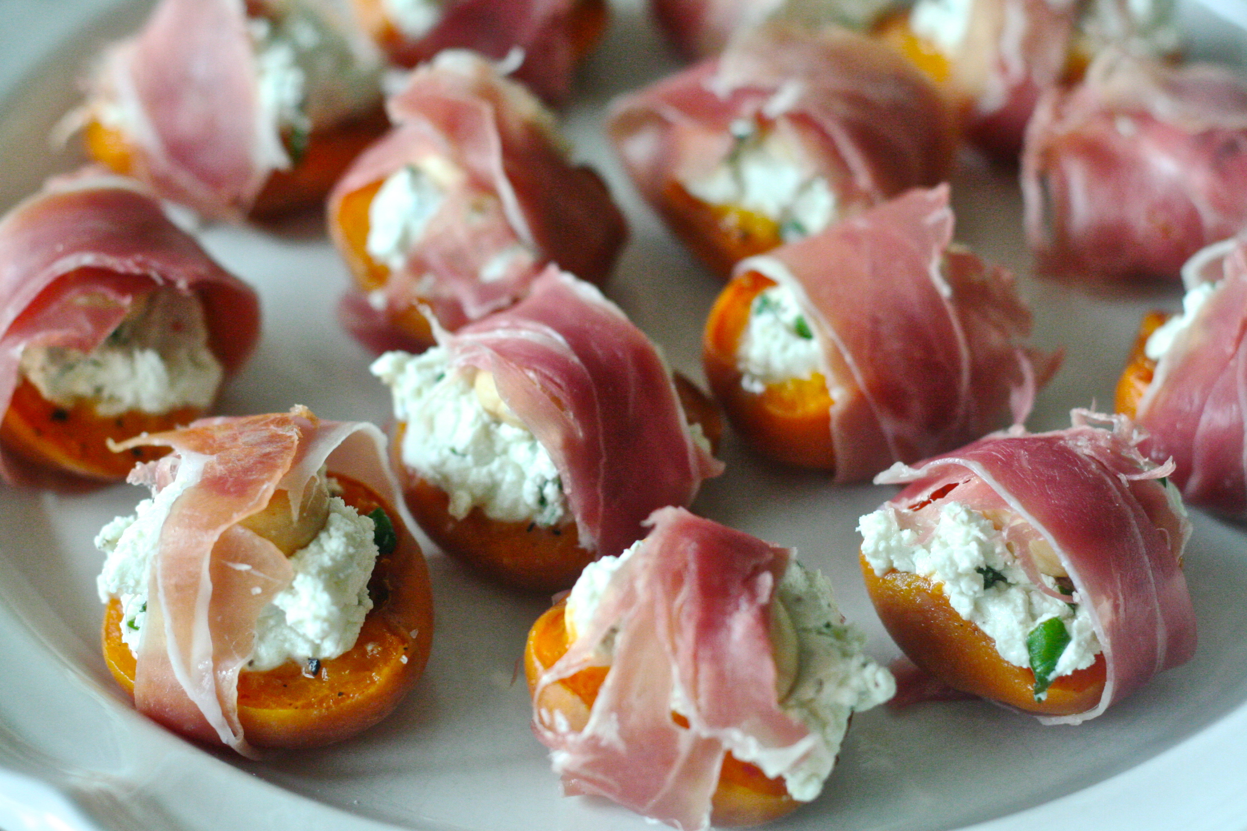 i made these lovely basil, goat cheese + marcona almond stuffed apricots wrapped in prosciutto a few weeks ago for a pool party at my parent’s house. they were a huge hit.
