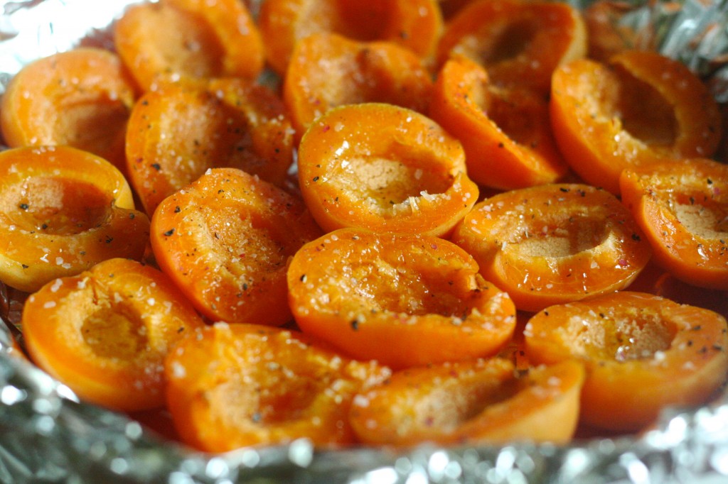 1. slice the apricots in half, remove the pits and lay them out on a foil lined baking sheet. Drizzle with olive oil. Sprinkle with salt + pepper. Bake at 350 degrees for about 20 minutes or until they soften but are still somewhat hard.