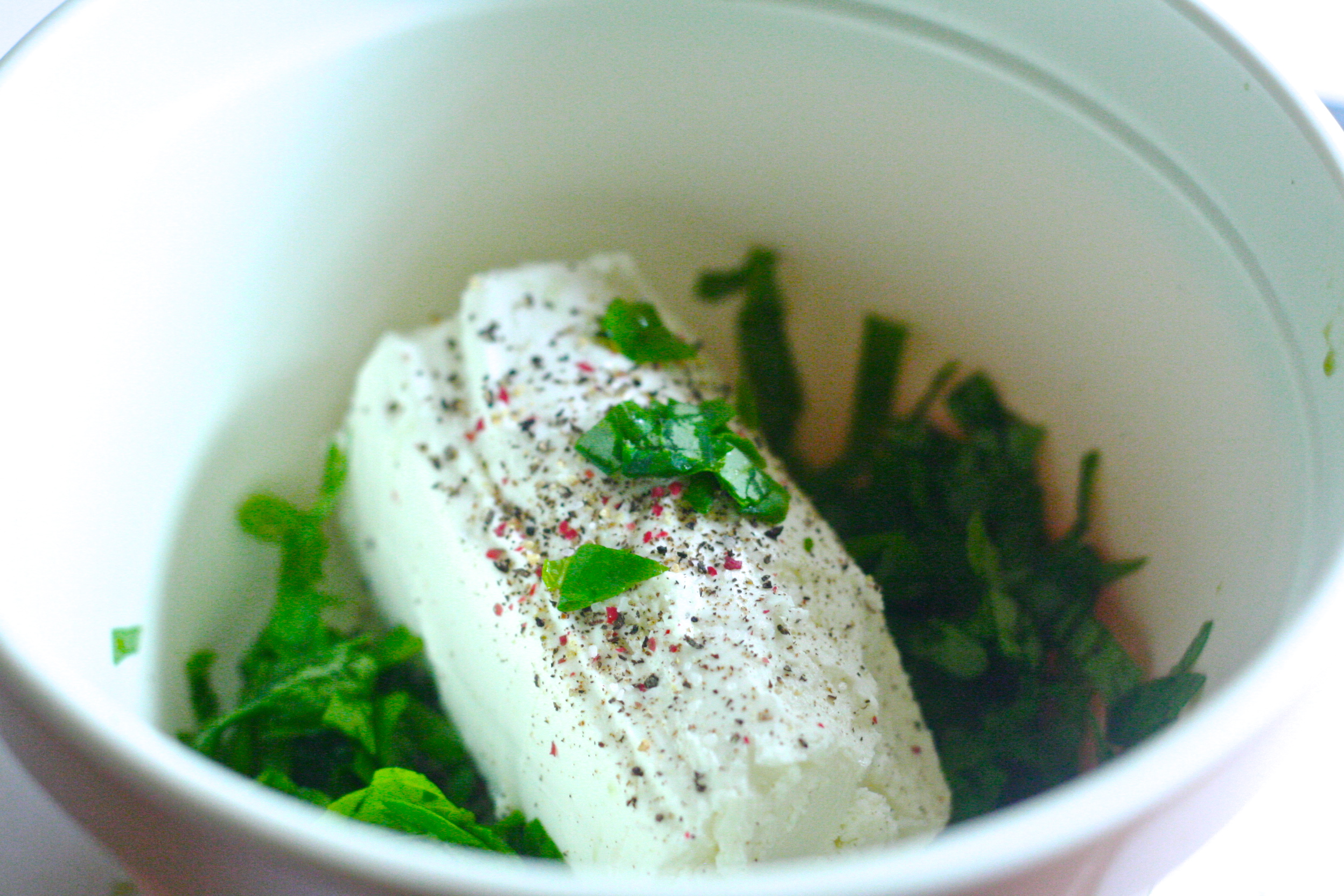 2. chop the basil and add to the goat cheese in a bowl. Add salt + pepper. Mix well.