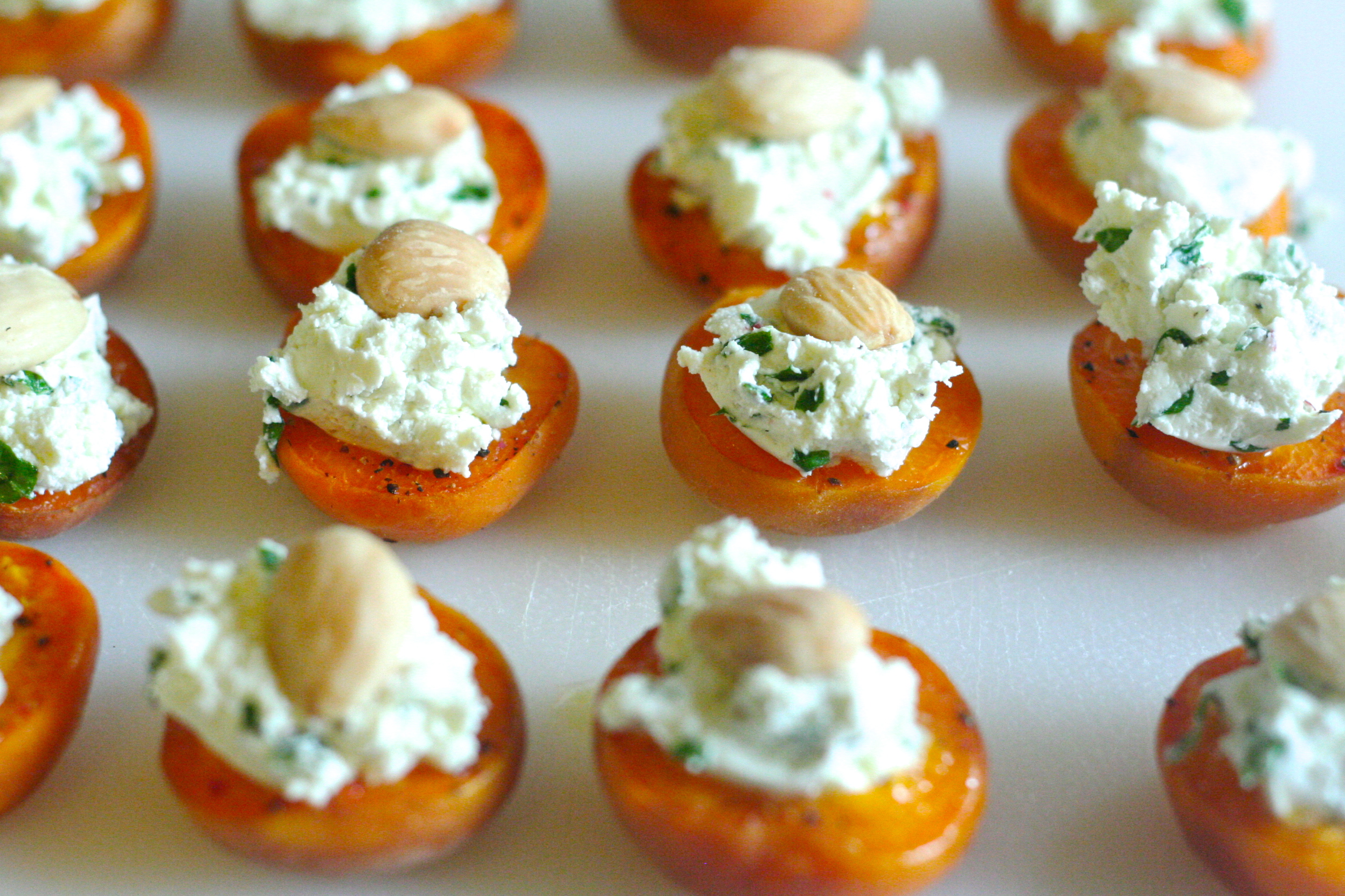 3. put a spoonful of the goat cheese + basil mixture in the hollow center of each apricot half.