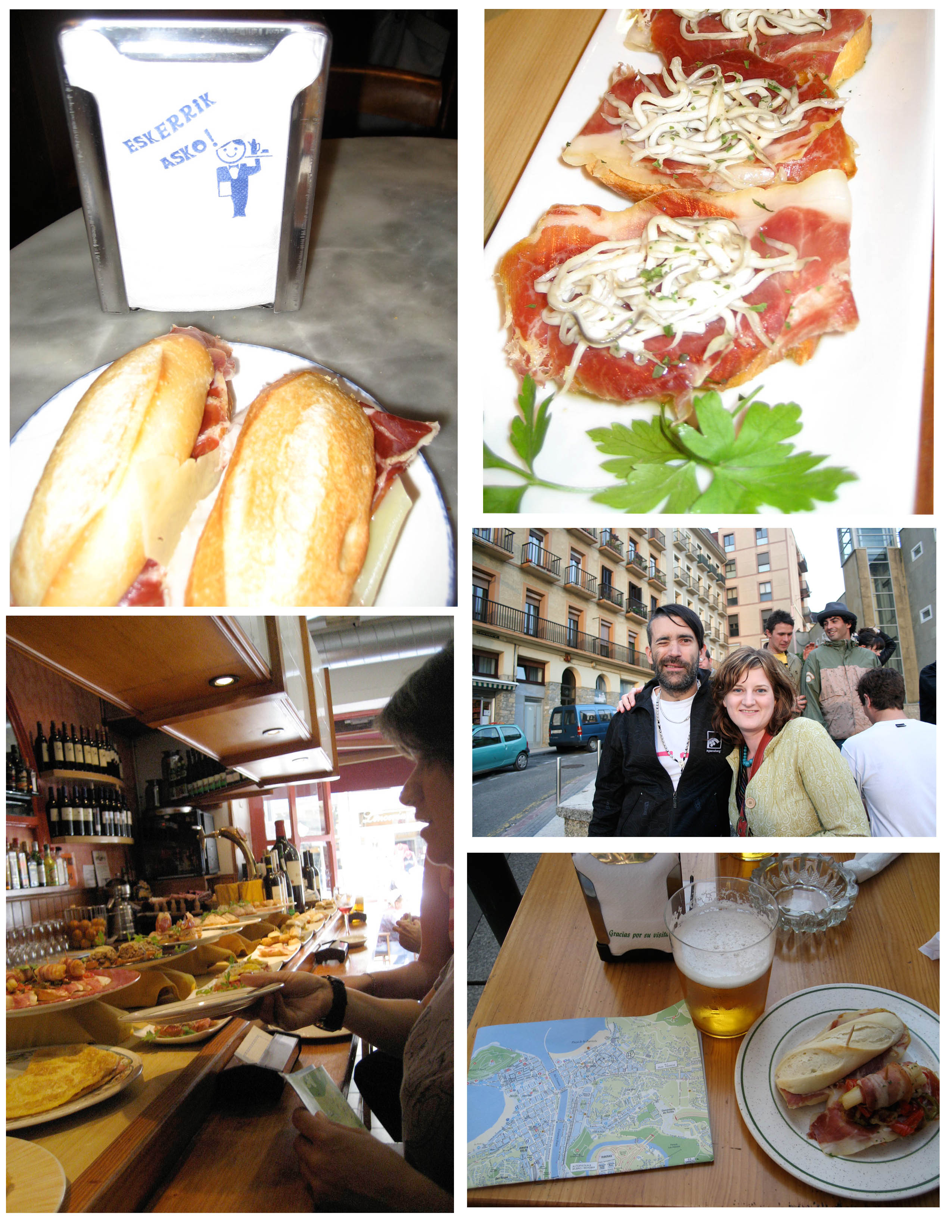 at the san Sebastián pintxo bars there is no menu, no ordering and no waiting. platters and plates full of bite-size pintxos (the basque version of tapas) await you under a canopy of dangling jamon legs. there is no bowl of ice under any of the fish, dairy or meats to keep them from spoiling. the jamon above you is unwrapped and in the open air steaming with fellow diners breath and cigarette smoke. growing up in house where any food item that sat out for longer than 15 minutes was then considered contaminated with bacteria and immediately thrown out, the lack of refrigeration was a bit difficult for me to ignore. my friend helen who’d traveled all over the world saw the look on my face and said, “i promise you’ll be fine, just eat.” and… i did. octopus ceviche. slices of bread with ham and hard boiled egg. salt cod tacos. wild mushrooms with foie gras mousse. briny olives. anchovies and pickled peppers. beef cheeks slow cooked in red wine. lots of tuna and copious amounts of paper thin iberico ham. i have always been a lover of appetizers but eating my way through the pintxo bars in san Sebastián brought my love of small plates to the level of religious devotion.