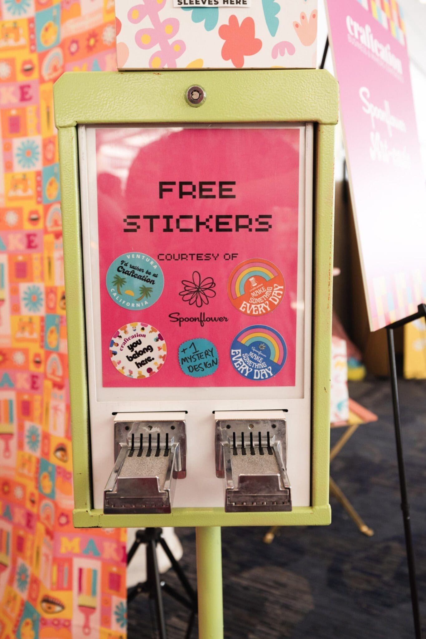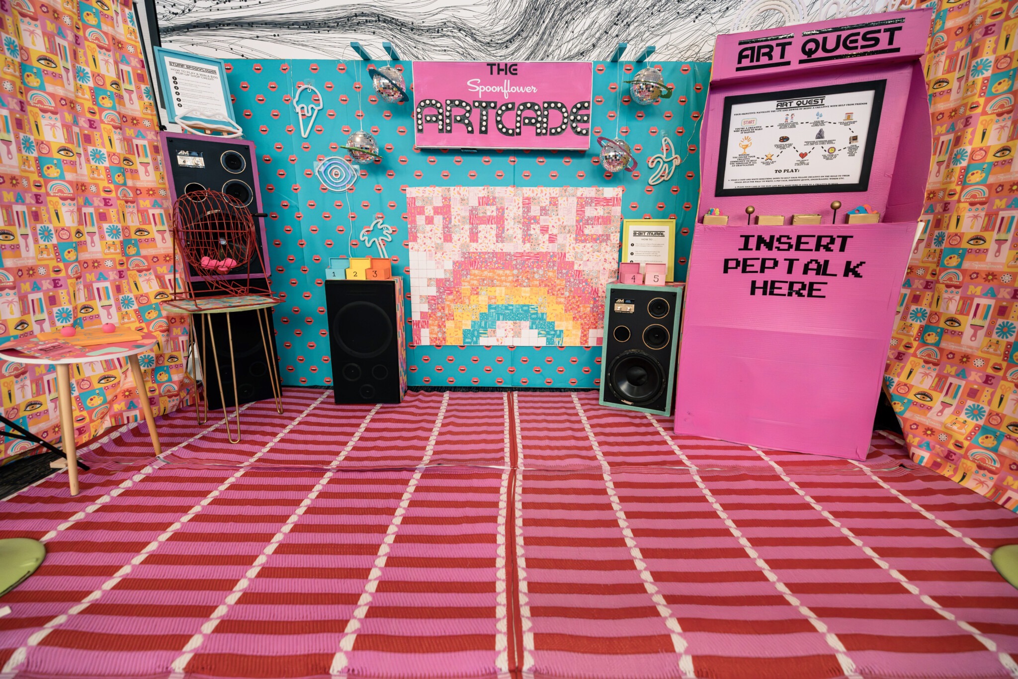 - The Spoonflower Artcade where attendees could “play” a DIY cardboard video game and create pep talks for creatives, use swatches of Spoonflower peel and stick wallpaper to create an 8-bit mural, play the Stump Spoonflower game and grab stickers I designed from the Spoonflower sticker vending machines. The wallpaper and curtains both featured patterns I designed and added to my Spoonflower shop.
