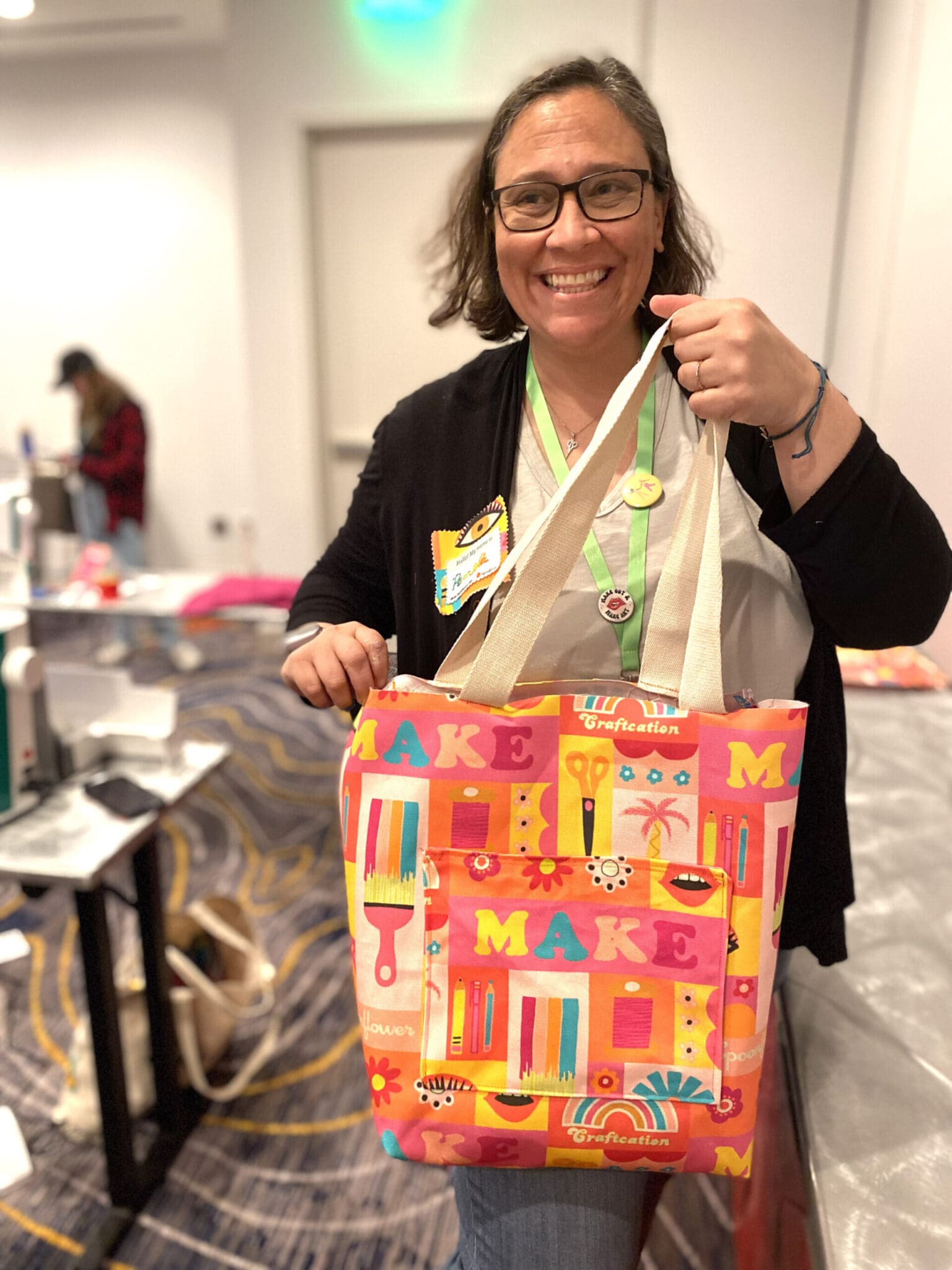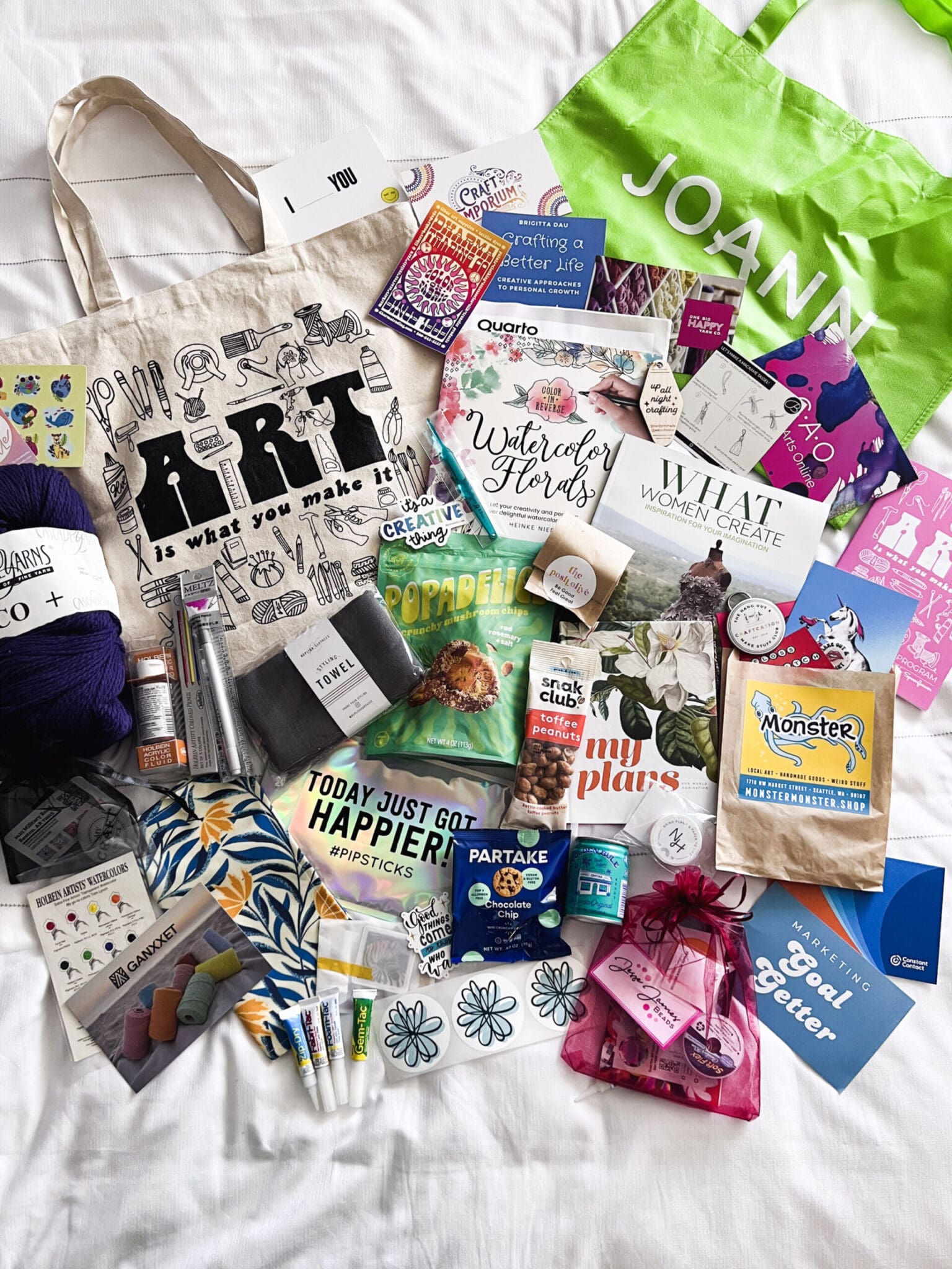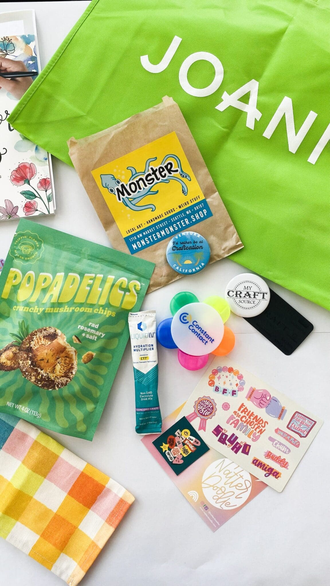 Our gift bag sponsor JOANN provided our awesome bags that we printed with the motto of Craftcation, Art is What You Make it. The bags overflowed with goodies from our sponsors including: Beacon Adhesives Co. Inc., Snak Club, Constant Contact, Popadelics, Golden Rule Spirits, HK Holbein Inc., JOANN Stores, Liquid I.V., My Craft Source, Replica Surfaces, Narrative Hues, NatterDoodle, One Big Happy Yarn Co, Pipsticks, Partake Foods, Replica Surfaces, Soft Flex Company, The Posh Olive, The Quarto Group, Monster & Ugly Baby, Walnut Hollow, and Women Create, plus coupons from Brigitta Dau Life Coaching, Rebecca Inkrote, My Scheduled Biz, Ganxxet, Craft Emporium, and Create Arts Online.