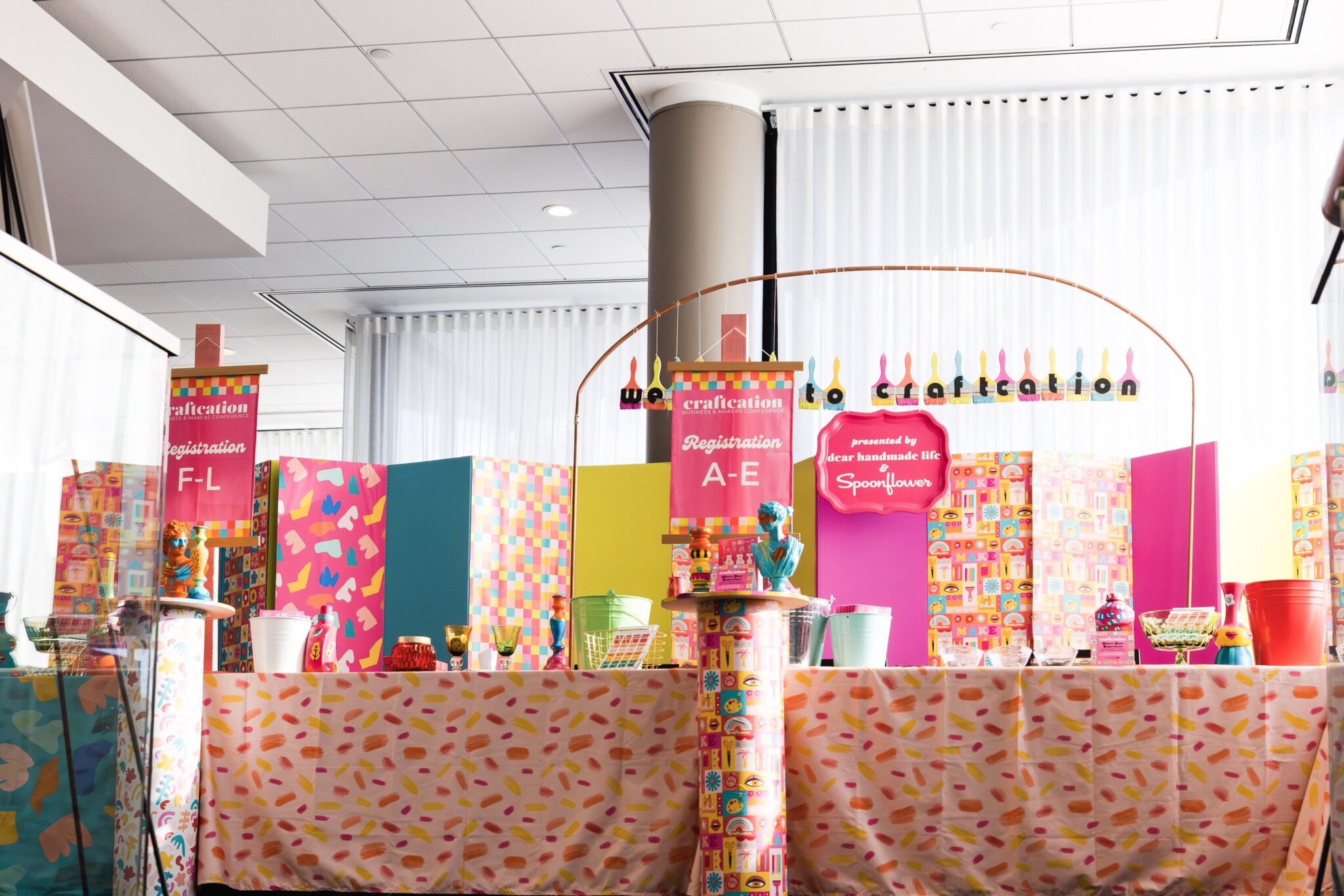 When attendees arrived at Craftcation they were greeted by our Welcome to Craftcation backdrop, featuring a design I illustrated and then printed onto a Spoonflower tablecloth that we turned into a big curtain. Upstairs, our smiling crew welcomed everyone to our registration area featuring wallpaper, tablecloths and wall hangings that I designed and printed with our presenting sponsor Spoonflower and pedestal and sign stands we created with Walnut Hollow and Handprint. Thanks to KatieMac for turning check-in digital and managing check-in and to MaryAnne who once again managed the gift bag assembly as well as helped people every chance she got.