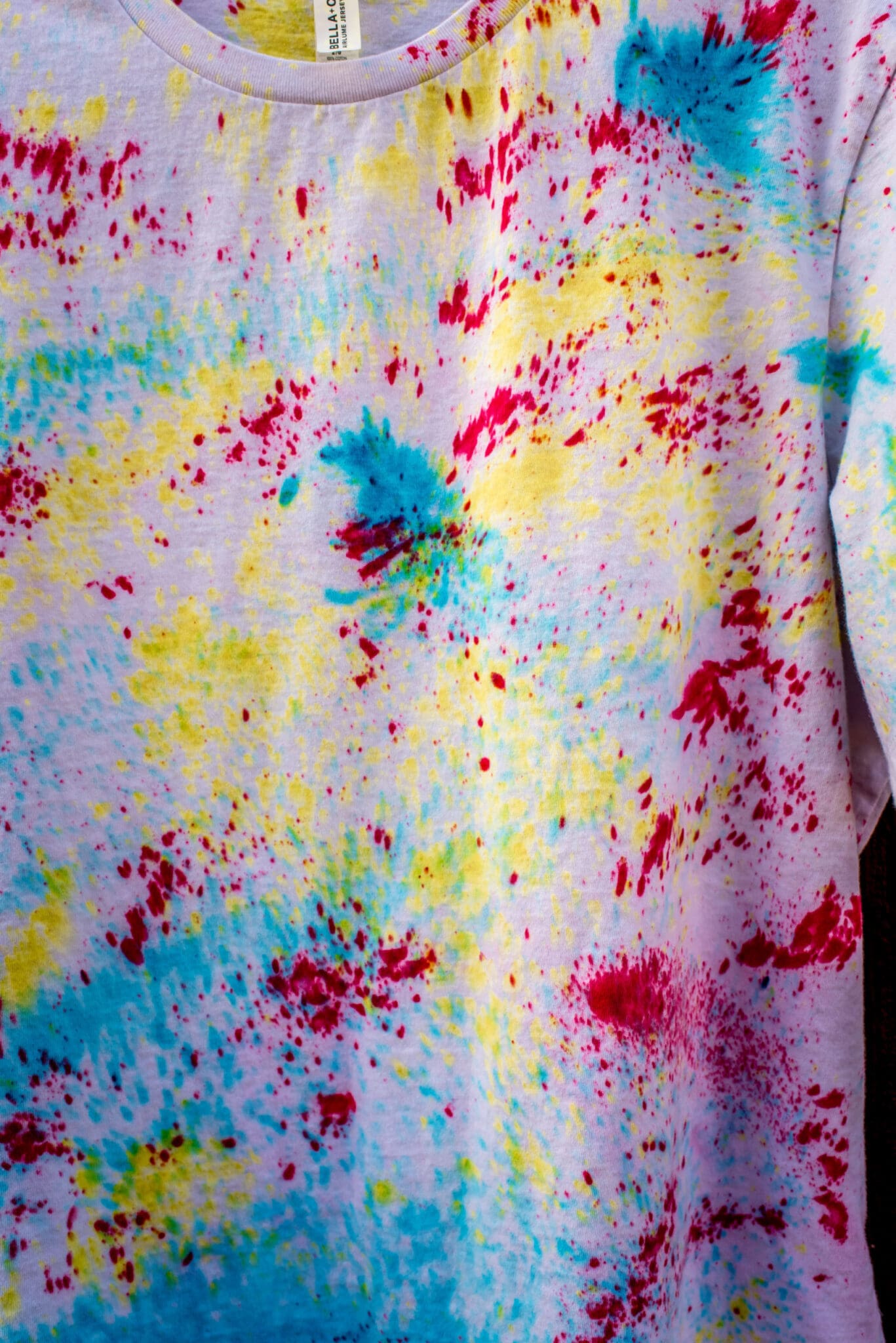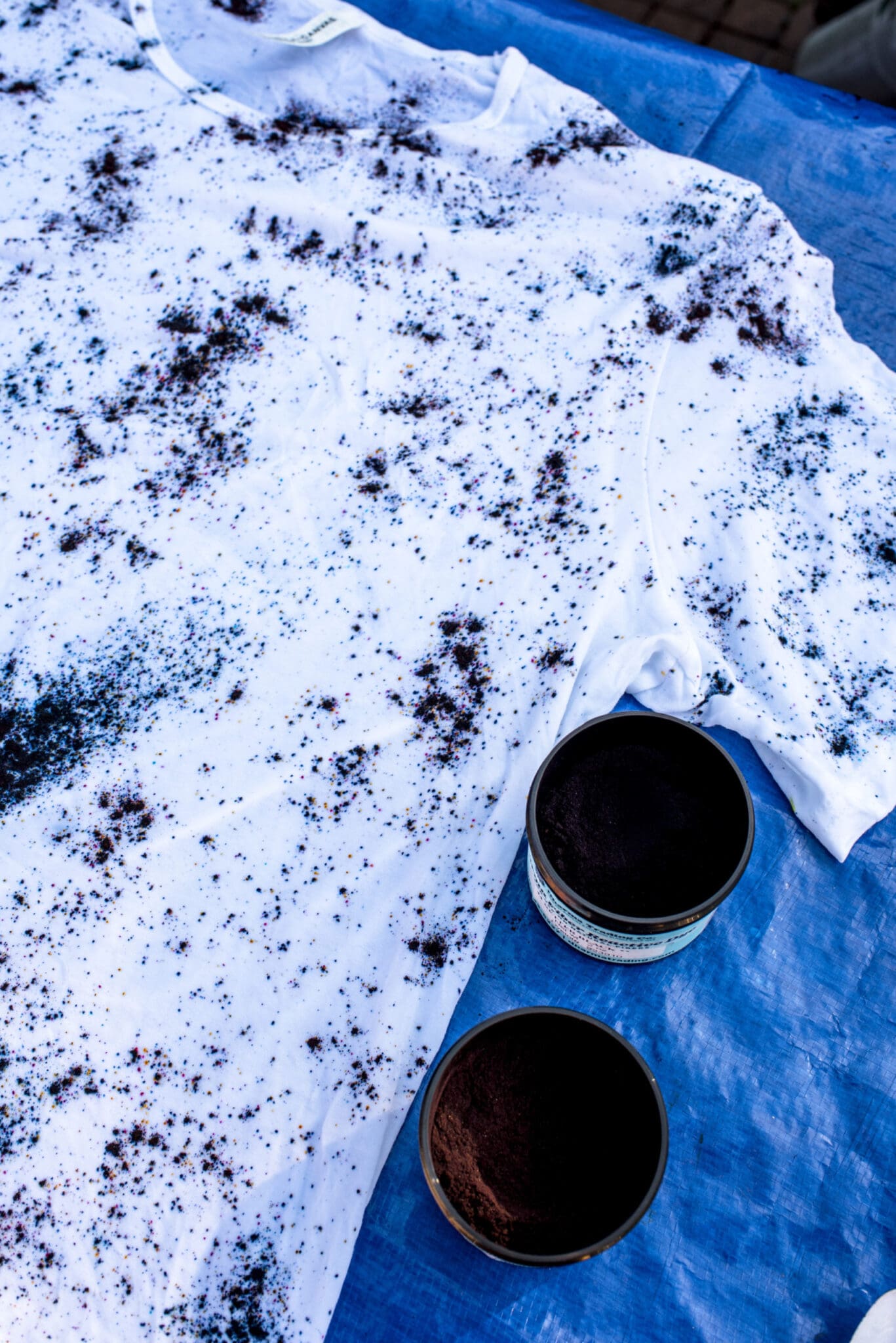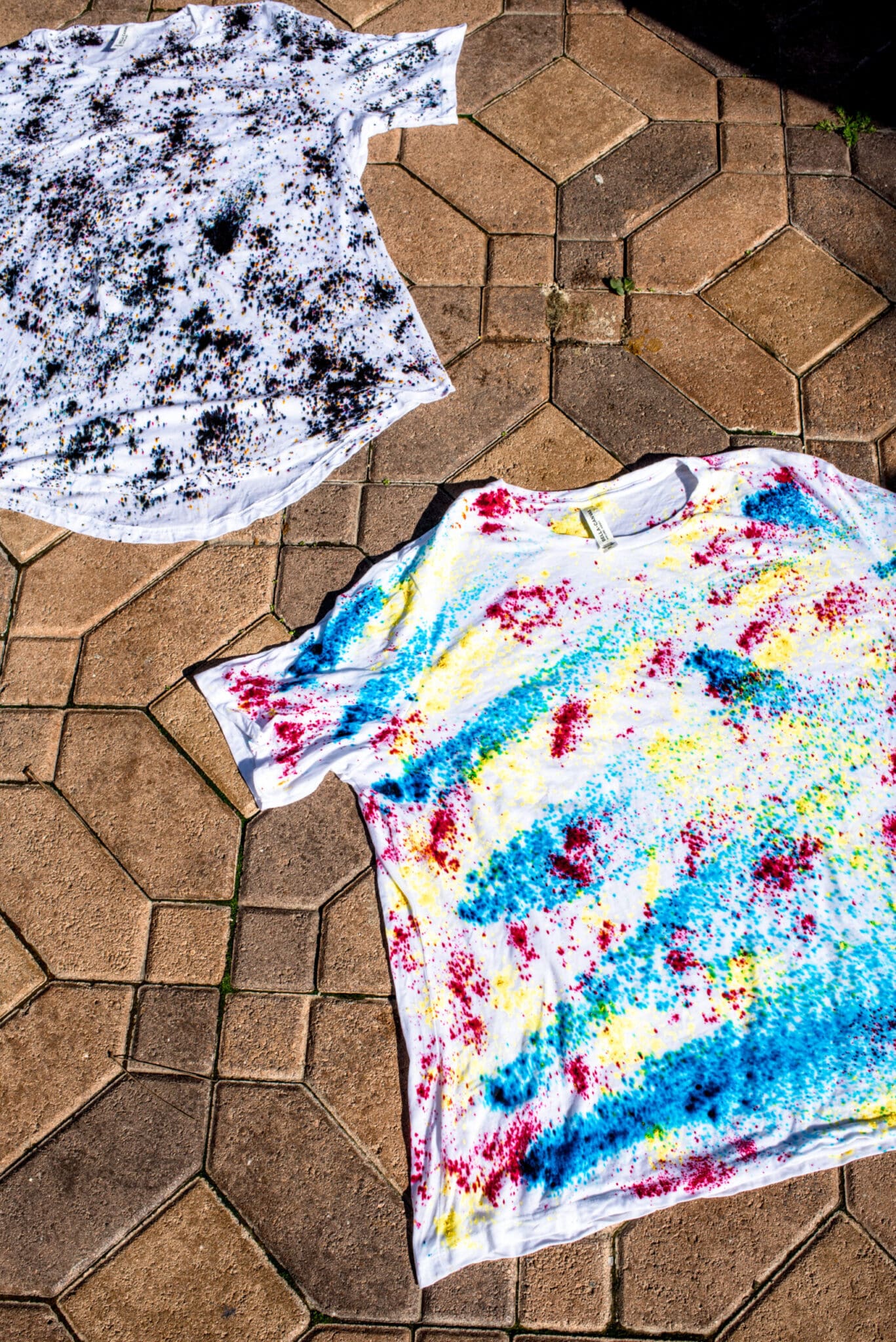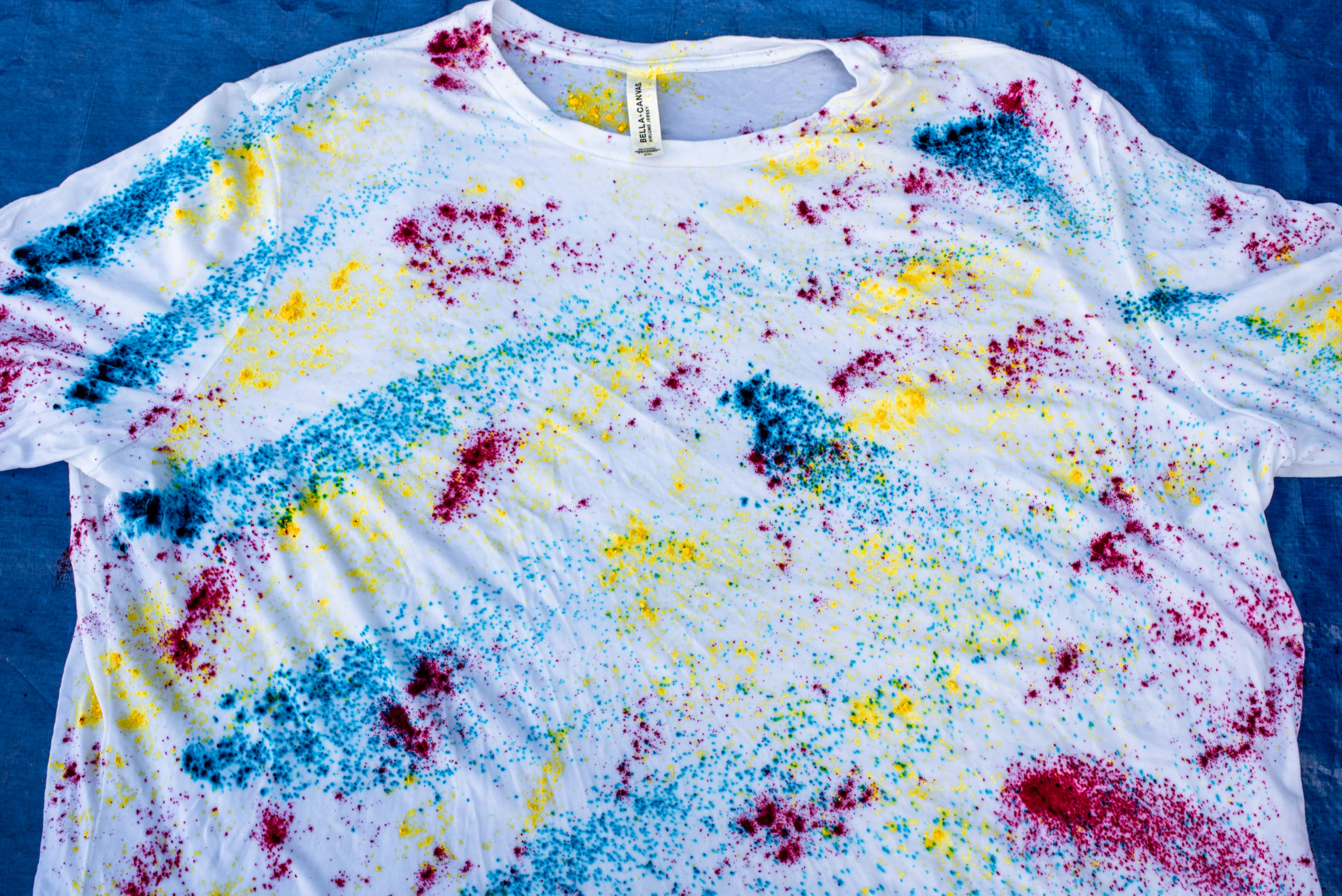 After your item is done soaking, wring it out until it’s just damp and lay it on your work surface (tarp or dropcloth). Get your colors out and start sprinkling! I chose the plastic spoon method because I felt like I had the most control with this. I held it up about a foot or 2 above my shirt to get a lighter dusting. For this first shirt I went with 2 different blacks to see how varied the results would be. I used Better Black and Raven. You can see the primary colors pop here too, it’s so cool to me! Once I sprinkled to my liking I set my shirt aside to dry a little.