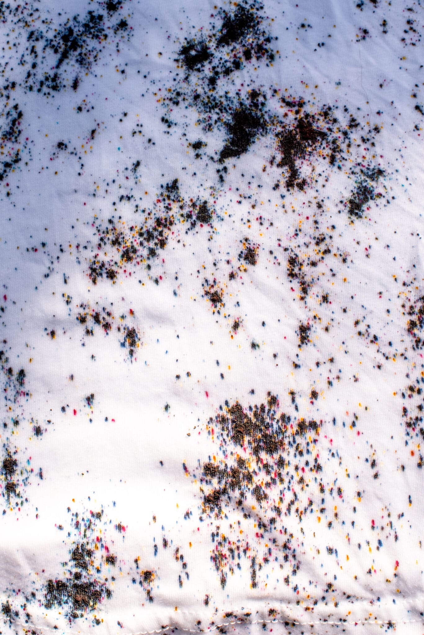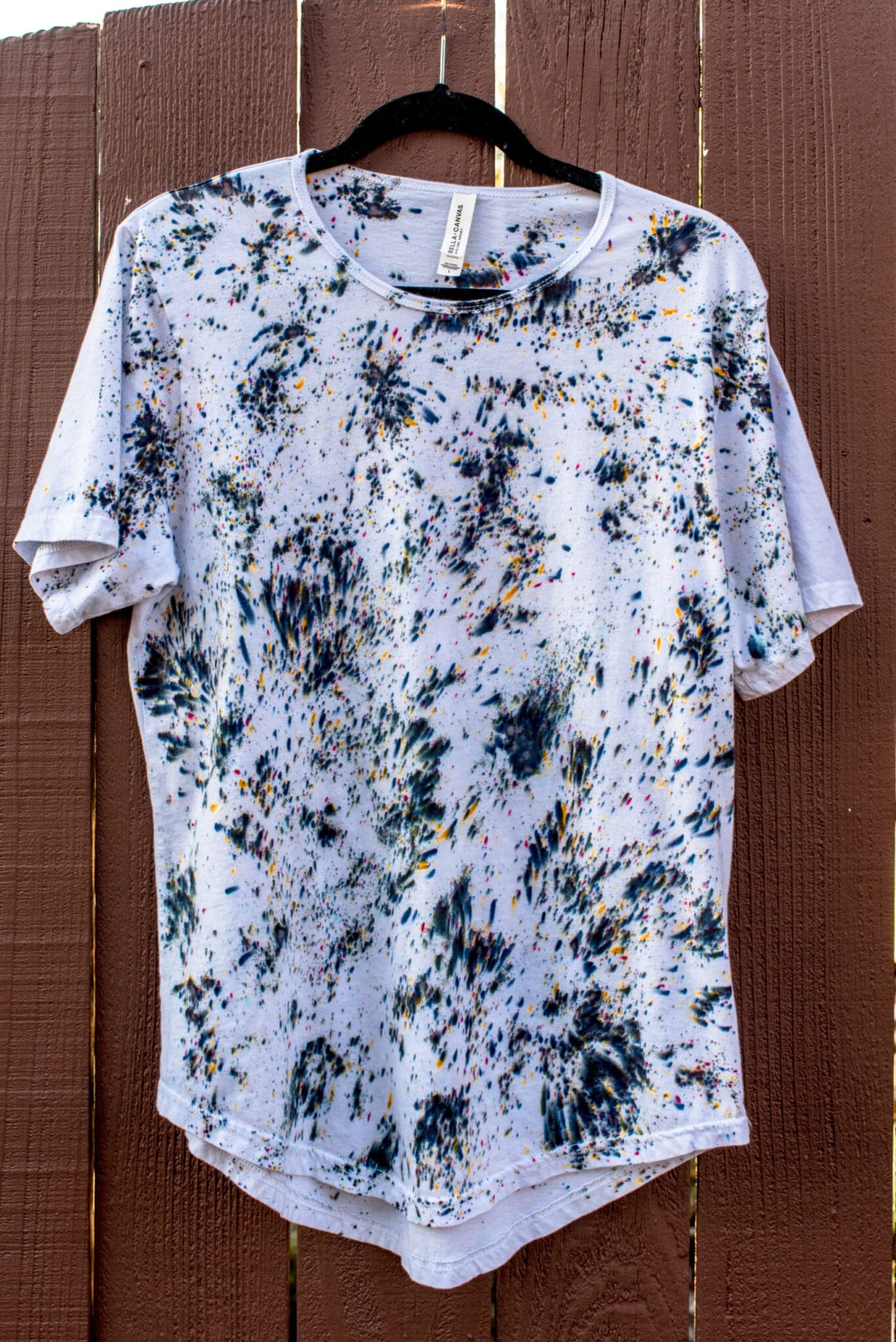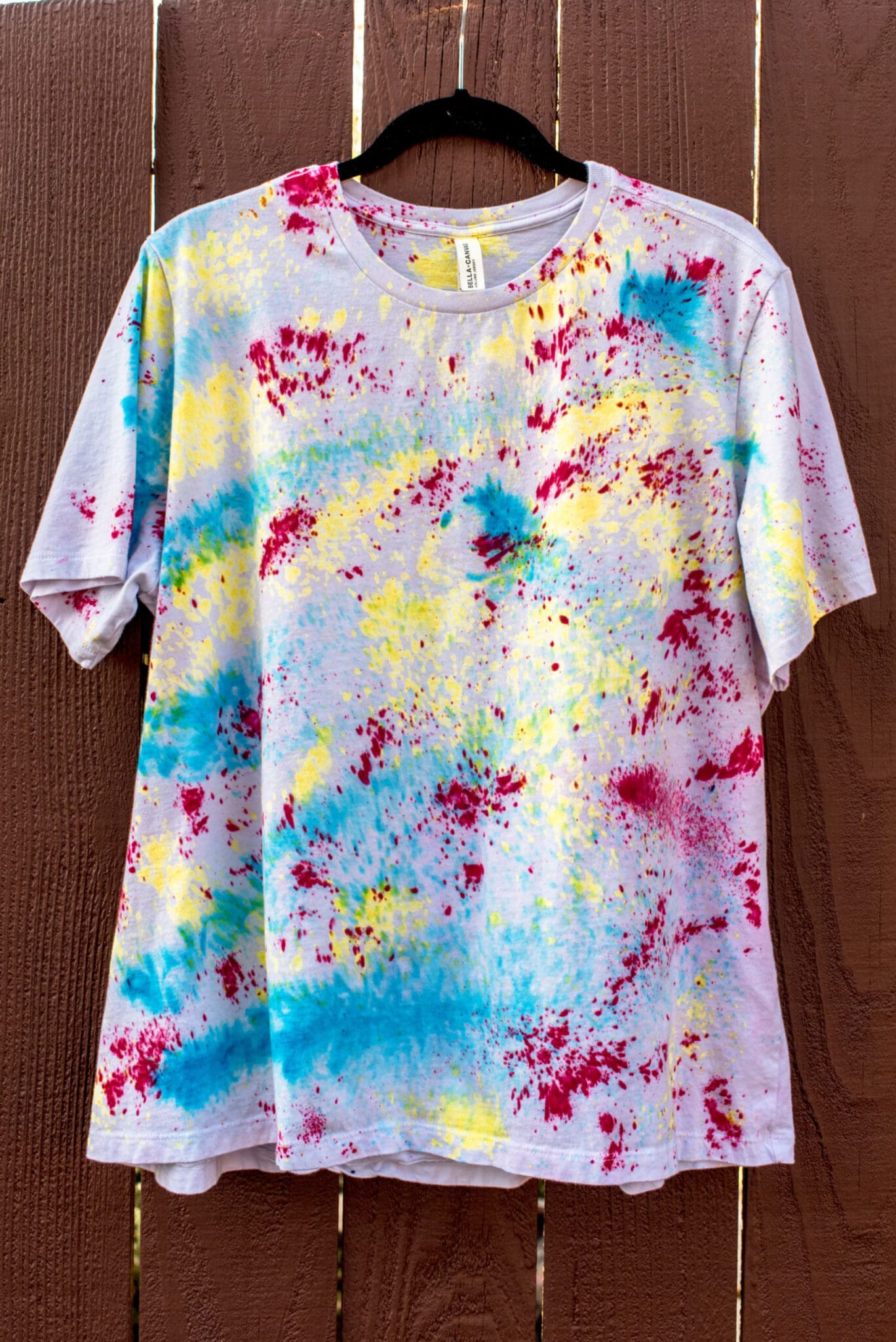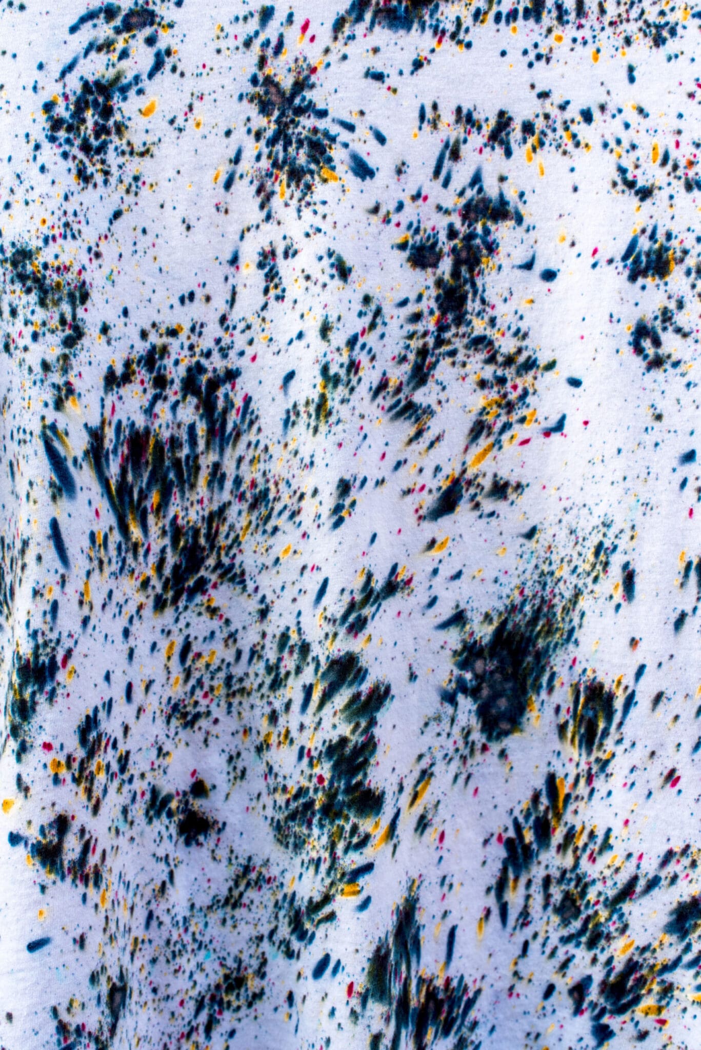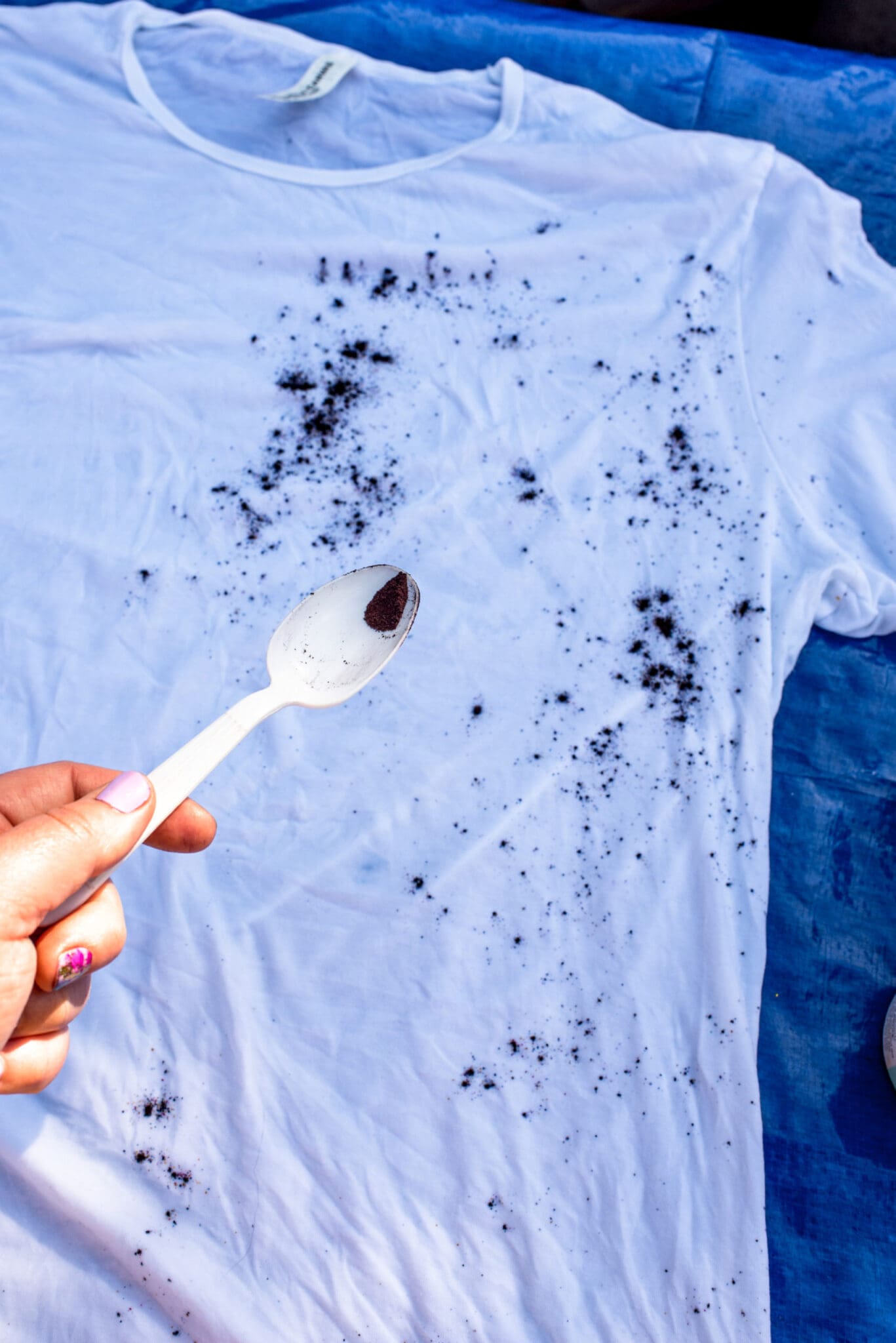 After your item is done soaking, wring it out until it’s just damp and lay it on your work surface (tarp or dropcloth). Get your colors out and start sprinkling! I chose the plastic spoon method because I felt like I had the most control with this. I held it up about a foot or 2 above my shirt to get a lighter dusting. For this first shirt I went with 2 different blacks to see how varied the results would be. I used Better Black and Raven. You can see the primary colors pop here too, it’s so cool to me! Once I sprinkled to my liking I set my shirt aside to dry a little.