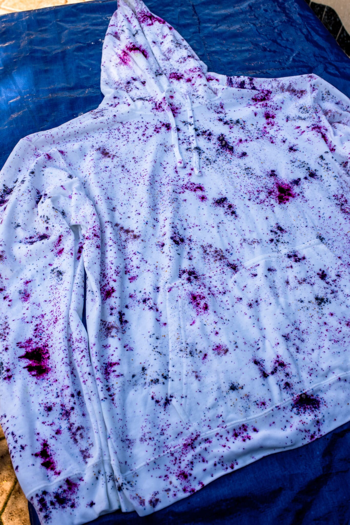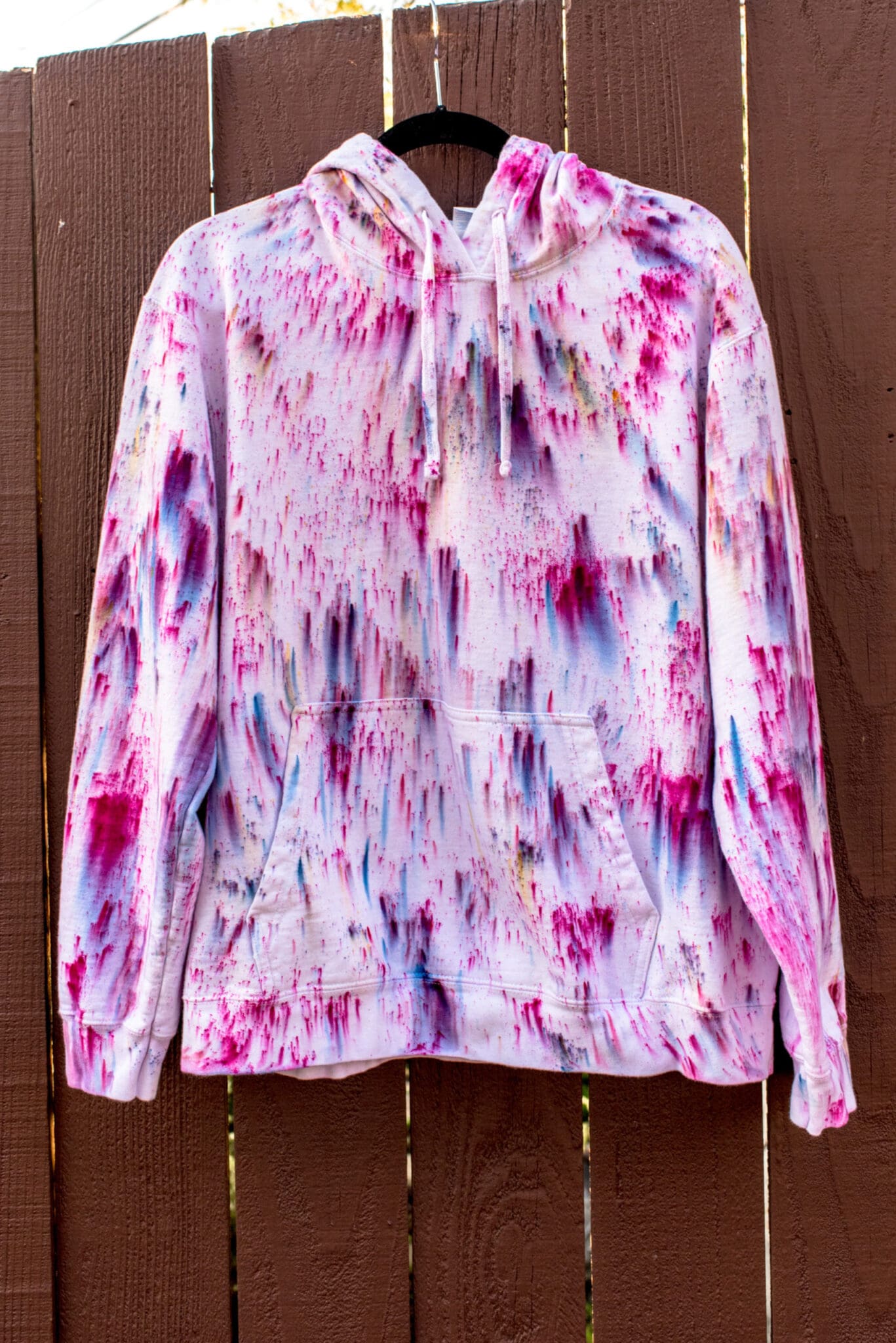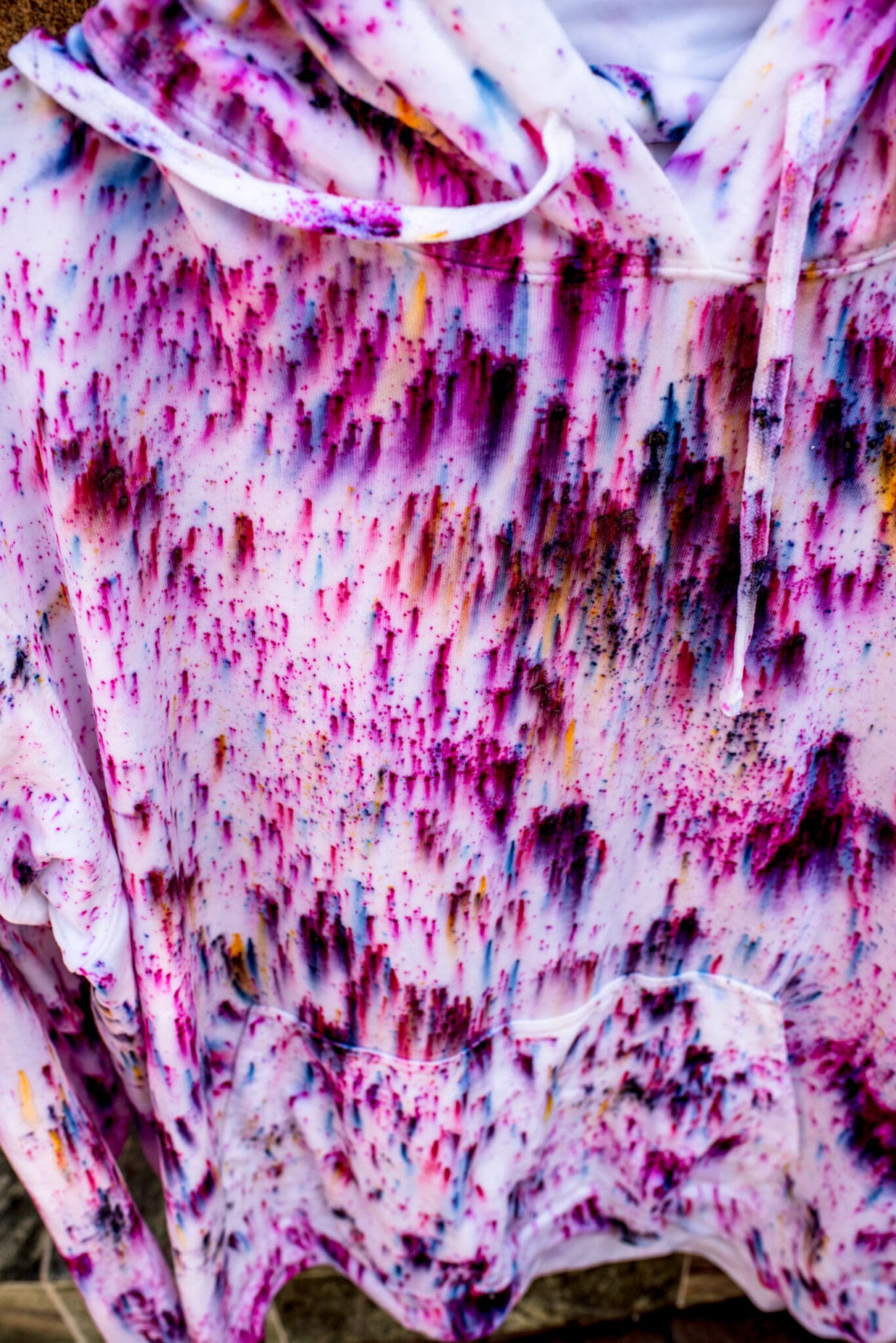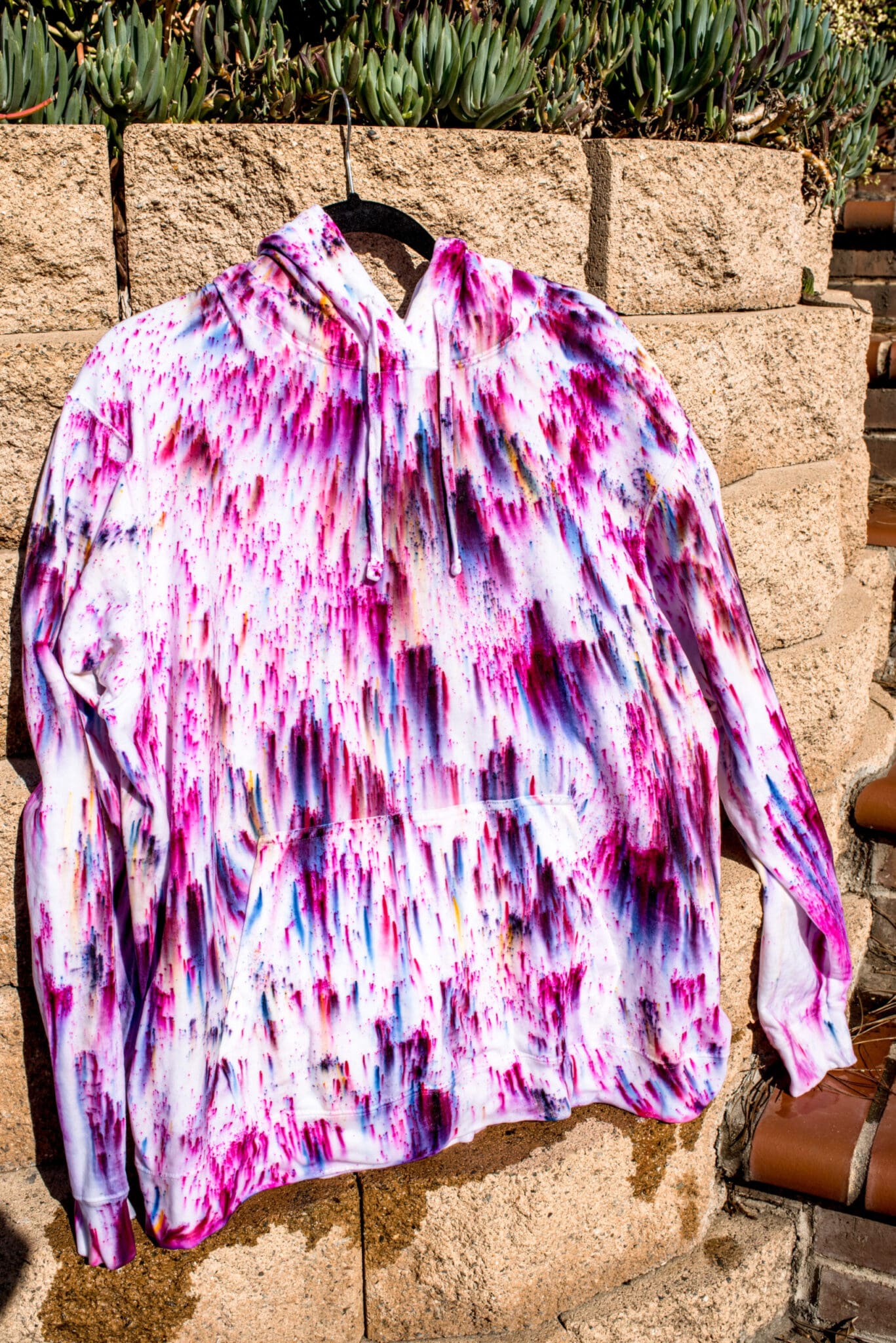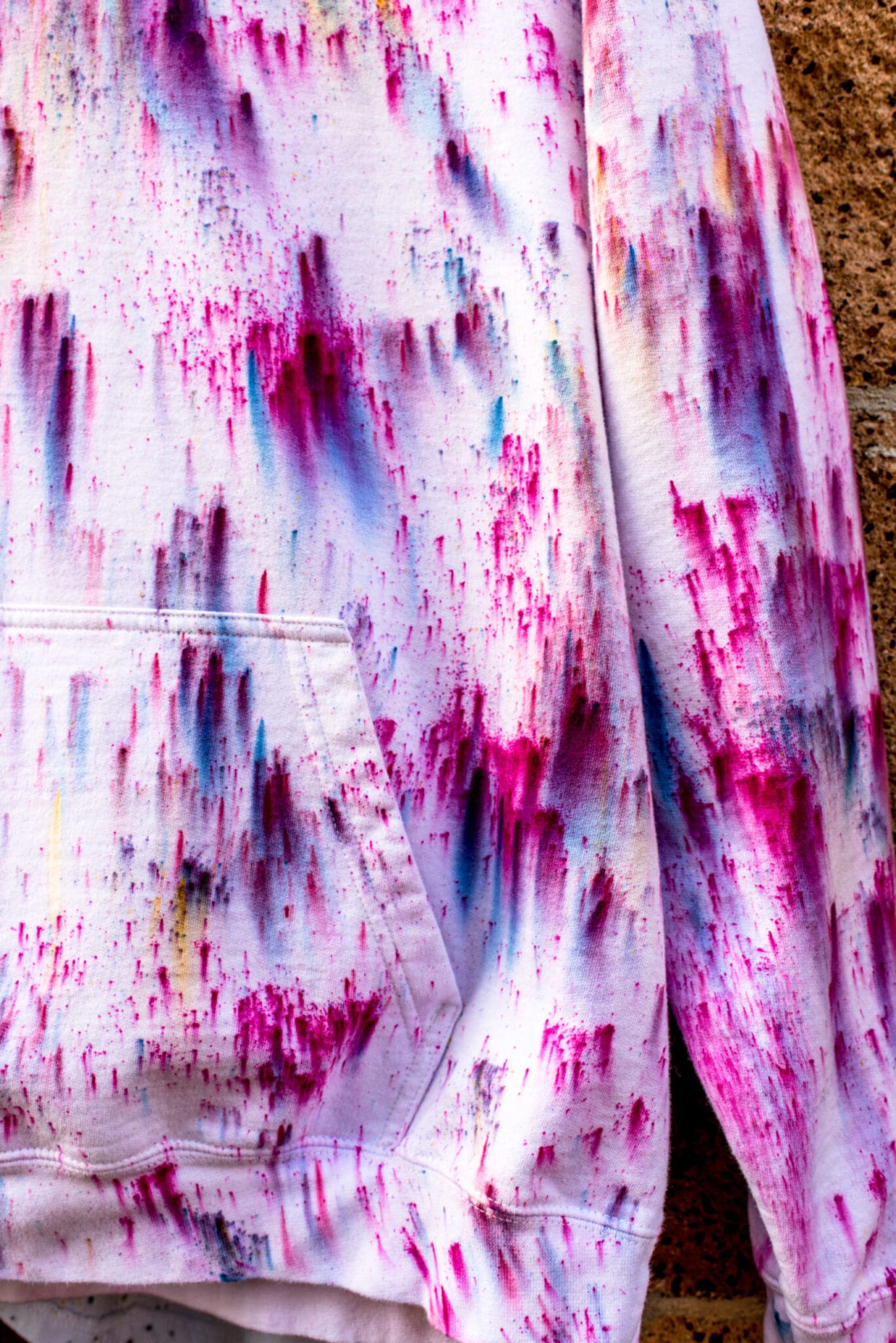 For the hoodie I used the colors Mist Gray, Powder Pink, Amethyst & Orchid. I used the same basic technique however when I had sprinkled all of the colors to my liking, I actually hung it up outside to dry for a bit. Hanging it caused the dye to streak downward & I love this result the best! It looks like watercolor brush strokes to me.