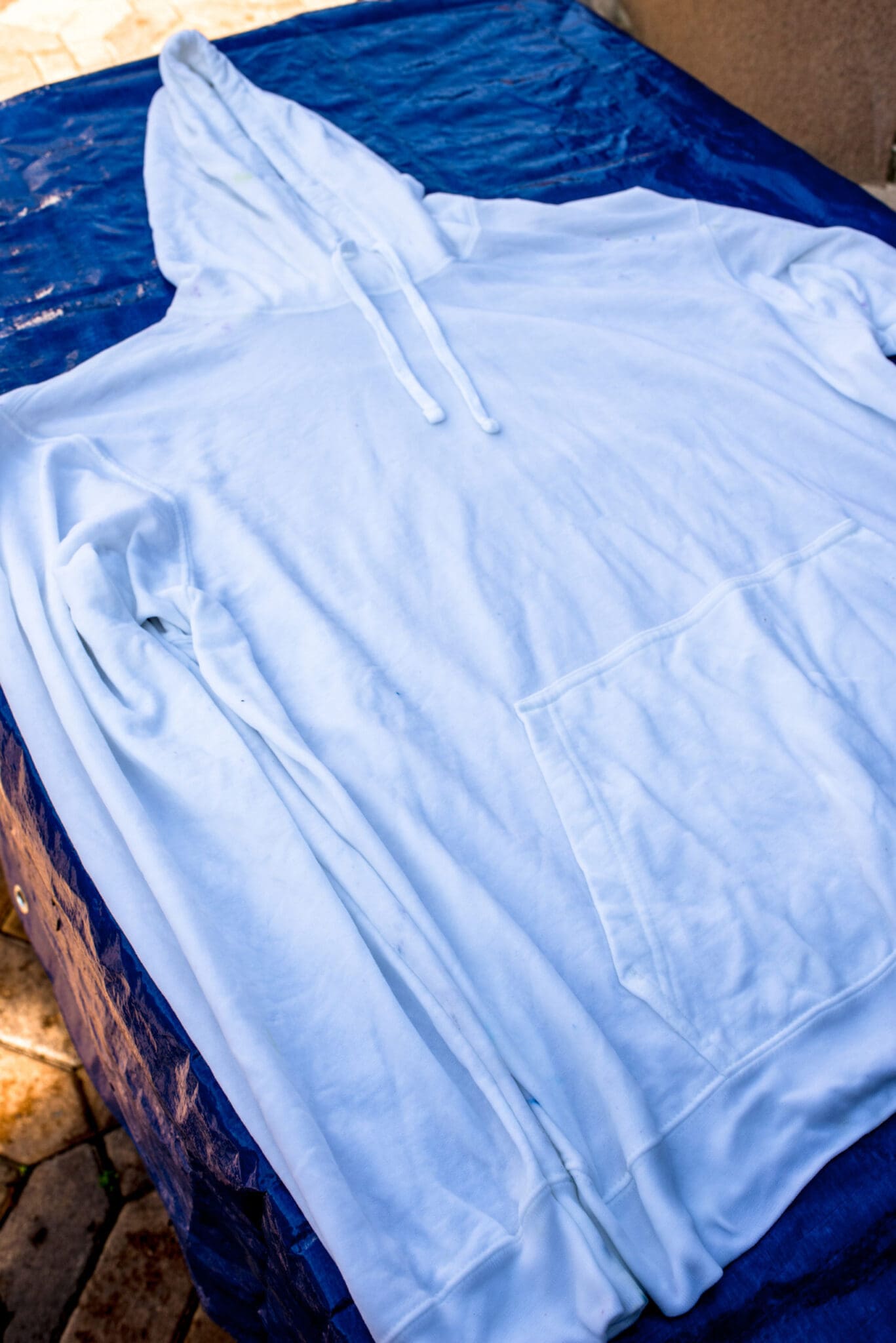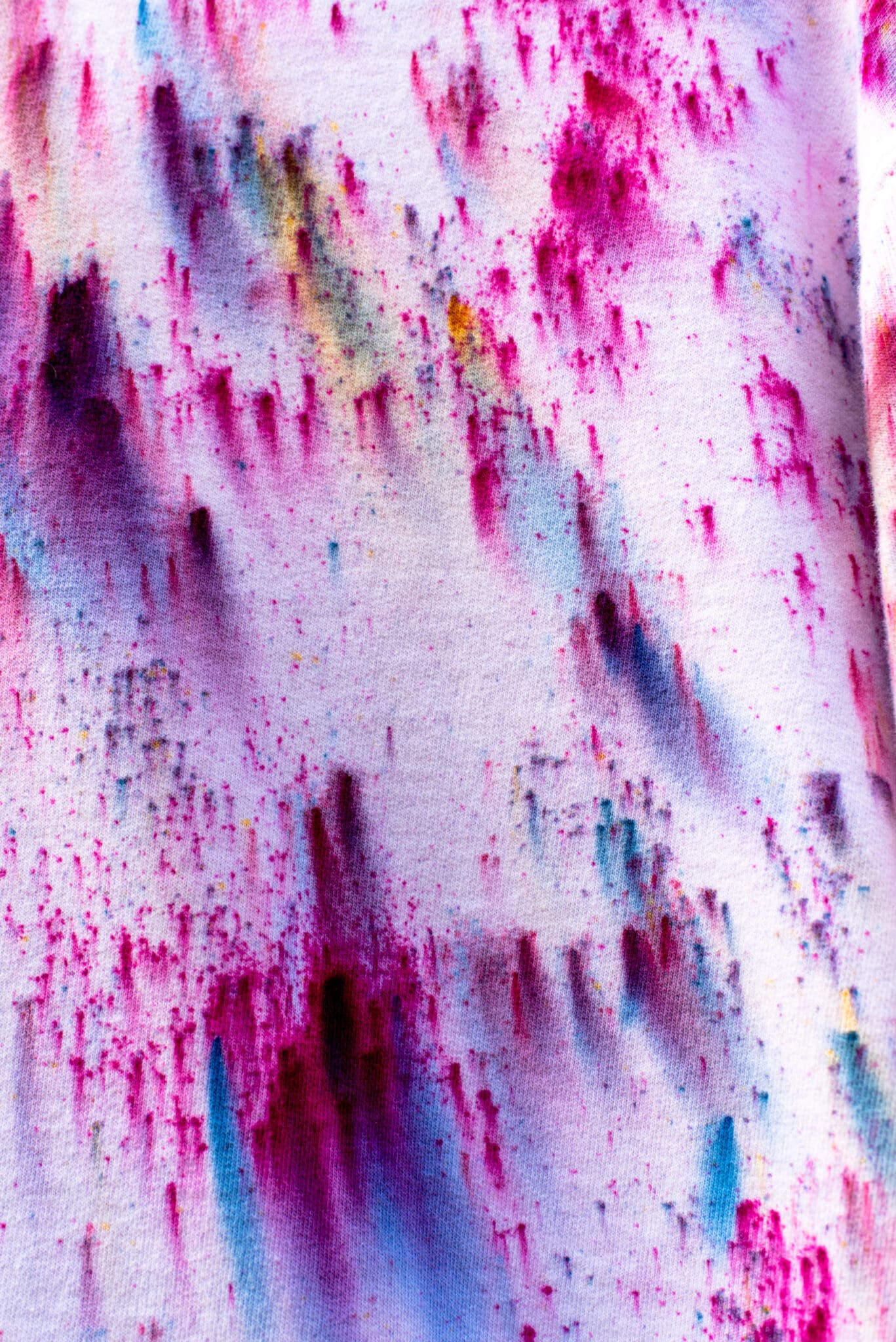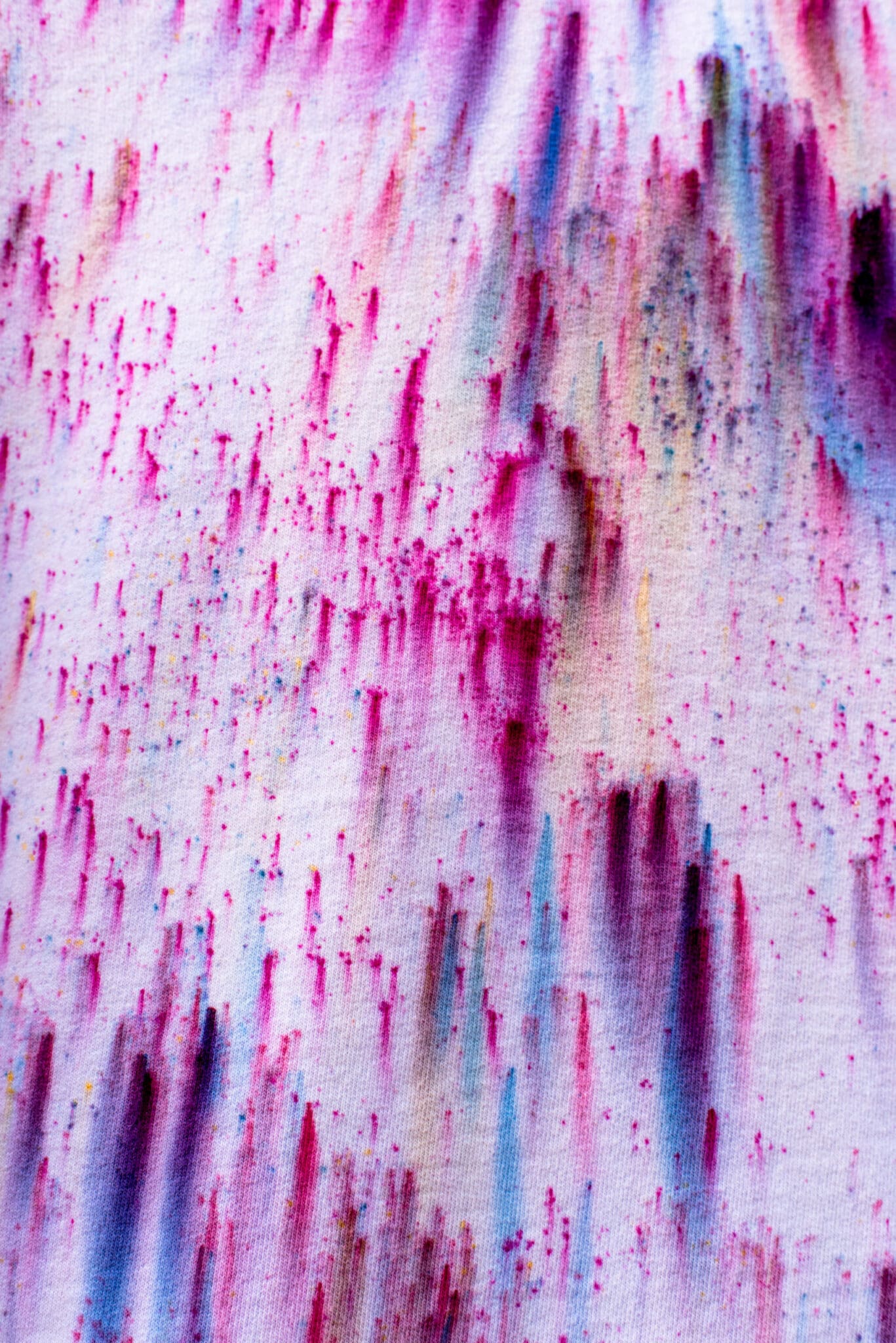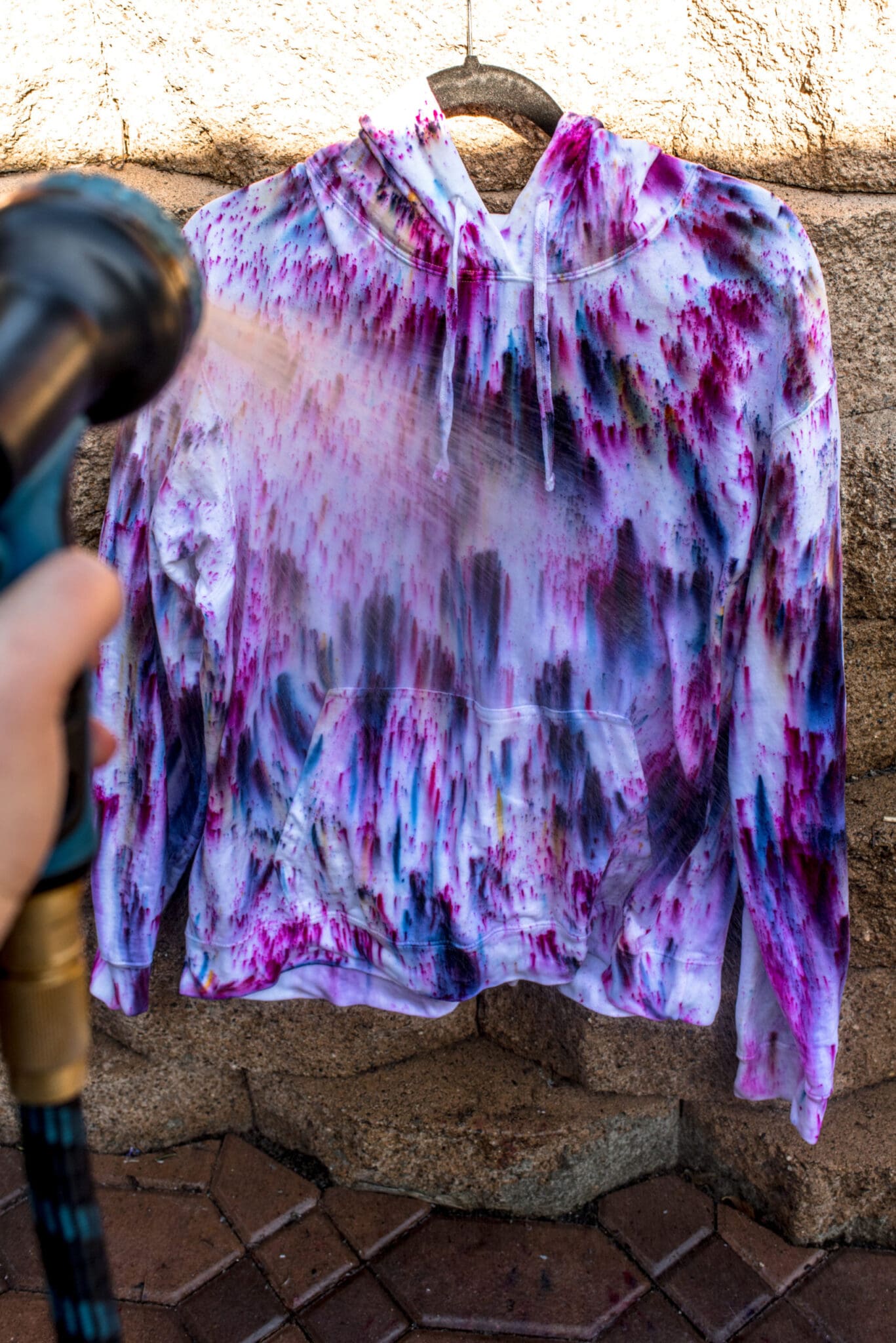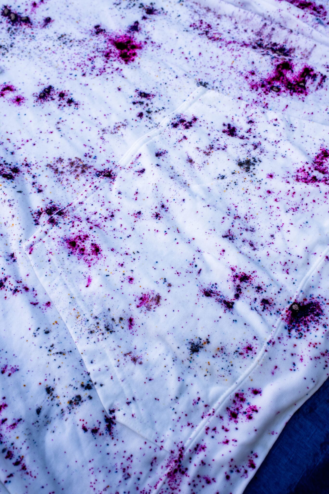 For the hoodie I used the colors Mist Gray, Powder Pink, Amethyst & Orchid. I used the same basic technique however when I had sprinkled all of the colors to my liking, I actually hung it up outside to dry for a bit. Hanging it caused the dye to streak downward & I love this result the best! It looks like watercolor brush strokes to me.