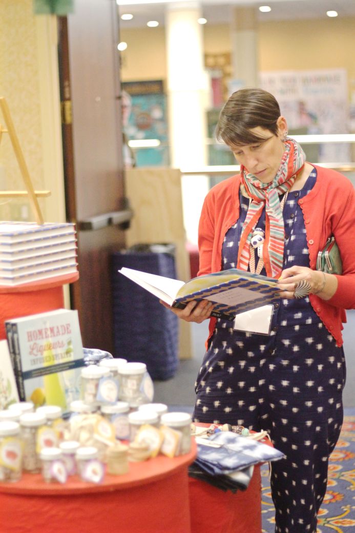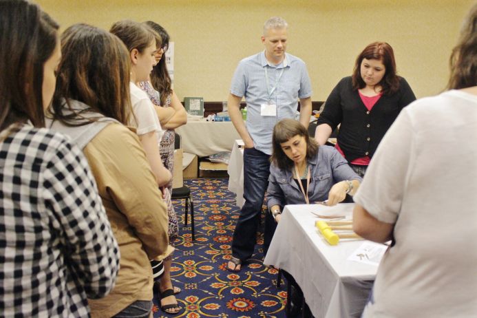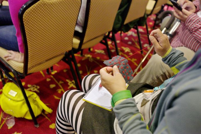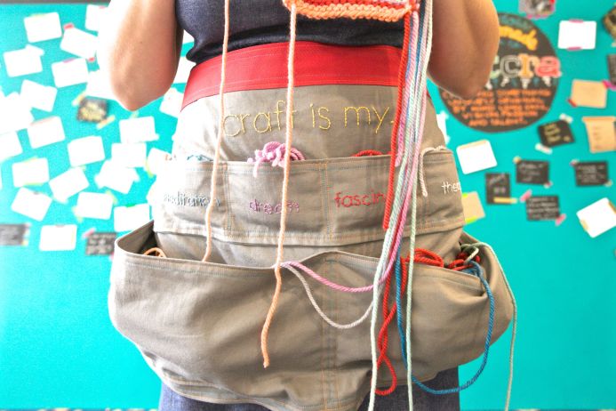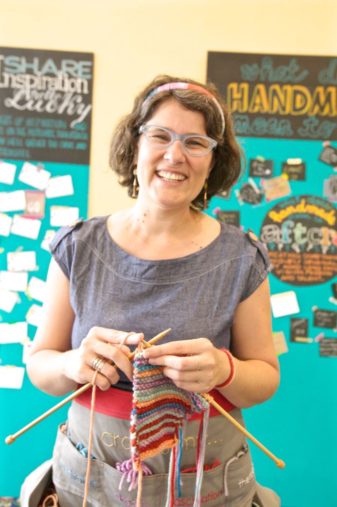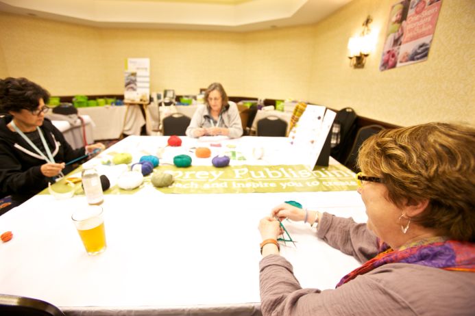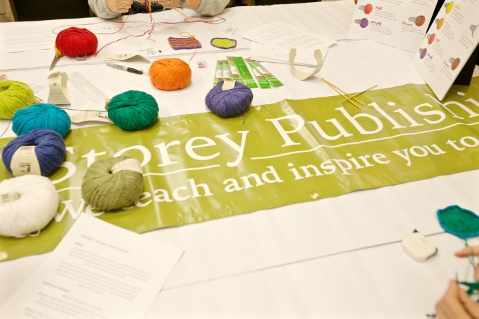 Storey Publishing author Lea Redmond of Leafcutter Designs debuted her handmade apron and traveling knitting project during which she knit attendees answers to the question “why do you craft?” in a yarn color that coordinated to their answer.
