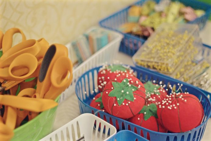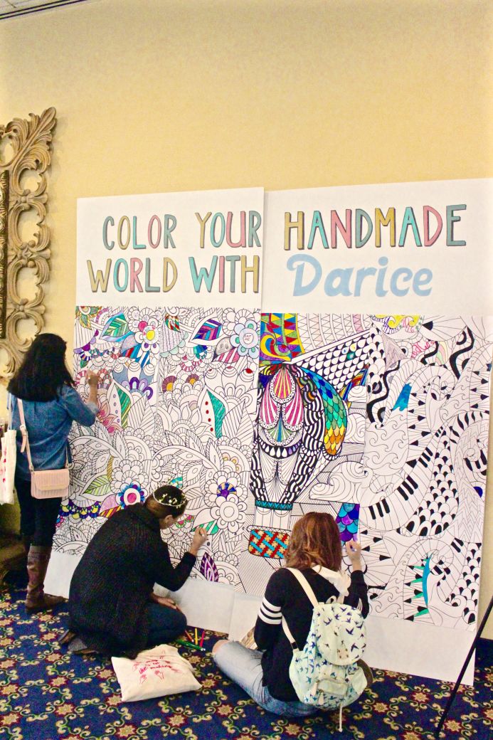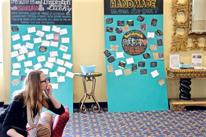 Our marketplace lounge was a place for attendees to meet and relax between classes, sign up for office hours, exchange business cards, color on Darice’s giant mural, create inspirational postcards for the Write On Campaign with Hello!Lucky and Sakura of America (which we’re randomly sending to attendees), explain what handmade means to you on aftcra’s interactive board and explore Bernina sewing machines.