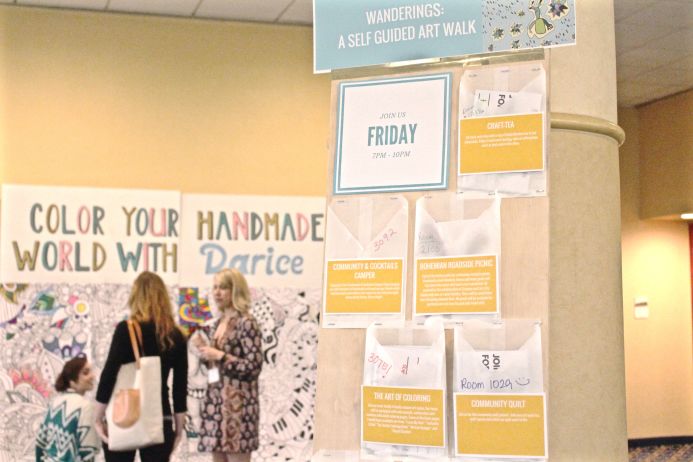 One of the new things this year was Wanderings: A self-guided art walk that was the brainchild of five-time Craftcation presenter Rosalie Gale. Attendees and presenters had the opportunity to create experiences (including a holiday-themed room, pop-up shops, photo booths, tarot reading and tea tasting and a handmade quilt that attendees decorated) in their hotel rooms which attendees wandered in and out of getting their ‘passports’ stamped at each room. Everyone (with the exception of non-Craftcation hotel guests) loved Wanderings. We’re hoping to bring it back next year if we can manage to do it without disturbing other guests. BIG thanks to all of the wanderings participants who put so much love and thought into their rooms especially the gorgeous quilt which Delilah and I will cherish for years.