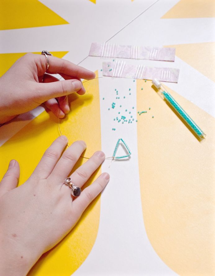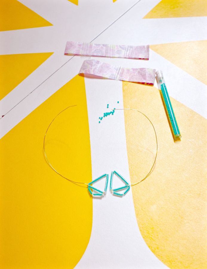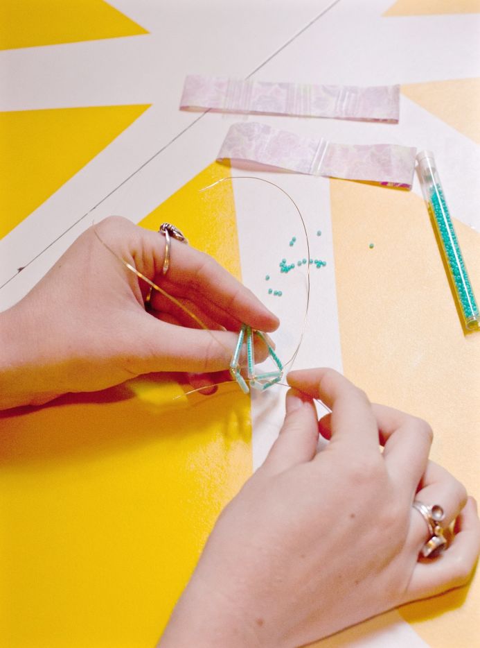 2. Cut a piece of wire, around 8 inches and begin to string the beads on. You’ll need enough beads to string two 1in. straws and one 21mm straw over the beads. It should be done in that order (1in, 1in, 21mm). Make sure to leave one side of the wire long and don’t overcrowd the beads inside the straws, a little wiggle room is good. Once they’re strung, bend the wire between each straw to make a triangle. Take the short end of the wire and wrap it around the long end of the wire to secure the triangle.