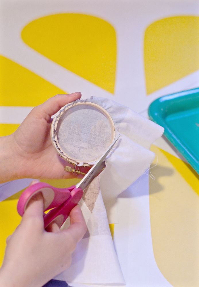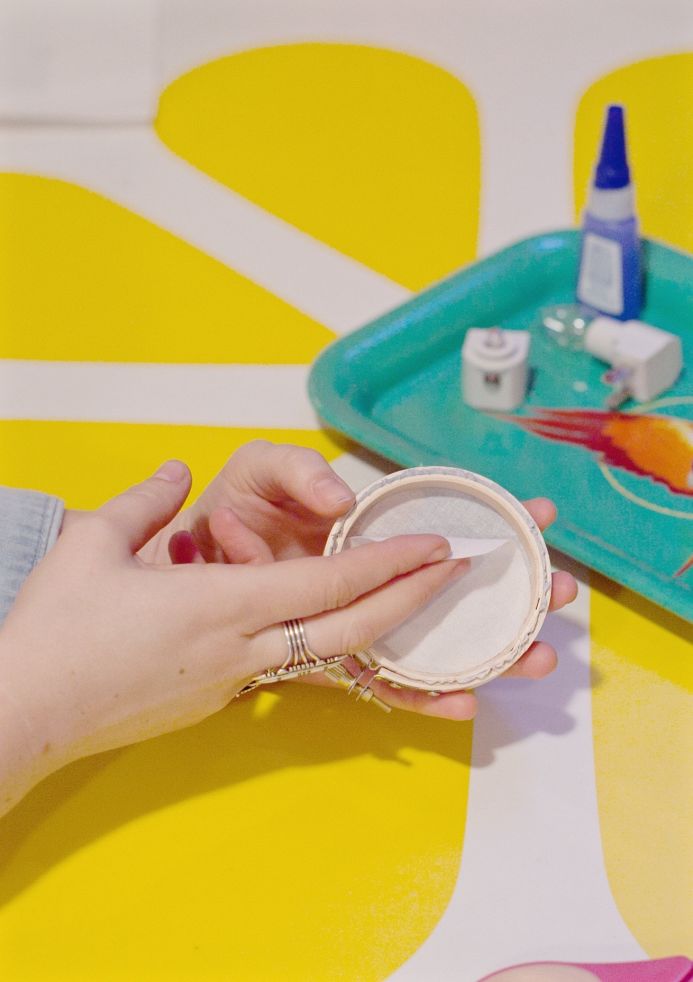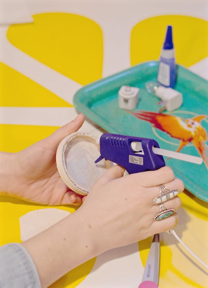 1. Place a thin line of hot glue on the inside of the hoop and then press a small, round muslin fabric against the backside. This will help the light come in much smoother.