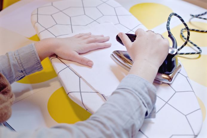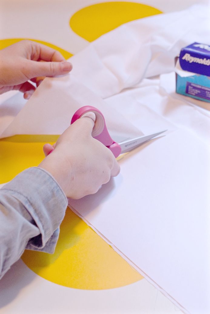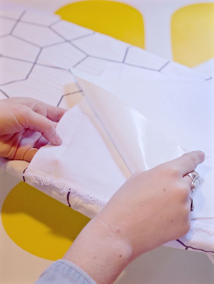 1. Place the muslin against the sheer, waxy side of the freezer paper. The sheer side is the one that adheres to things. With your iron on a high setting, slowly run it over the muslin fabric. Start from a corner and push out while you iron or else air bubbles will be caught between the muslin and freezer paper. Don’t worry if you do get air bubbles, however, it doesn’t matter too much.