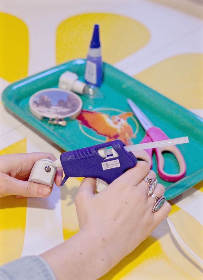 1. Remove the cover of the night light and place a glob of hot glue on the front. Make sure that your hoop is not blocking the daylight sensor (if there is one) and that it’s not too close to the light if you’re using Tungsten. Press the bottom of the hoop (where the screw fixture is) to the glue and hold for a minute.