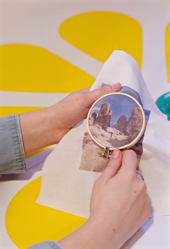 1. After your print has dried, peel the freezer paper off of the muslin. Secure the muslin inside your hoop, and make sure the screw fixture is on the bottom of the hoop. Pull it tight so that the print is taut. If you decided to paint your hoop make sure it’s very dry before putting the photo in.