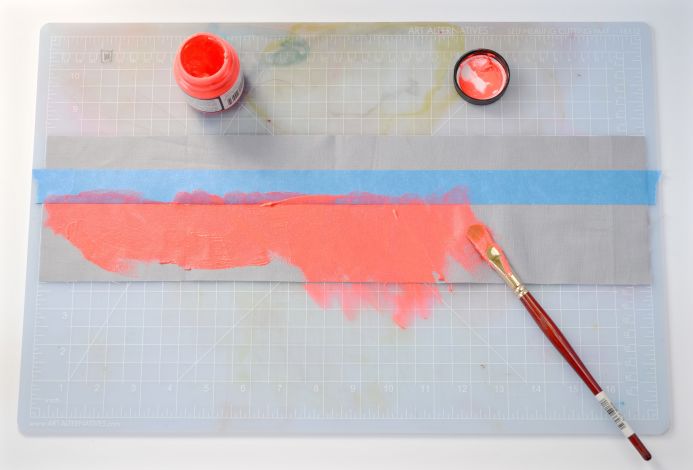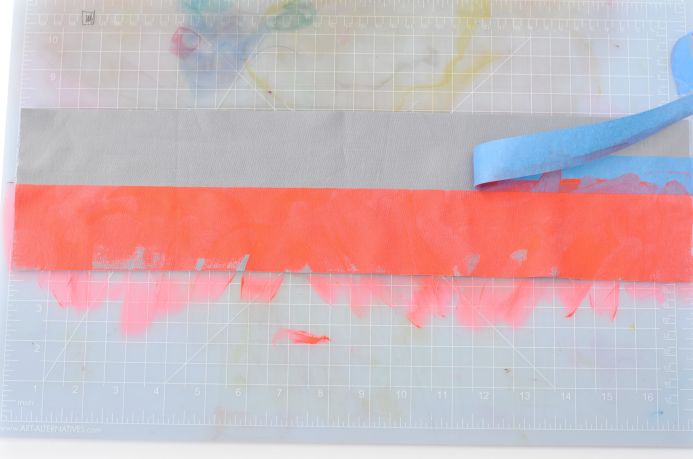 1. Paint fabric: Carefully place the painter’s tape first. I used the lines of my mat board surface to mark exactly two inches from the top of my grey rectangle. Apply paint generously! Get sloppy! Use a lot!