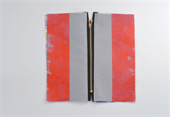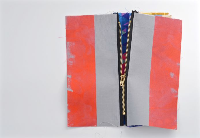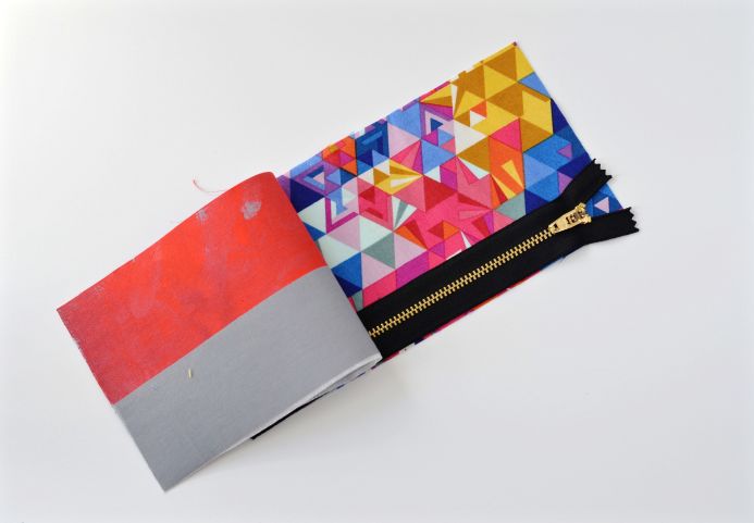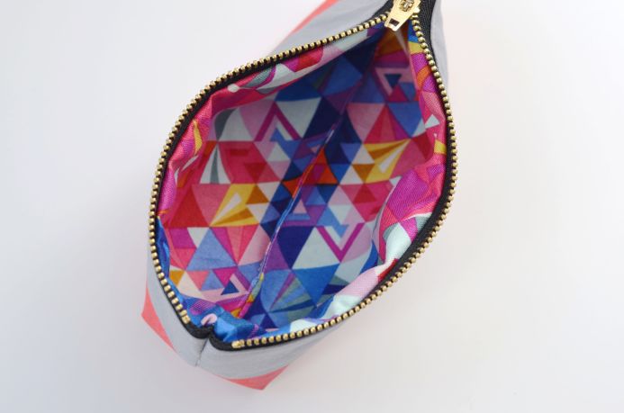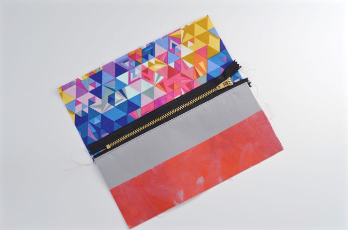 5. Sew on zipper: Make a sandwich with right sides together. Stick your zipper in there as the “meat” of the sandwich, making sure the tab side of zipper is facing the grey exterior fabric. Pin. Using your zipper foot attachment, sew along the edge. Fold the grey fabric over and top stitch, making sure the interior fabric stays out of the way.