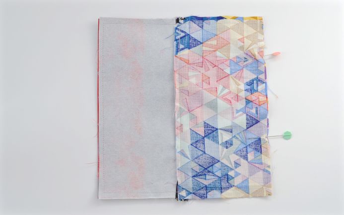 7. Place right sides together (grey-to-grey and geometric-to-geometric) and pin. Sew along the periphery, leaving a 3 inch gap at the bottom edge of the interior fabric, as shown in the photo with pins.
