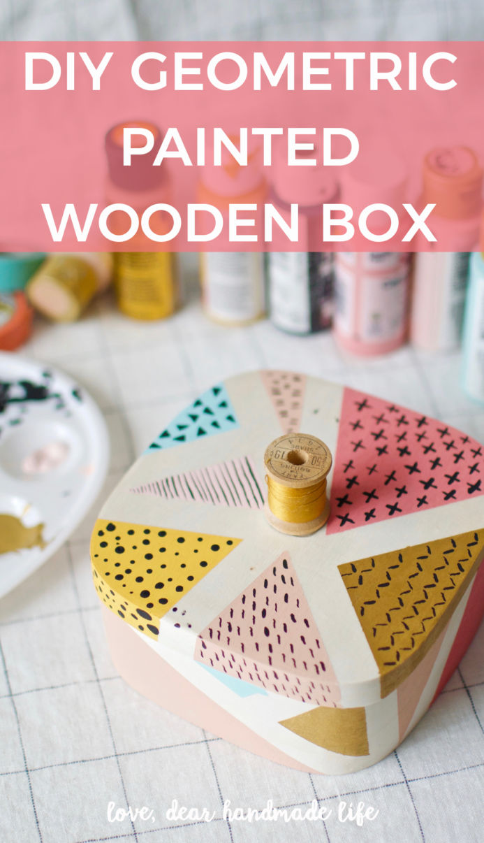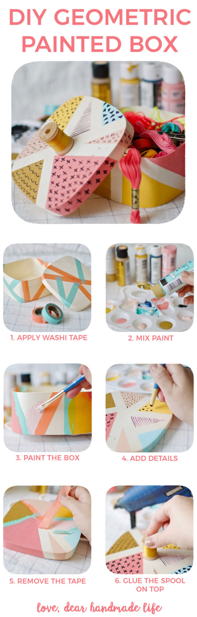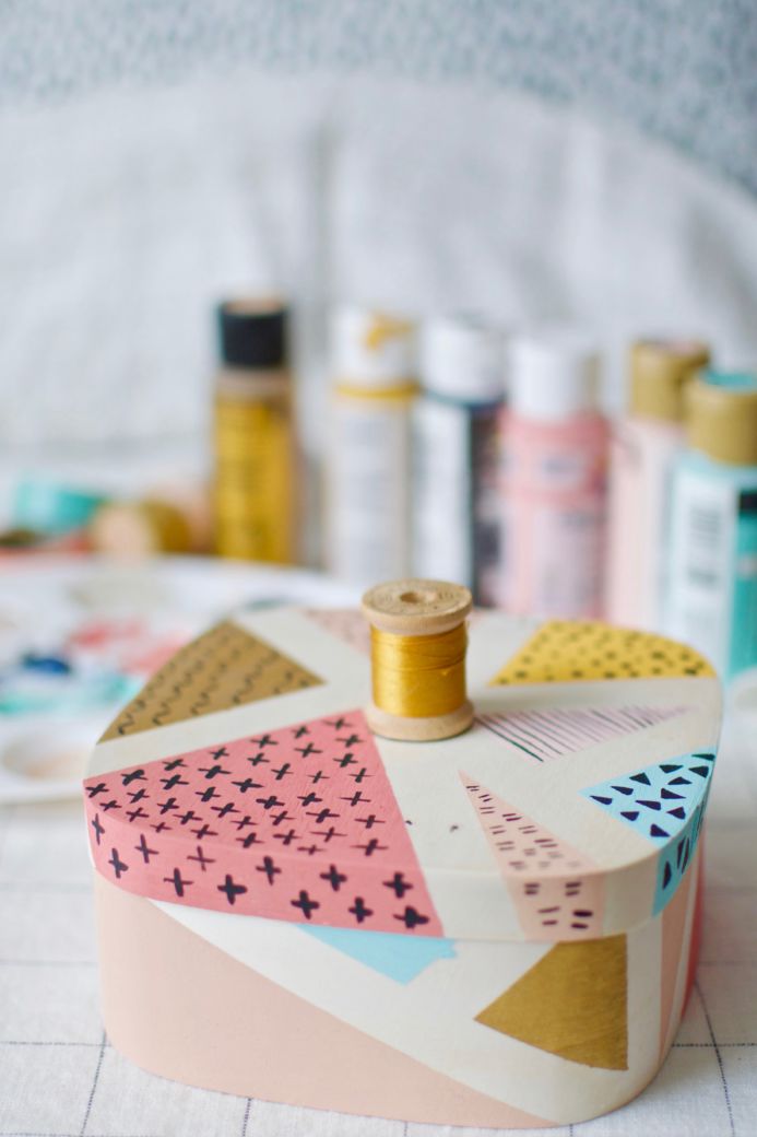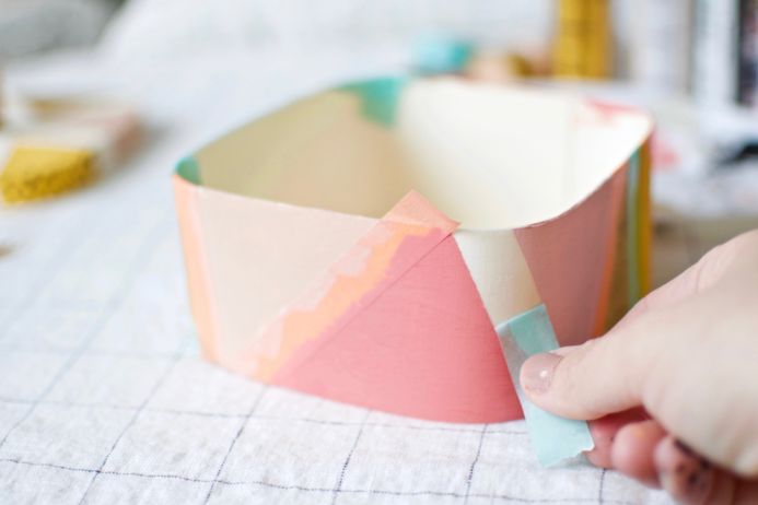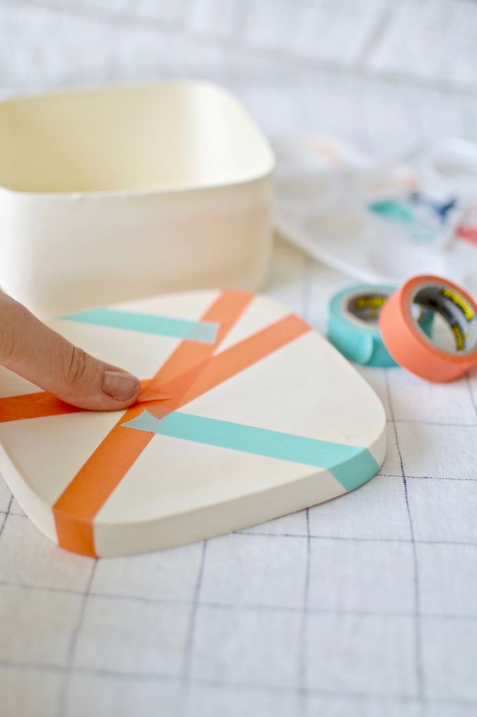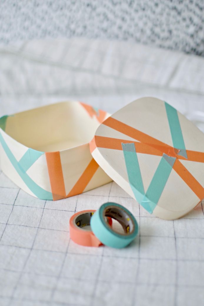 1. Apply washi tape to the box in as many random geometric shapes as you’d like, keeping in mind that what you cover up with the tape will be left natural.Â