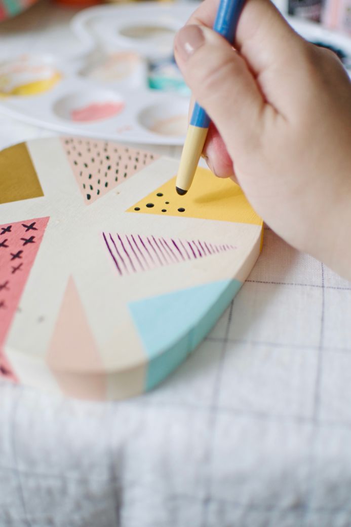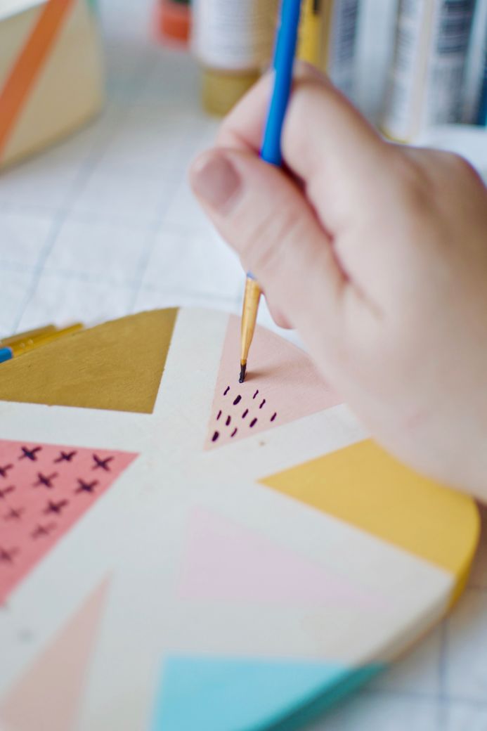 3. Wait until the paint is completely dry (this shouldn’t take long). I painted the top first and by the time I finished painting the base the top was dry enough to add detail. *Optional for even more flair: using a small fine tip brush you can make little markings, x’s, fine lines etc. I used a small flat brush to lightly dab for little lines & the end of a bigger brush to make little circles.Â