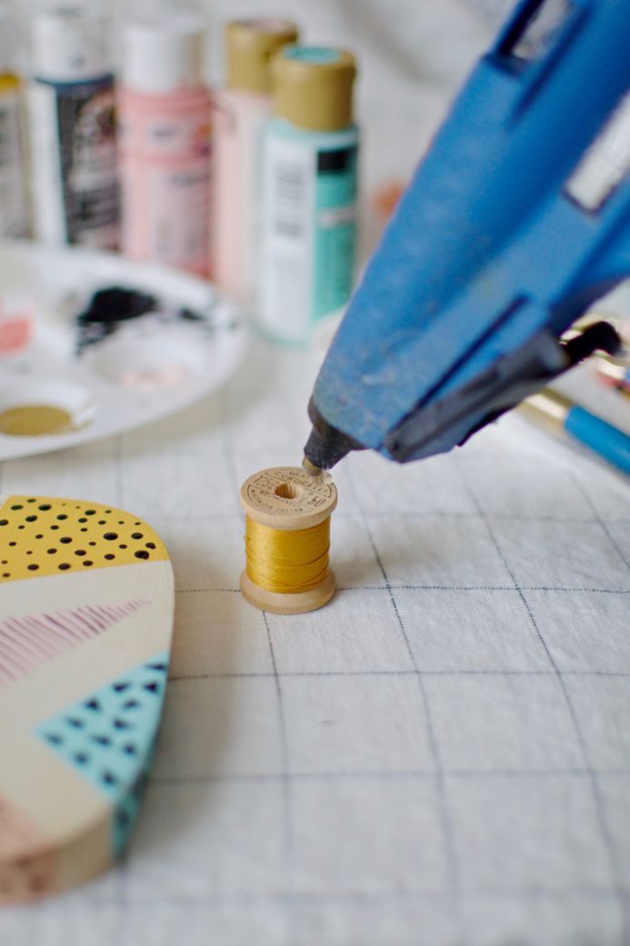 -Found object for knob, I used a vintage wooden spool of thread (you can get one here). Other suggestions: small plastic dinosaur toy, rough cut crystal/gem, old cabinet drawer pull, sea shell etc. the possibilities are endless! Â
